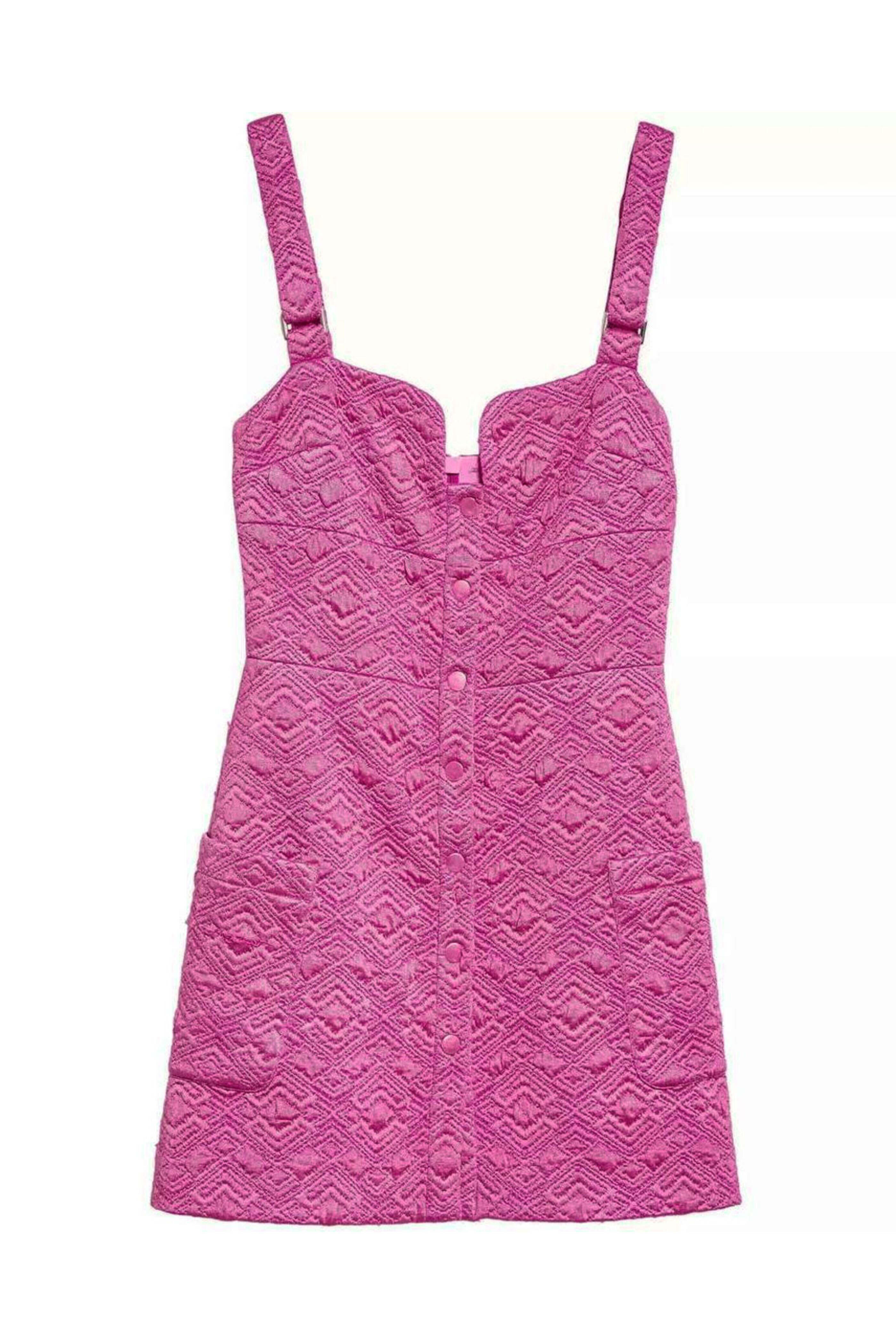 Alexis Fuchsia Aurelie Mini Dress. Sweetheart neck. Sleeveless; thick adjustable shoulder straps. Concealed back zip closure. Slim silhouette. Front snap button placket. Hip patch pockets. Mini length. Lined. 51% nylon, 47% viscose, 2% elastane.
