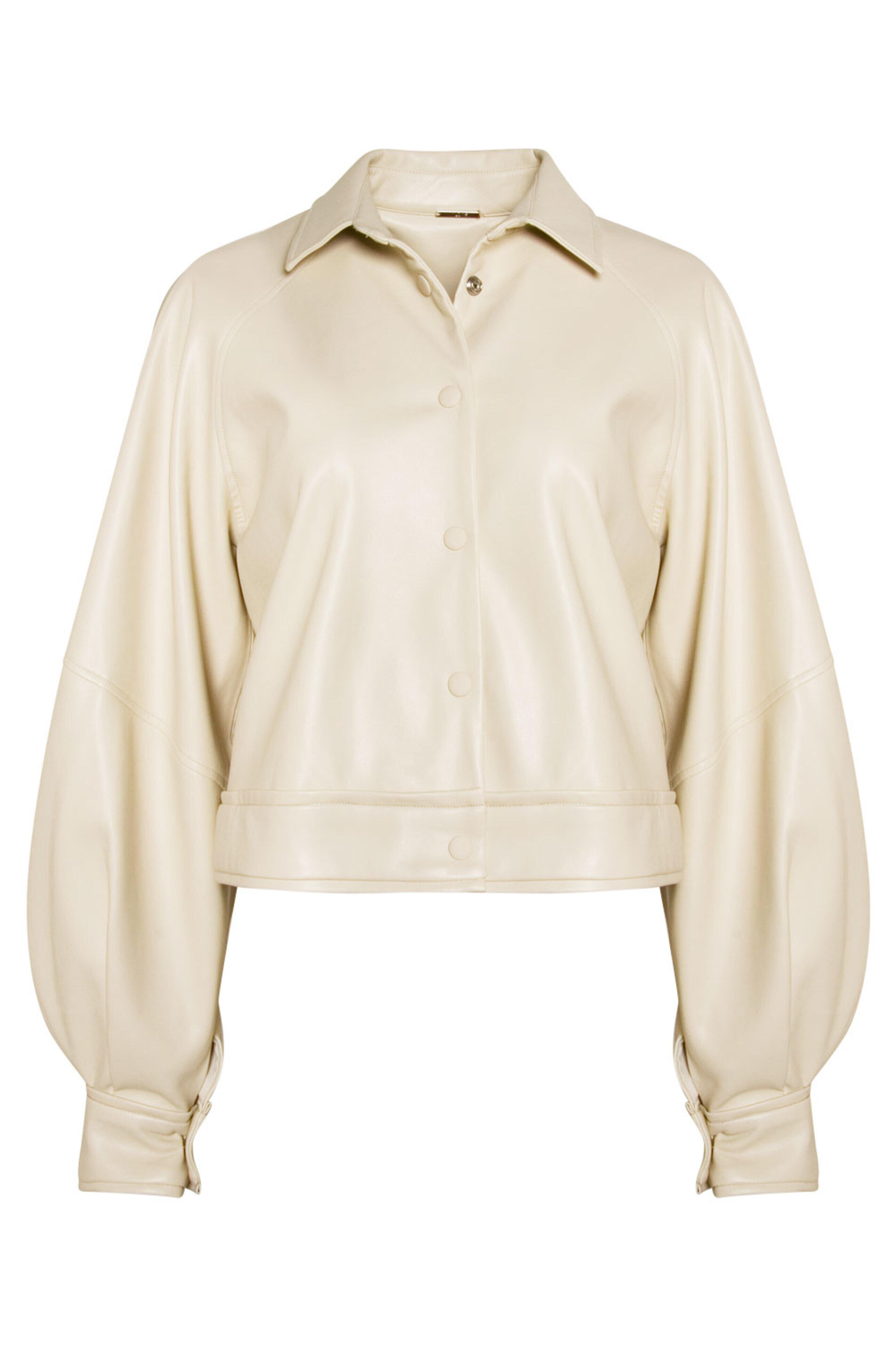 Alexis Cream Ceci Jacket. Pointed collar. Long raglan sleeves; button cuffs. Seam detail at elbow. Snap button up front. Boxy silhouette. Relaxed fit. Lined. 100% Polyester.