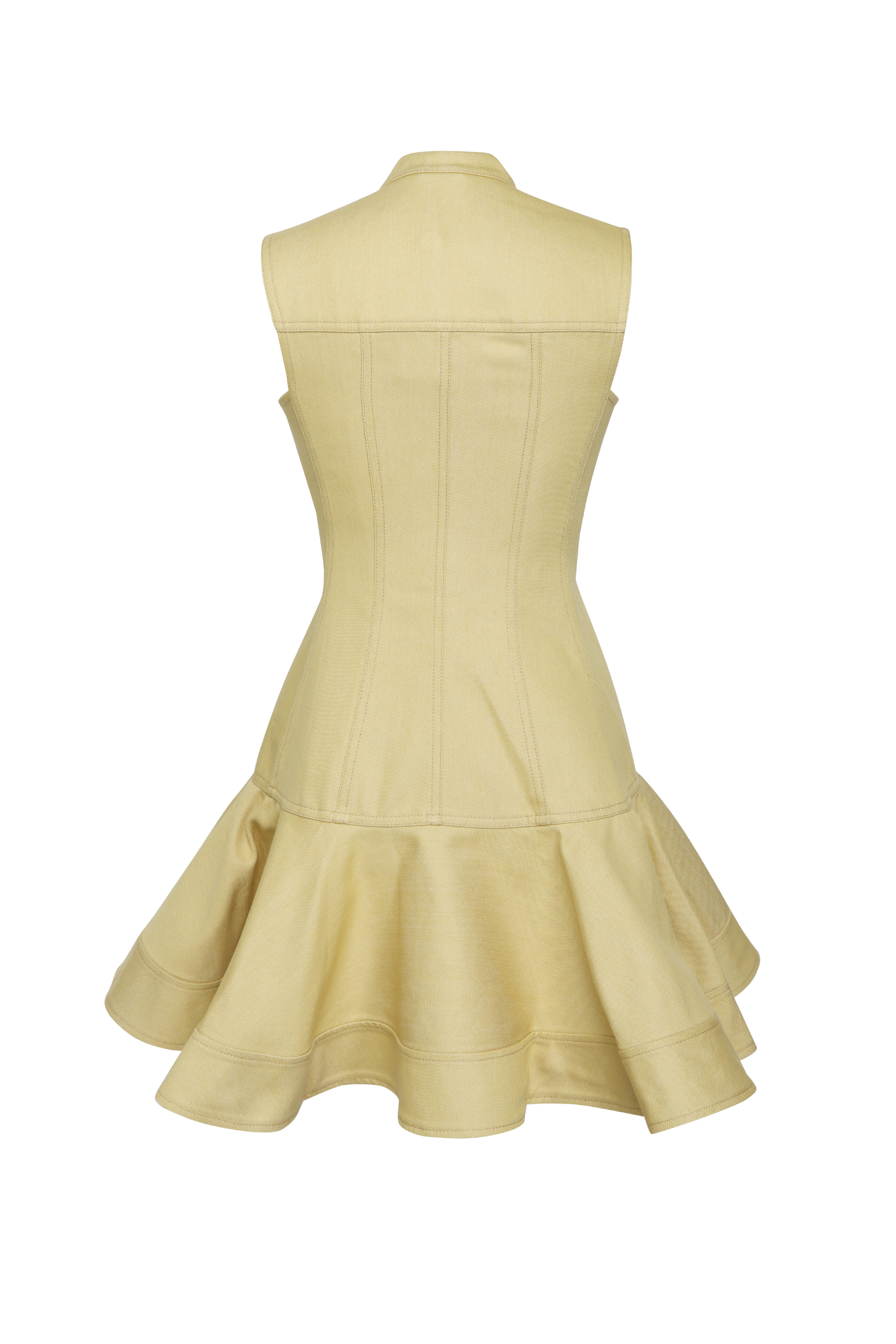 Stand collar. Sleeveless. Front zip closure. Slim silhouette. Flounce hem. Imported. Mini length. 67% cotton, 33% polyester. Dry clean.