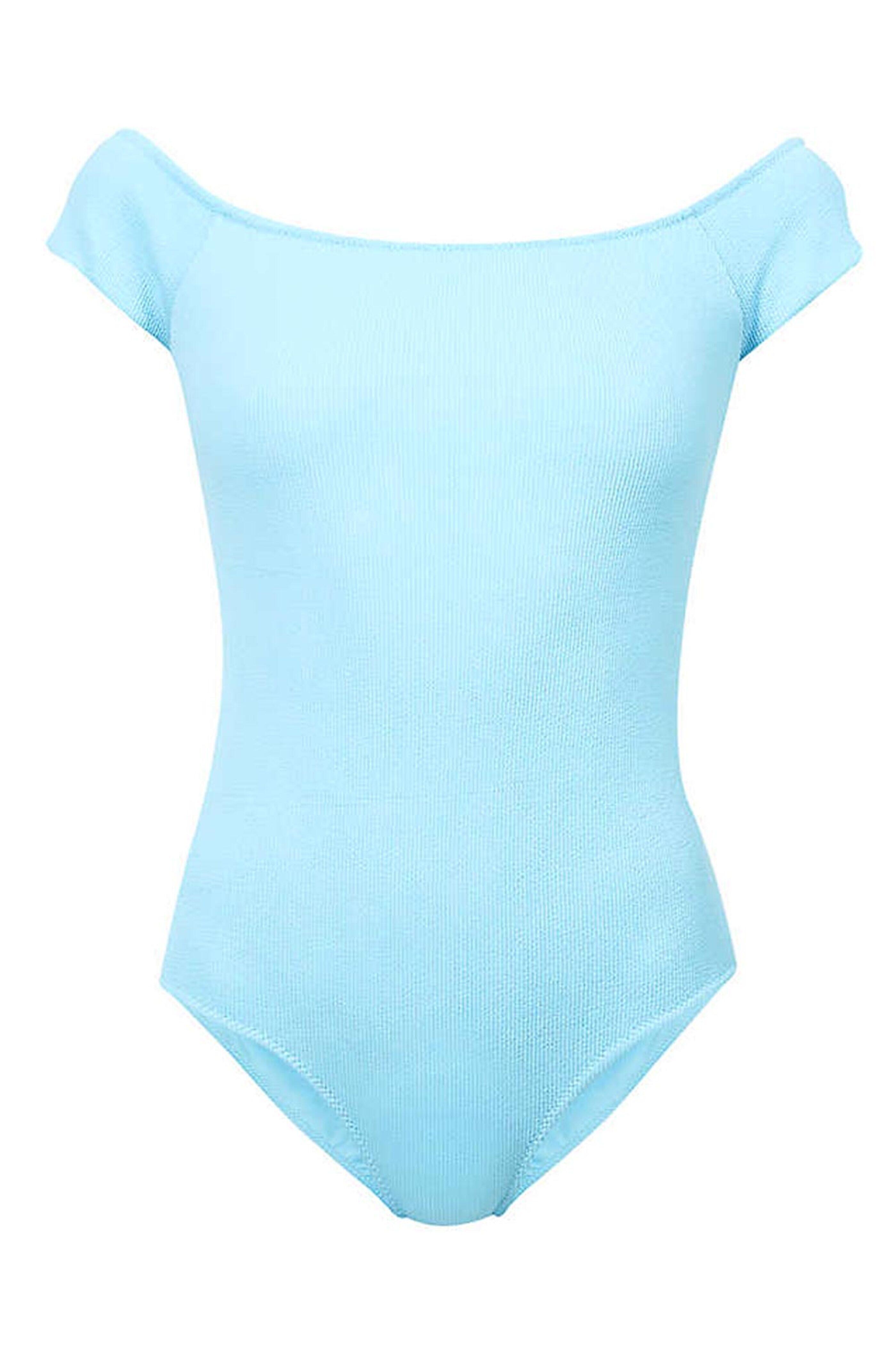 - Ganni Bachelor Blue Off the Shoulder One Piece Swimsuit Off the shoulder neckline Short sleeves Ribbed throughout Lined 92% recycled polyamide~ 8% elastane~ 92% polyester~ 8% elastane lining