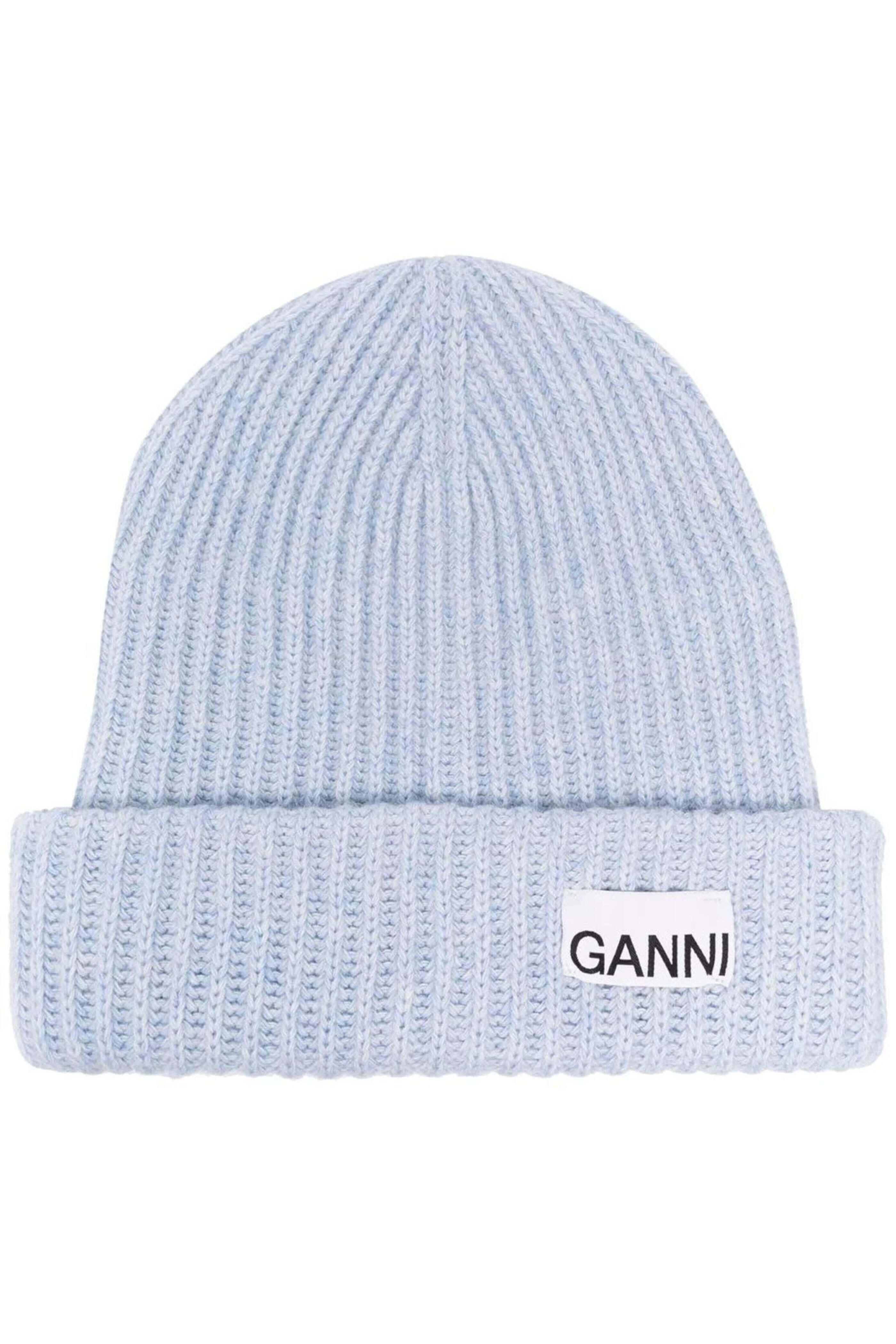 Ganni Logo Patch Beanie in Heather Blue. Ribbed knit. Front logo patch. Turn up brim. Unlined. Made in Italy. 70% wool, 25& polyamide, 5% other materials.