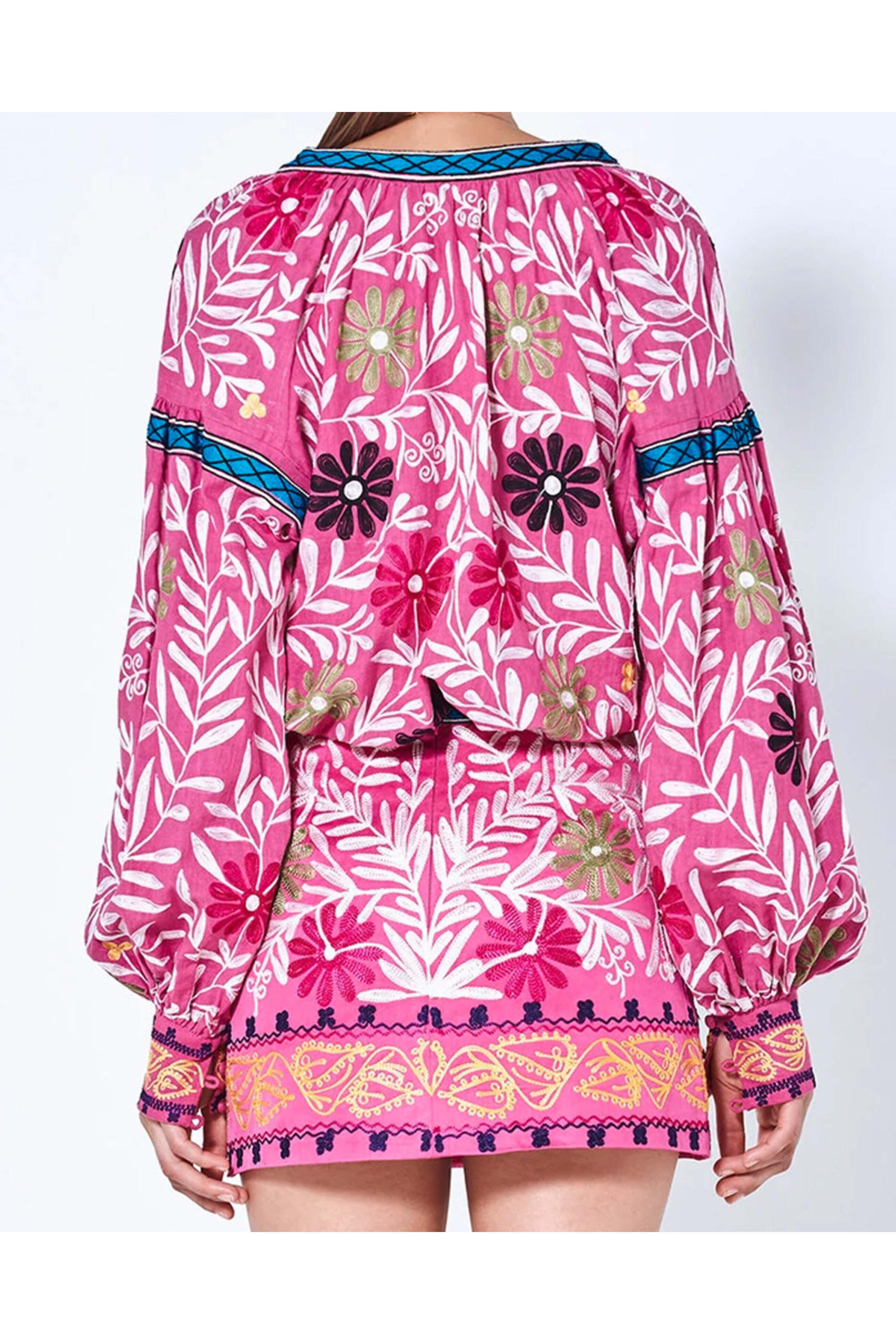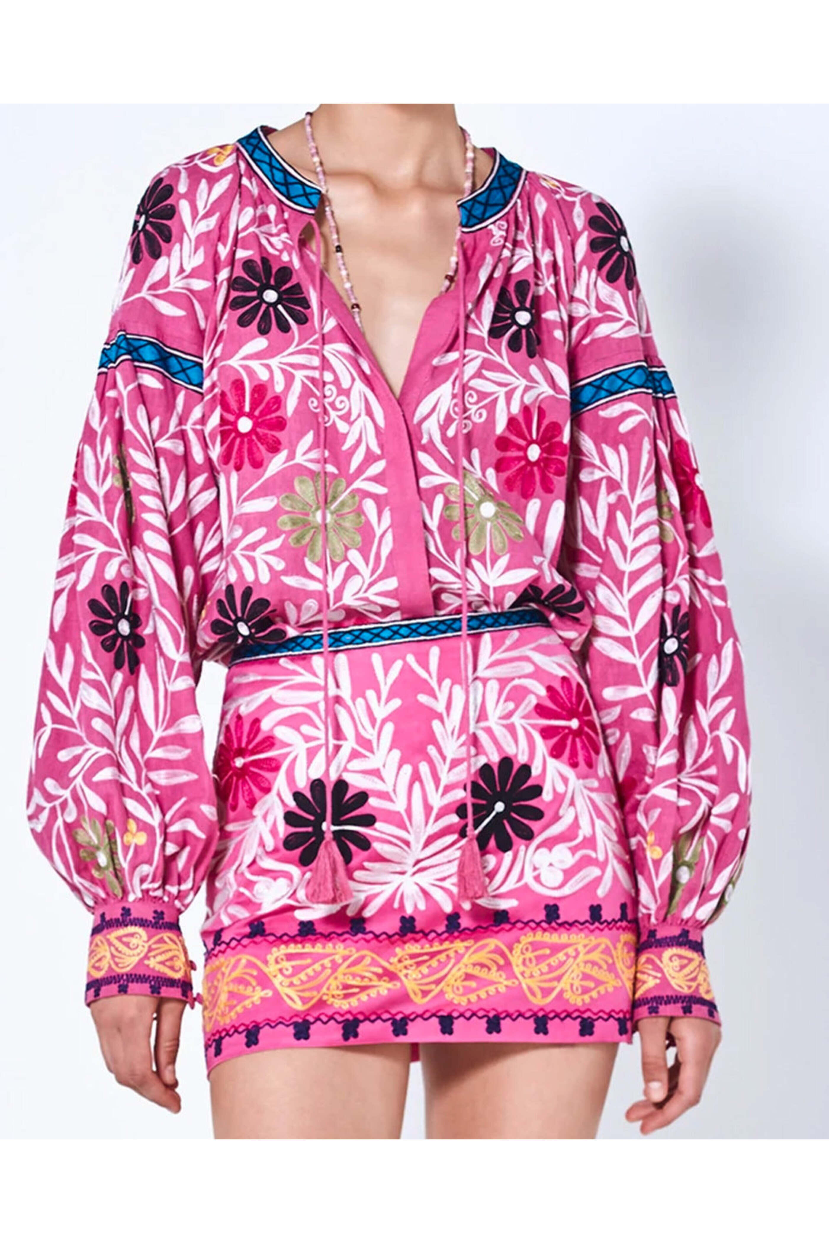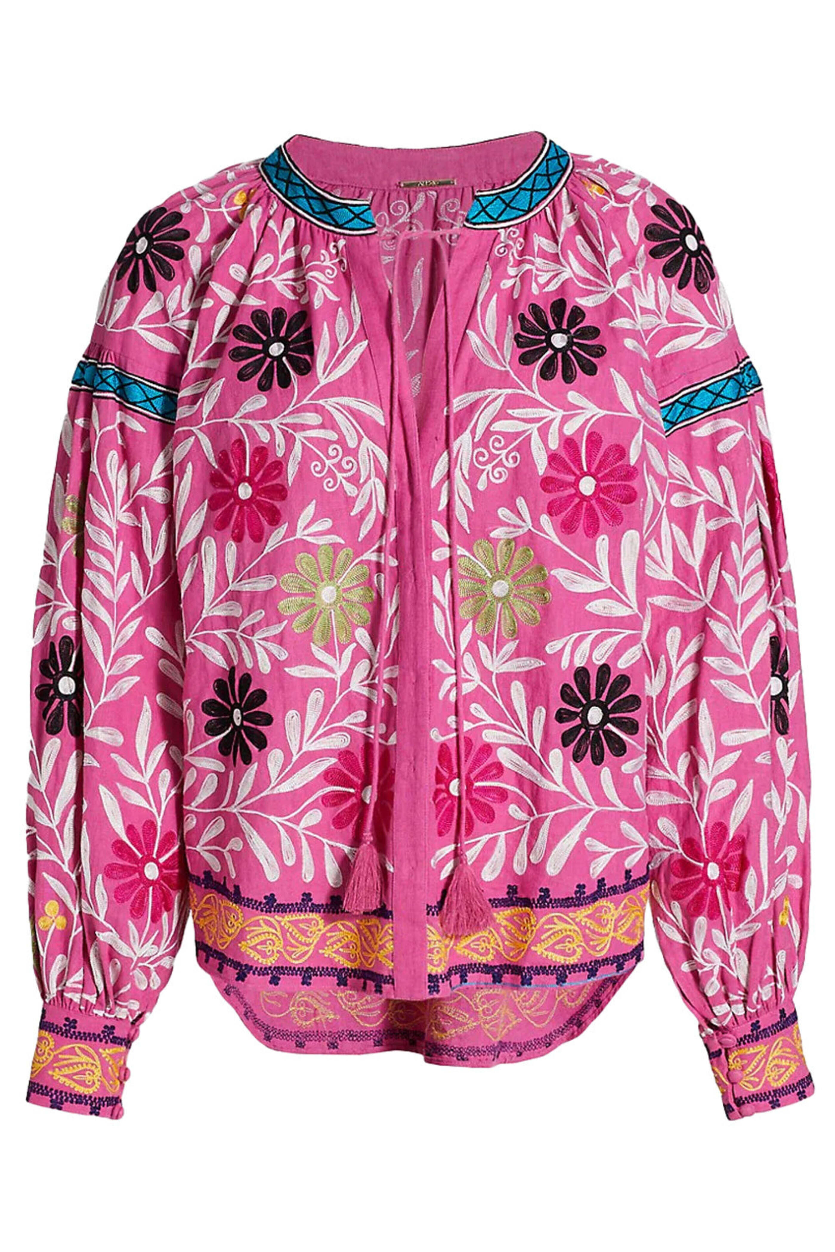 Alexis Aurora Pink Paulaine Top. Split neckline; tassel trims. Oversized blouson sleeves. Button down. Shirttail hem. Relaxed fit. 100% cotton.