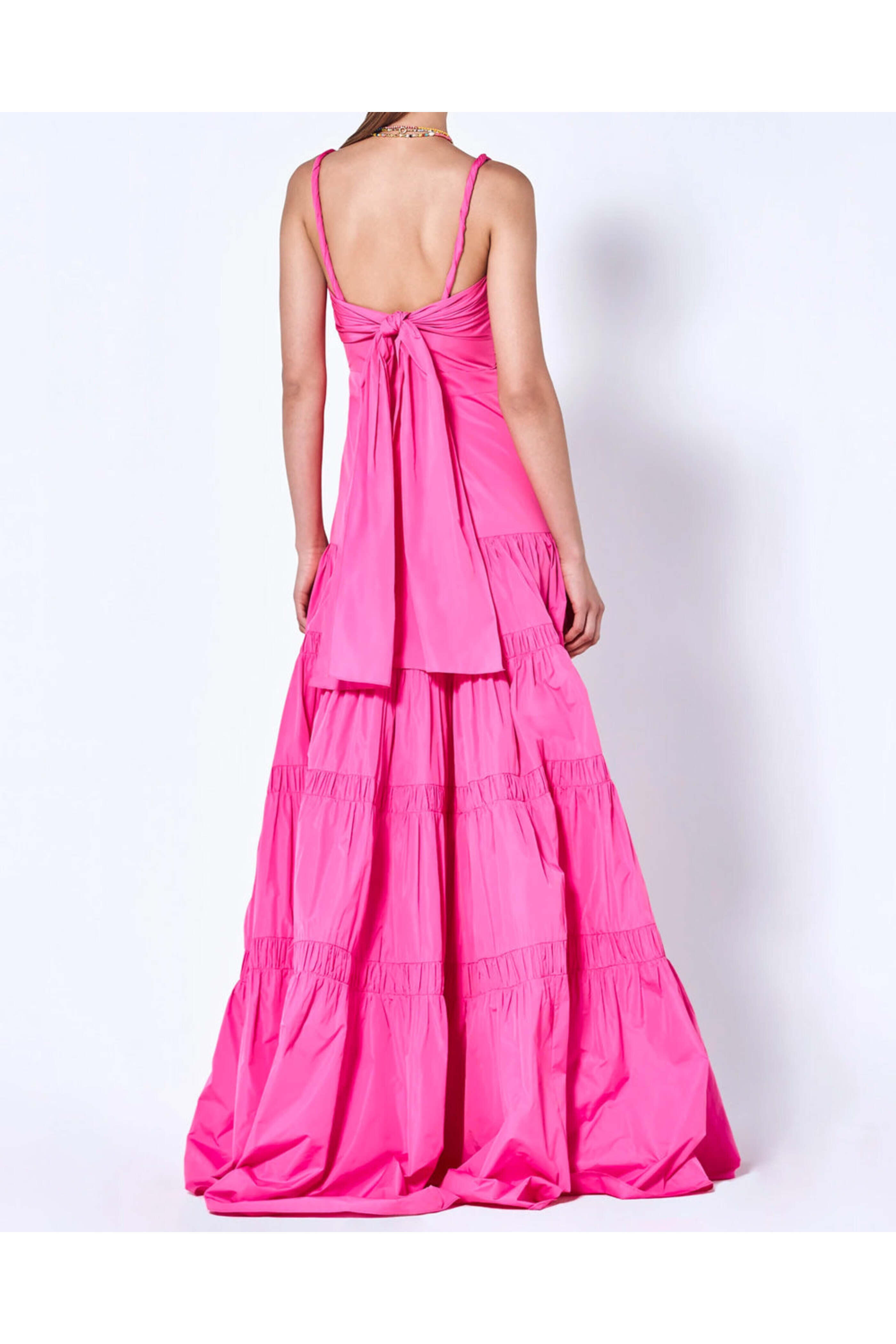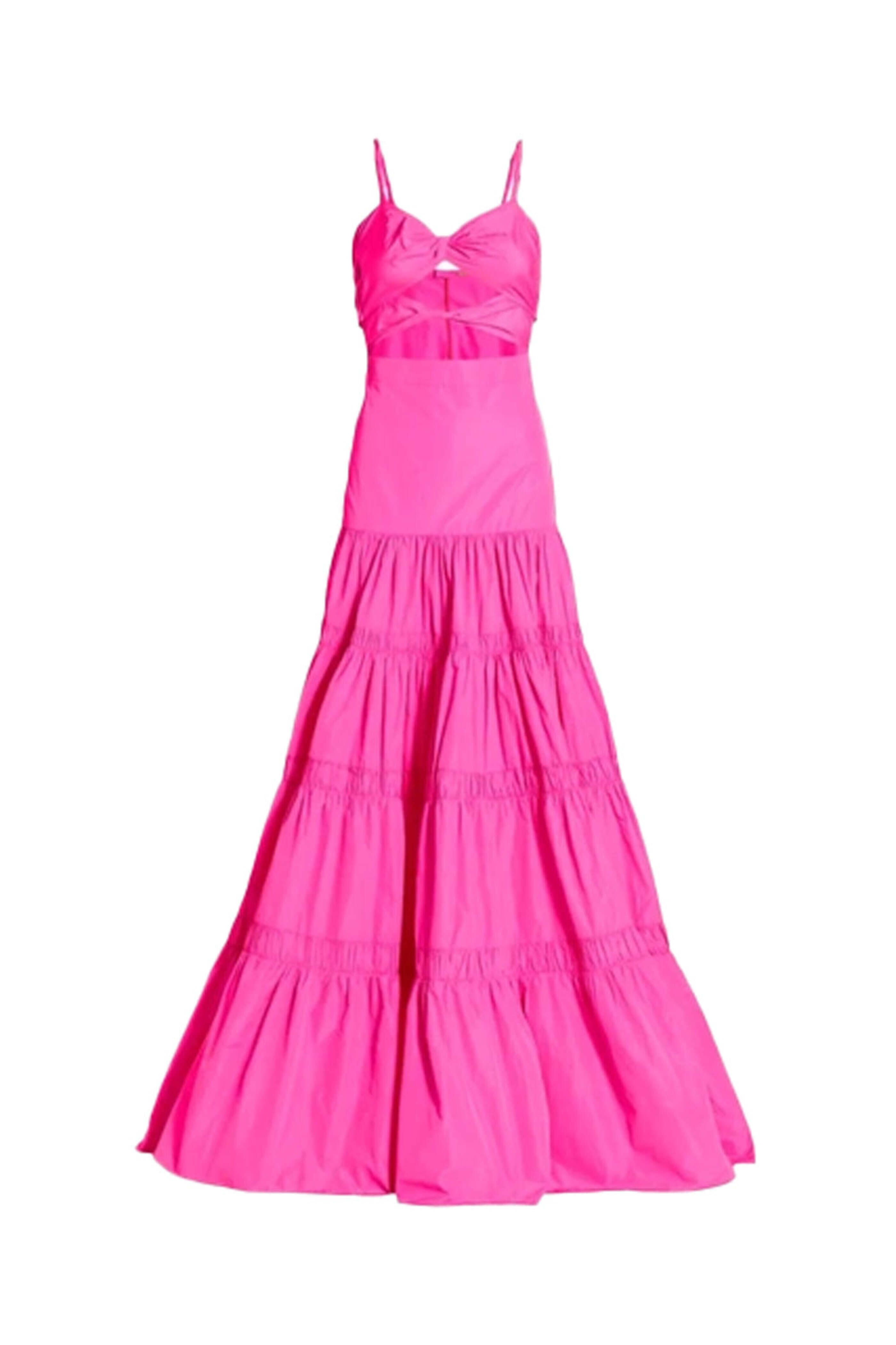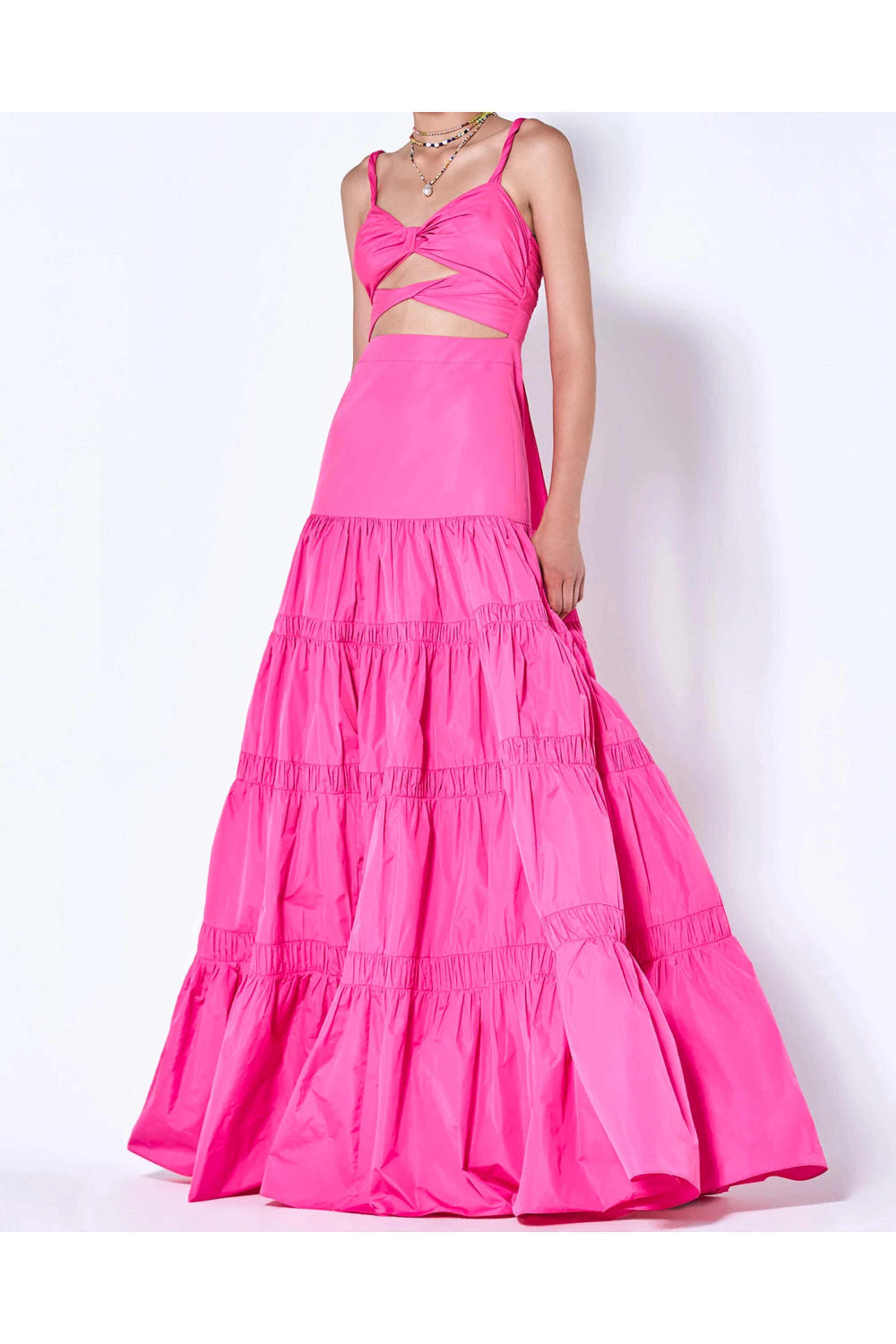 Alexis Magenta Azalea Dress. Twist cutout bodice. Twist shoulder straps. Hidden back zipper. Back tie detail. Maxi dress; tiered skirt. Partially lined. 100% polyester.