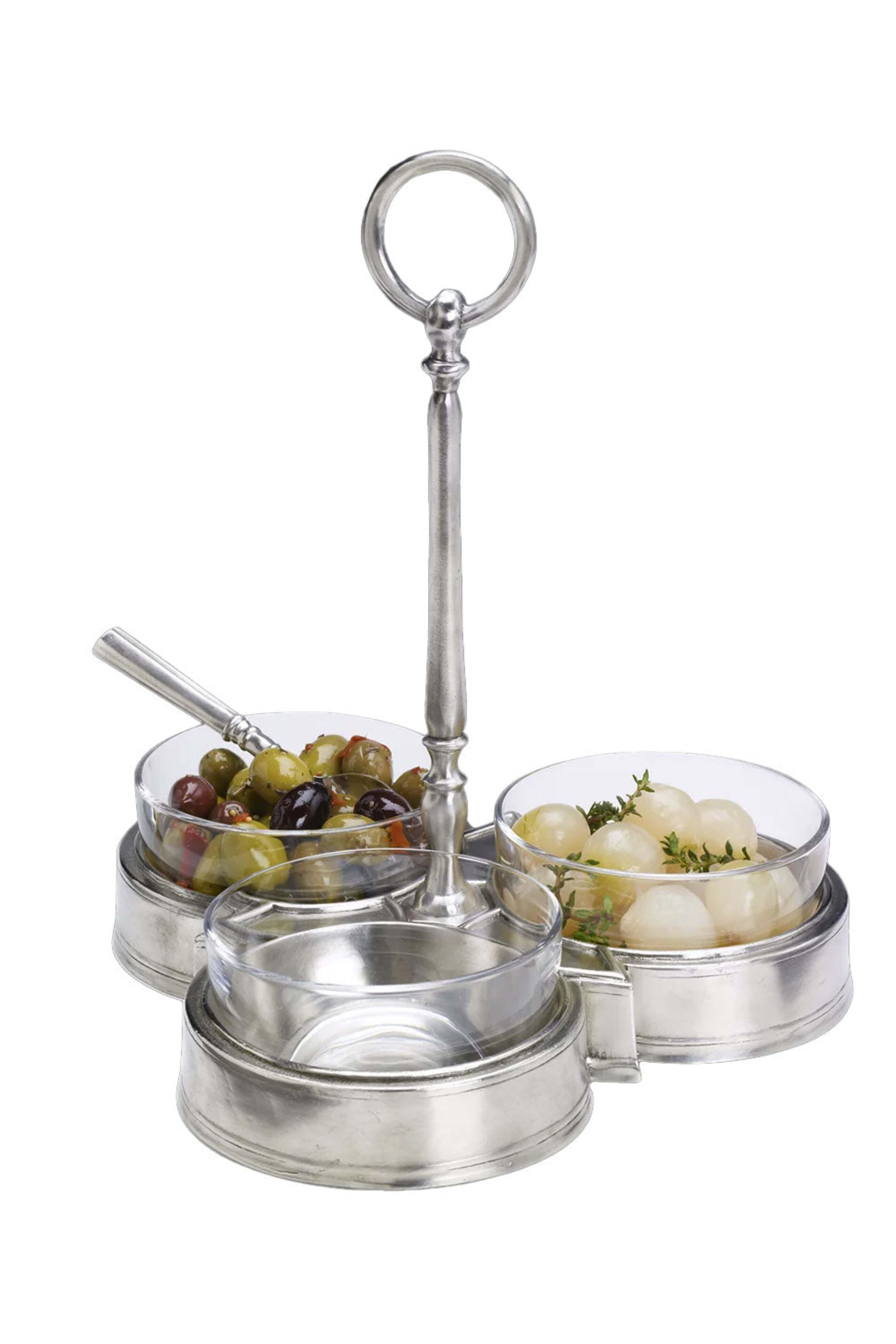 Match Crudité Trio. Artful blend of glass and pewter. This handled caddy is perfect for sharing sauces, dips, olives, or nuts. Spoon not included. Removeable glass inserts are dishwasher safe.