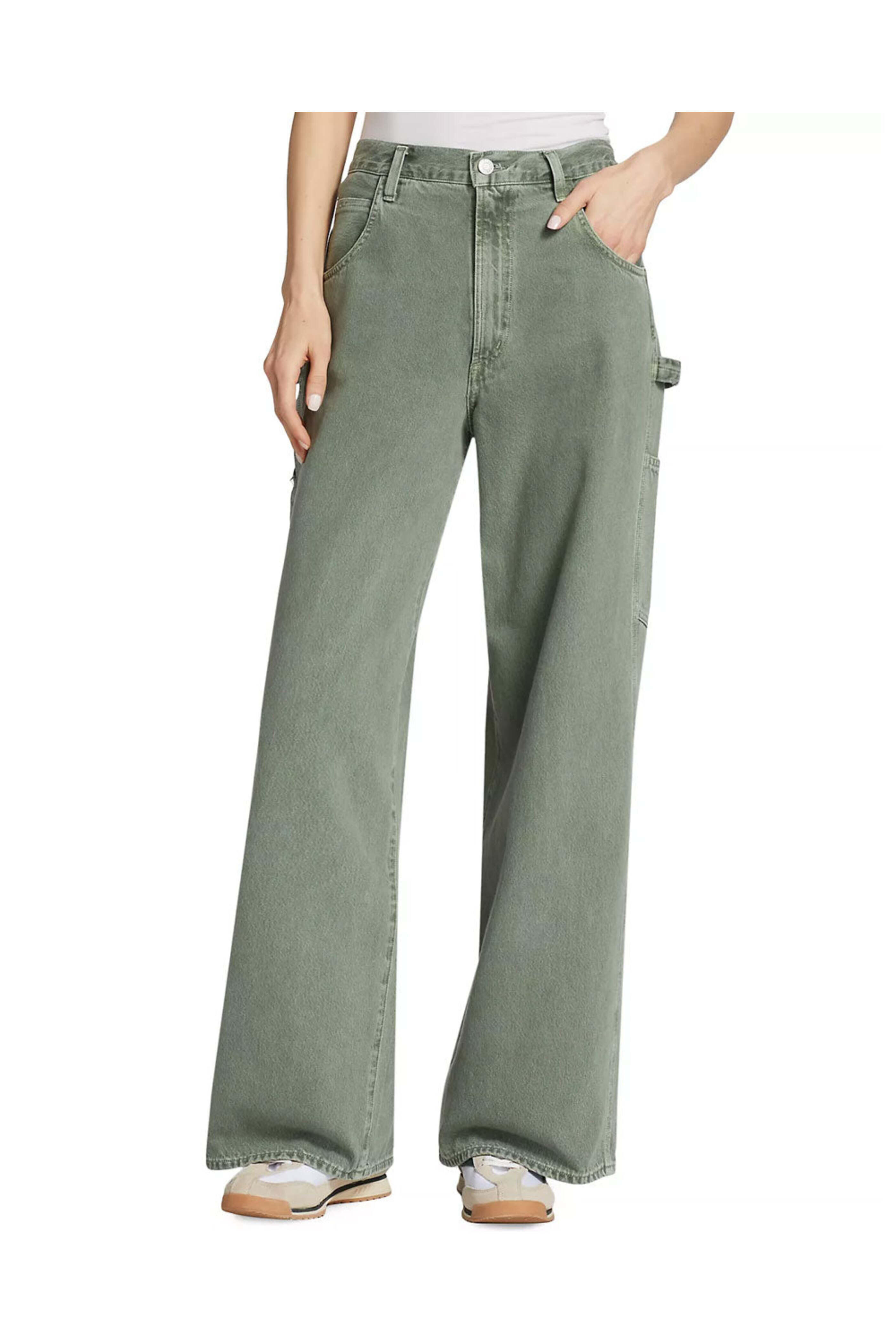 Agolde Magda Carpenter Jean in Salamander. Mid rise. Button closure. Zip fly. Belt loops and side loops. Front pockets and side pockets. Straight leg. Full length. Relaxed fit. 100% organic cotton.