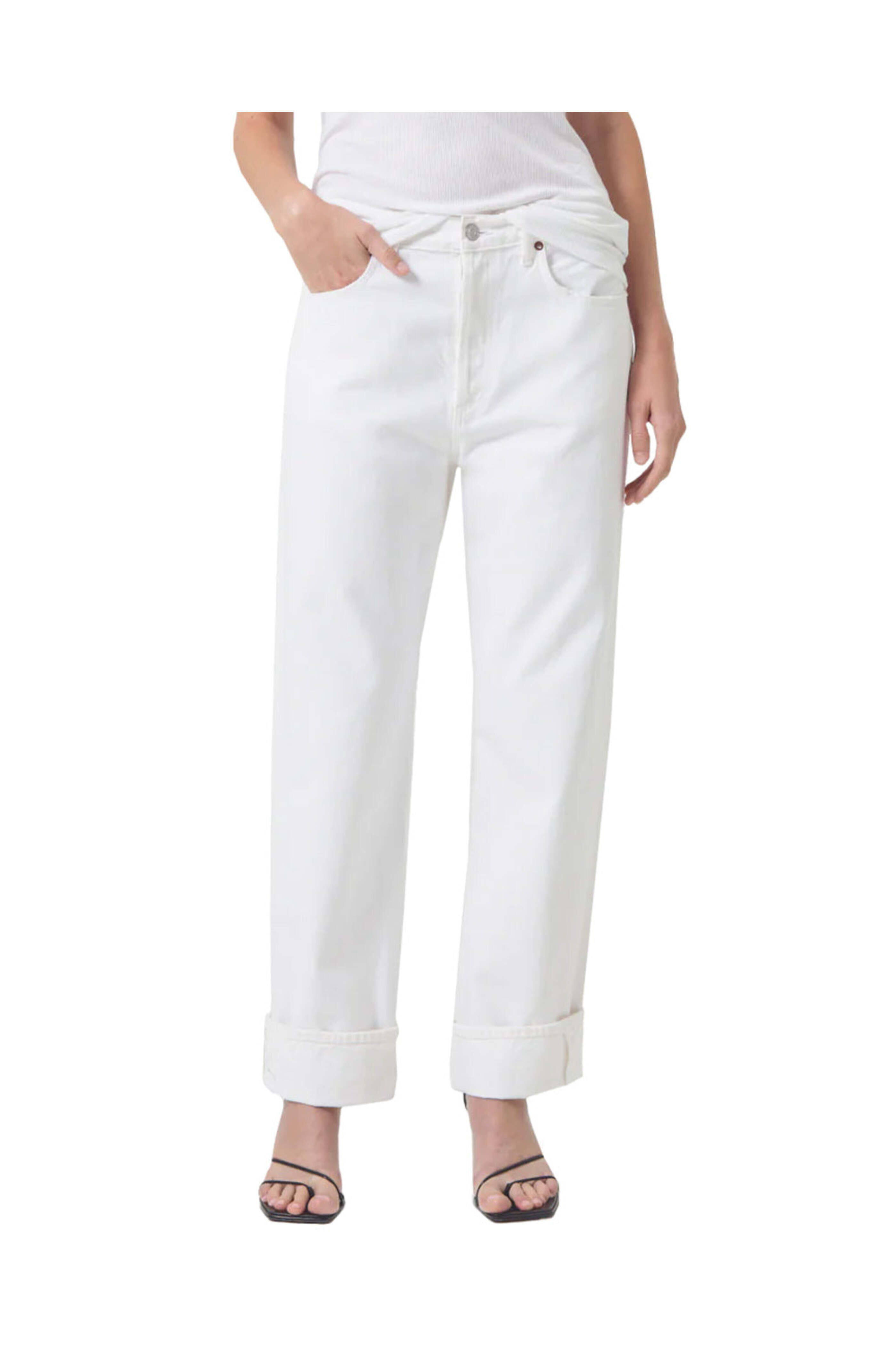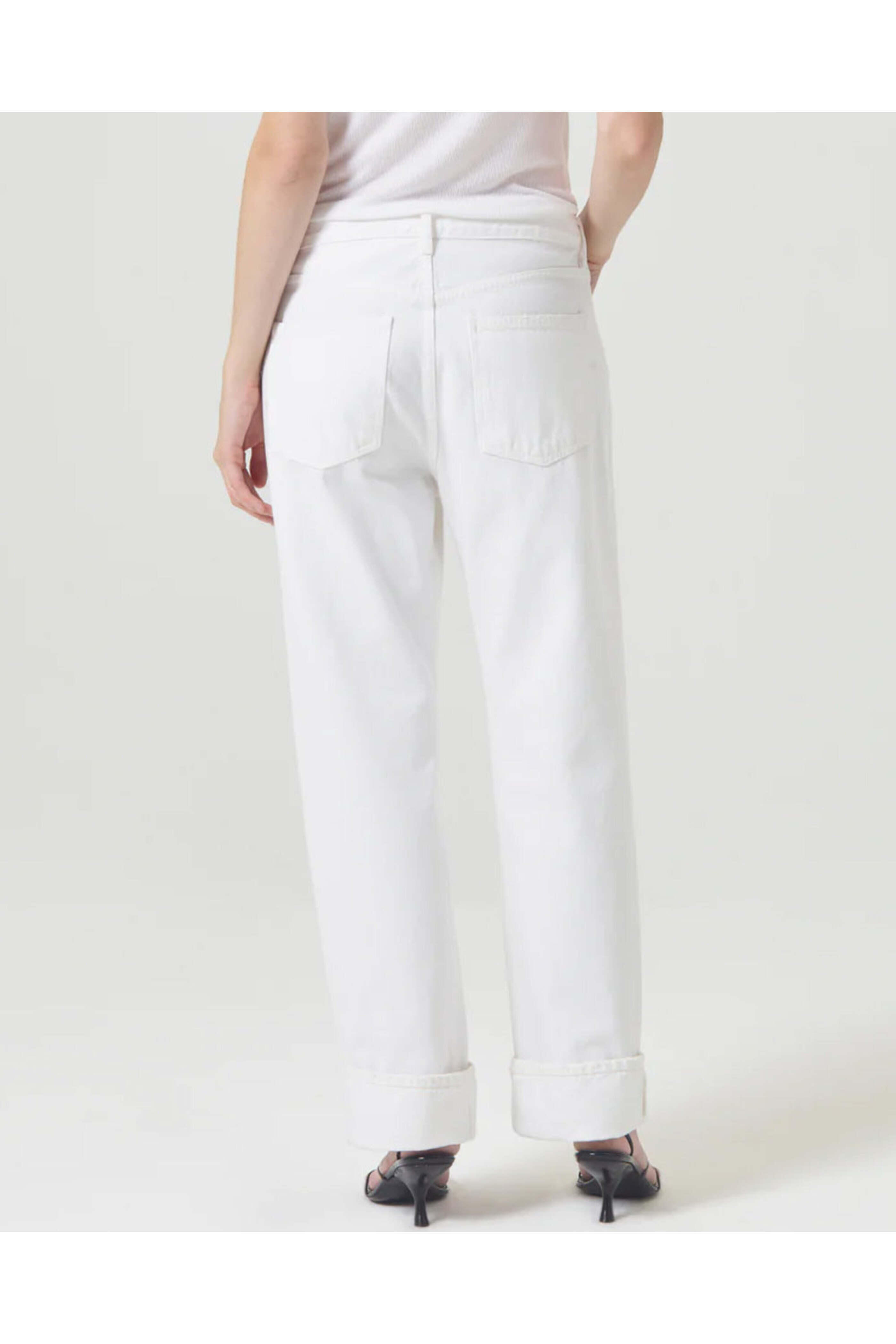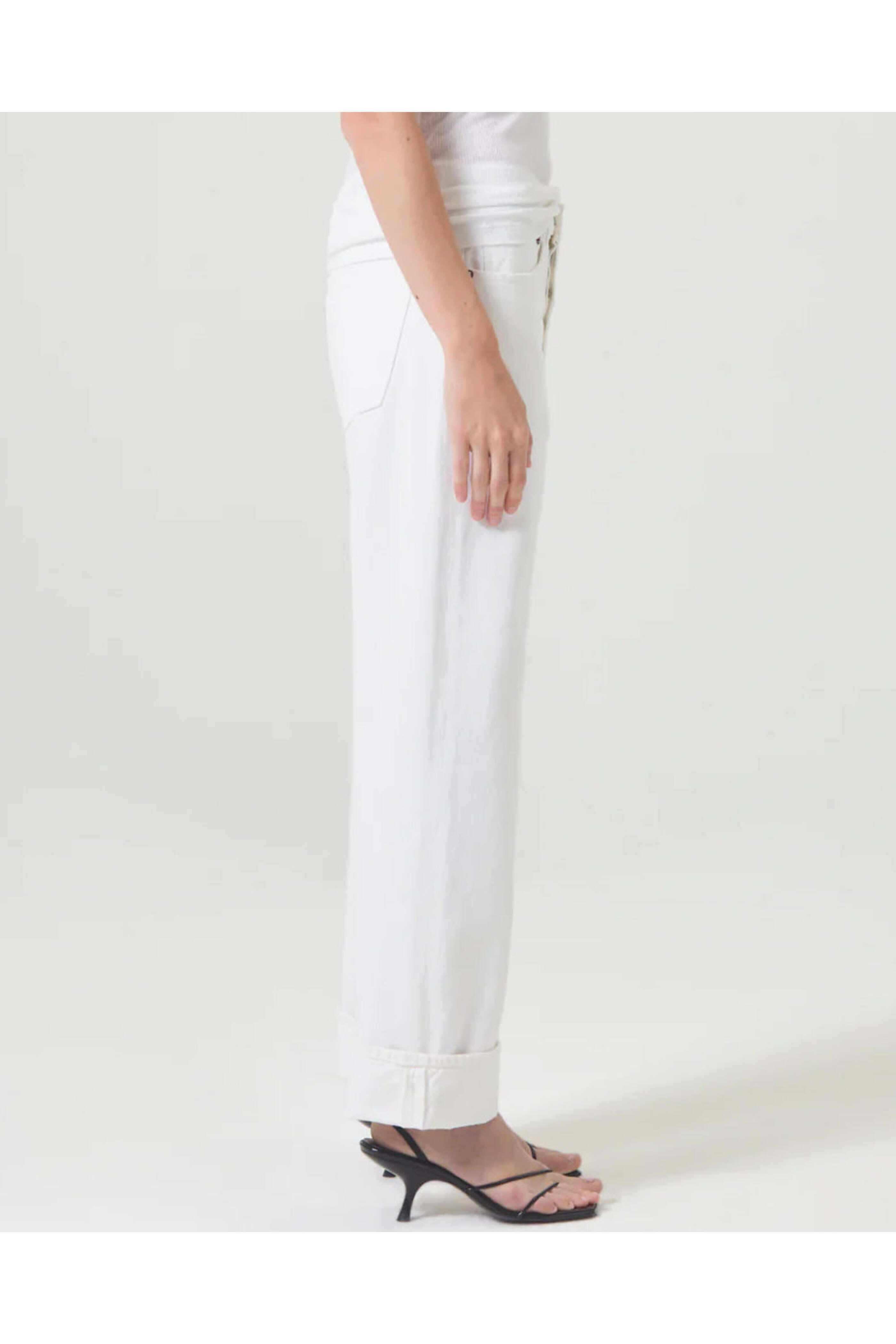 Agolde Fran Low Slung Straight Jean in Milkshake. Low rise. Button fly closure. Belt loops. Five pocket style. Straight silhouette. Relaxed fit. Folded cuffs. Ankle length. Nonstretch denim fabrication. 100% organic cotton.