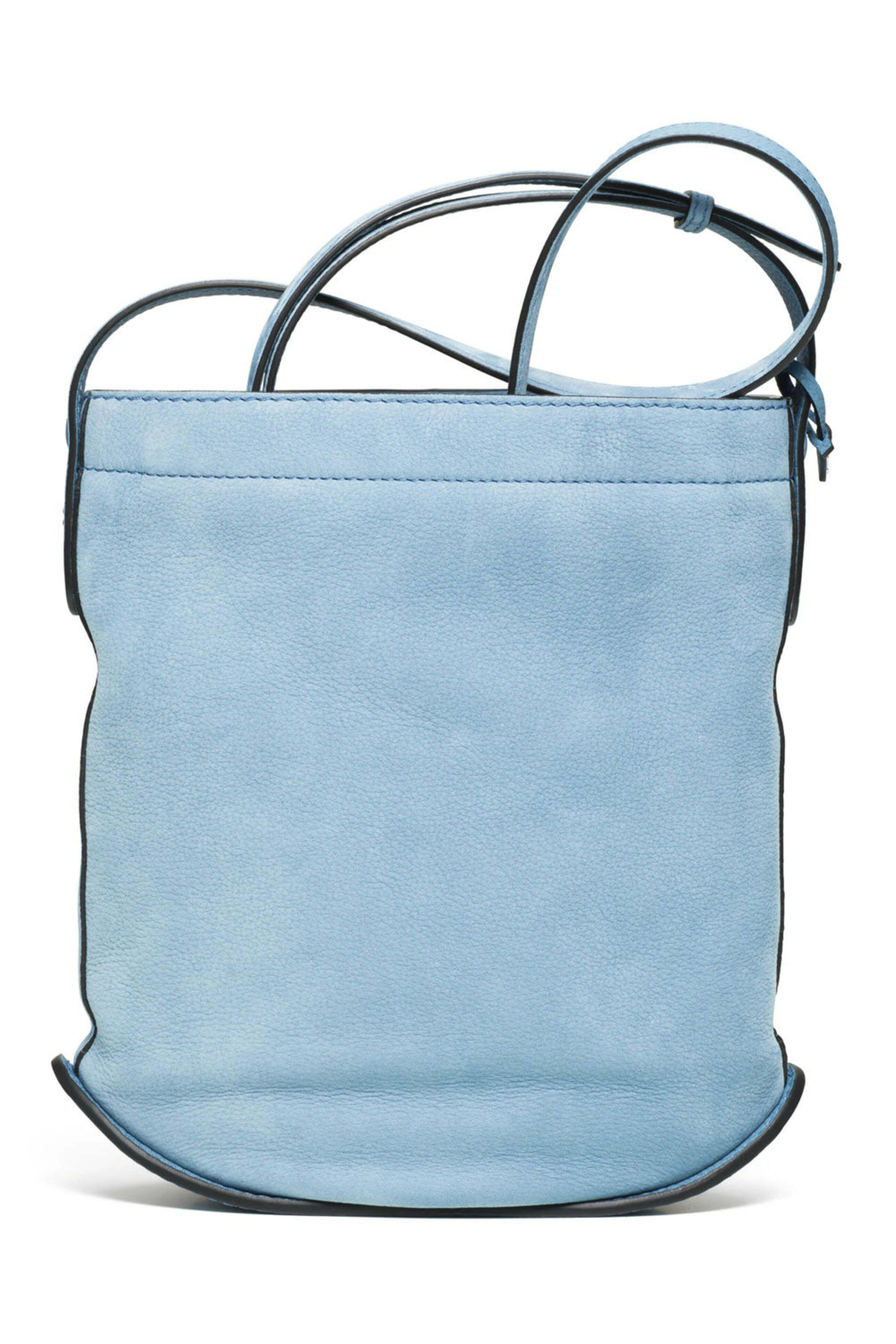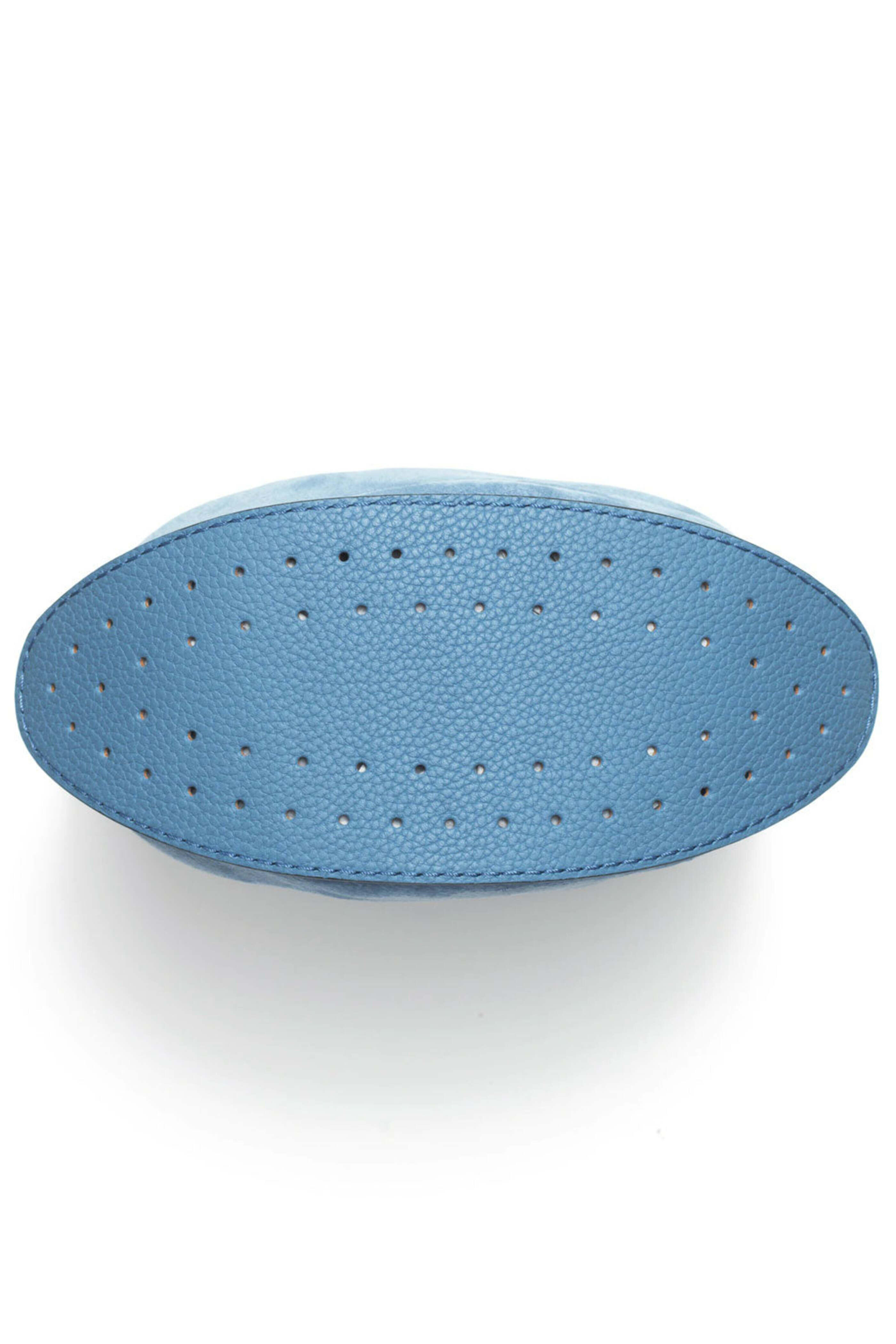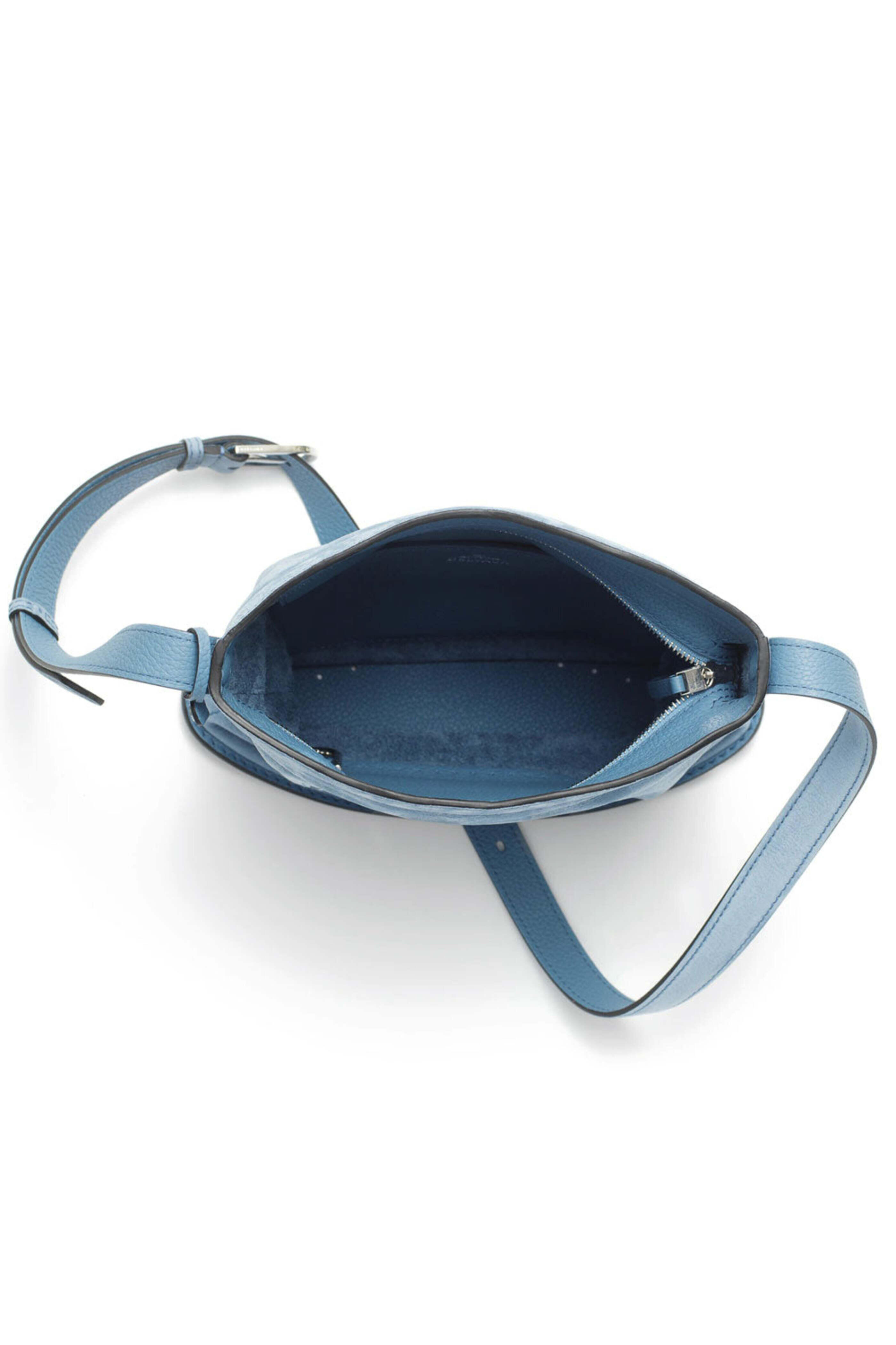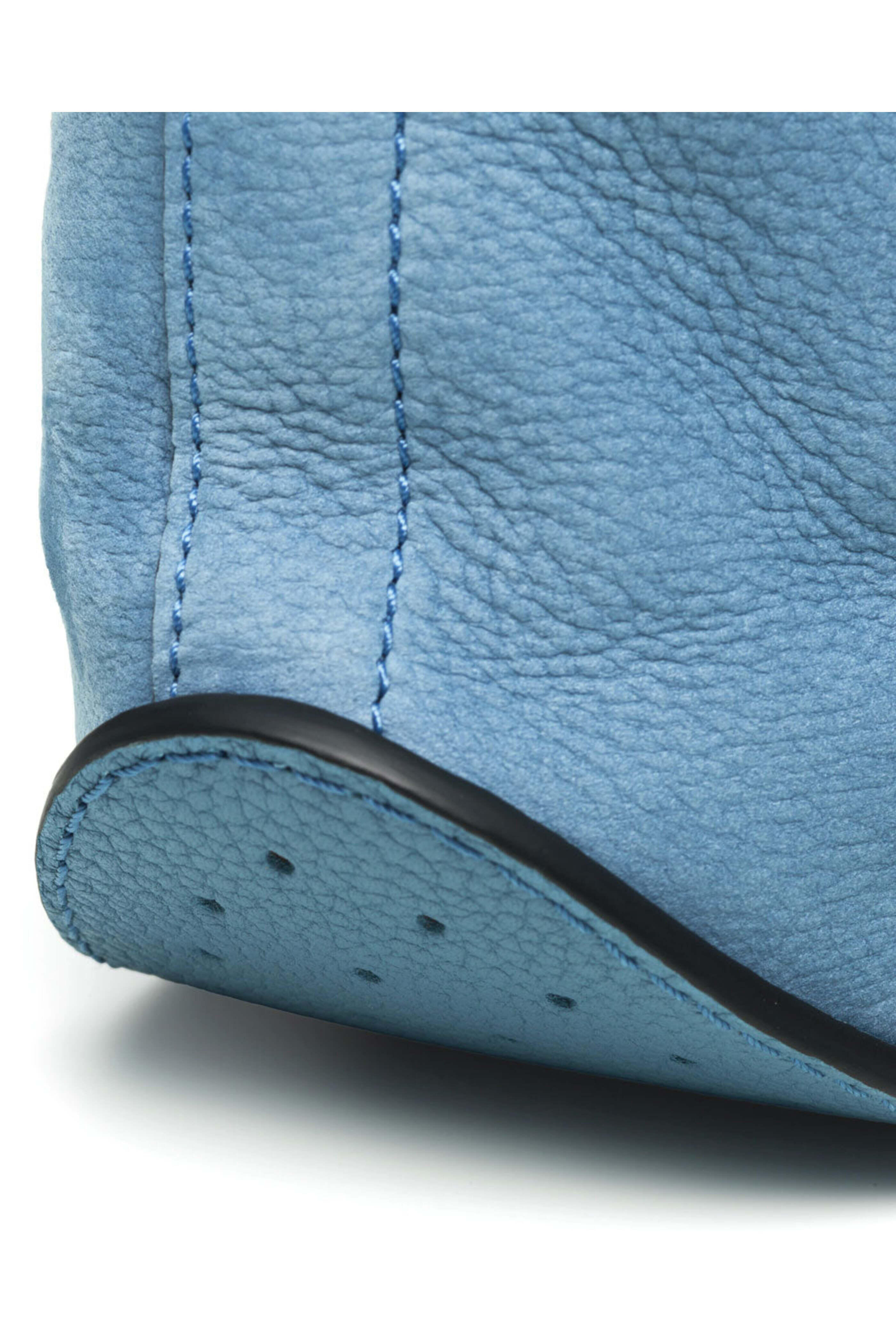 Delvaux Pin Daily in Denim II Soft and supple Santiag leather and Taurillon grained calf leather D shaped front pocket Zippered closure One flat pocket D-shaped inside hook Palladium metal hardware Adjustable shoulder strap 10 W X 10.5 T X 4.5 D Made in Italy.