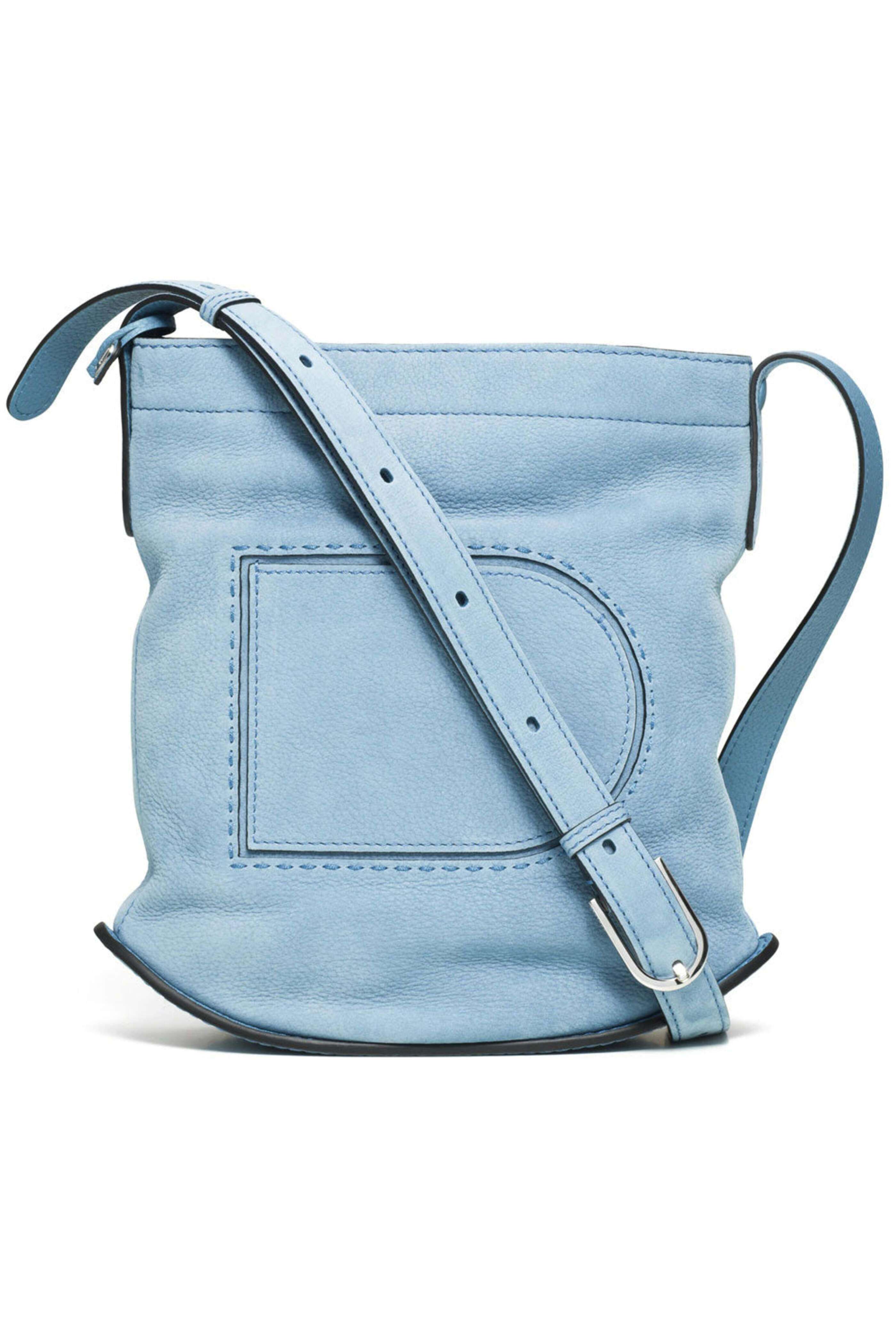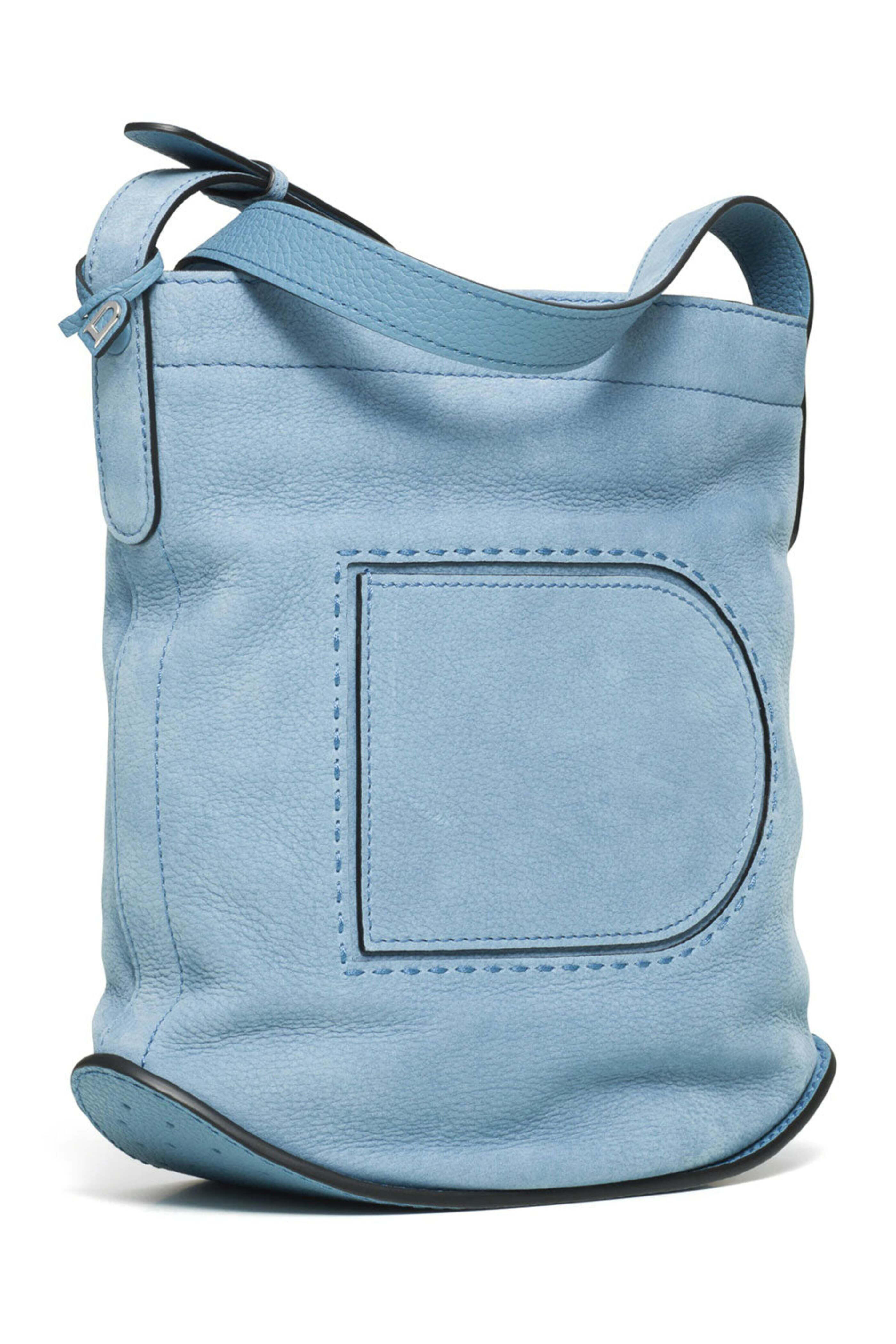- Delvaux Pin Daily in Denim II Soft and supple Santiag leather and Taurillon grained calf leather D shaped front pocket Zippered closure One flat pocket D-shaped inside hook Palladium metal hardware Adjustable shoulder strap 10 W X 10.5 T X 4.5 D Made in Italy