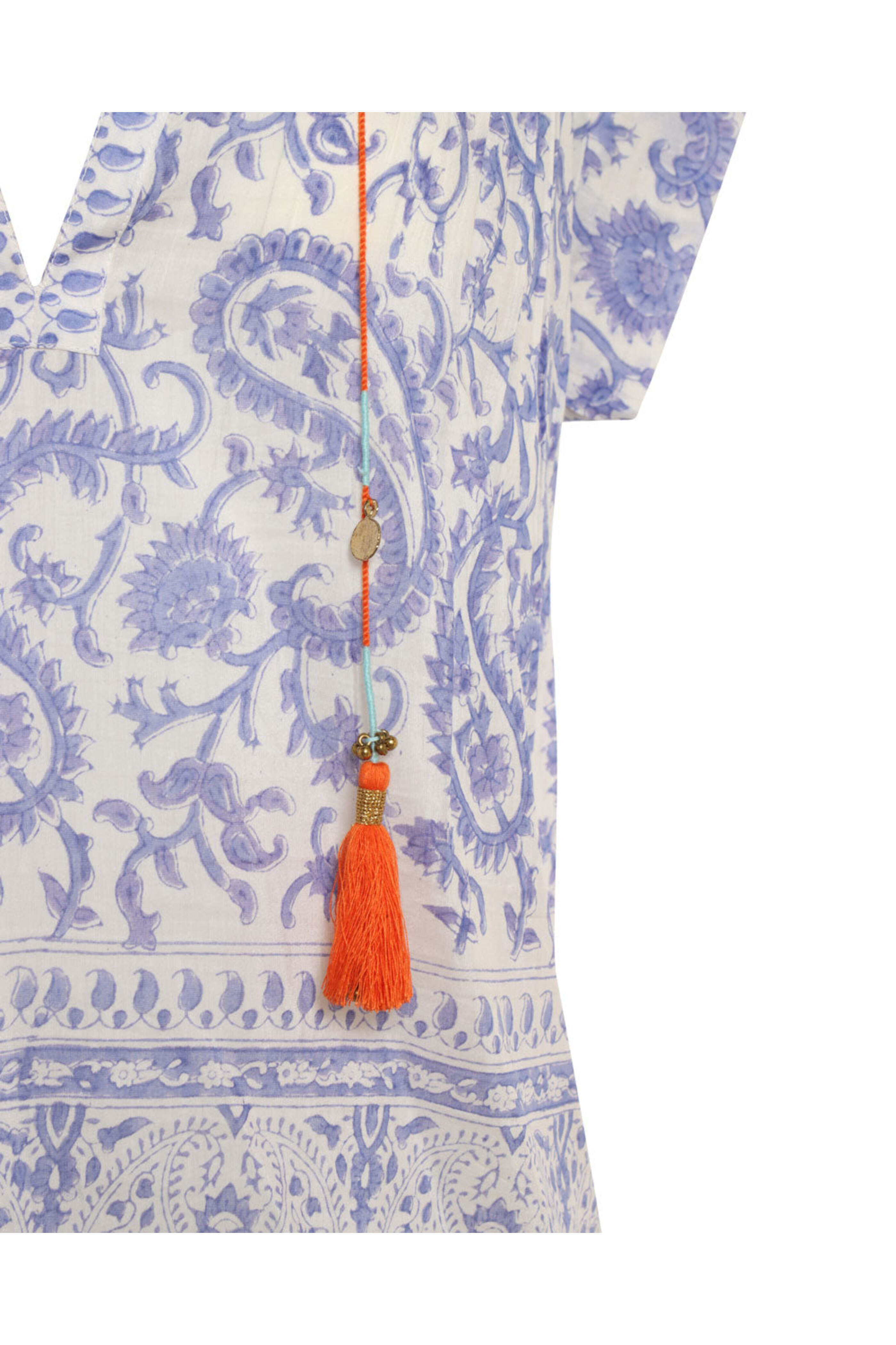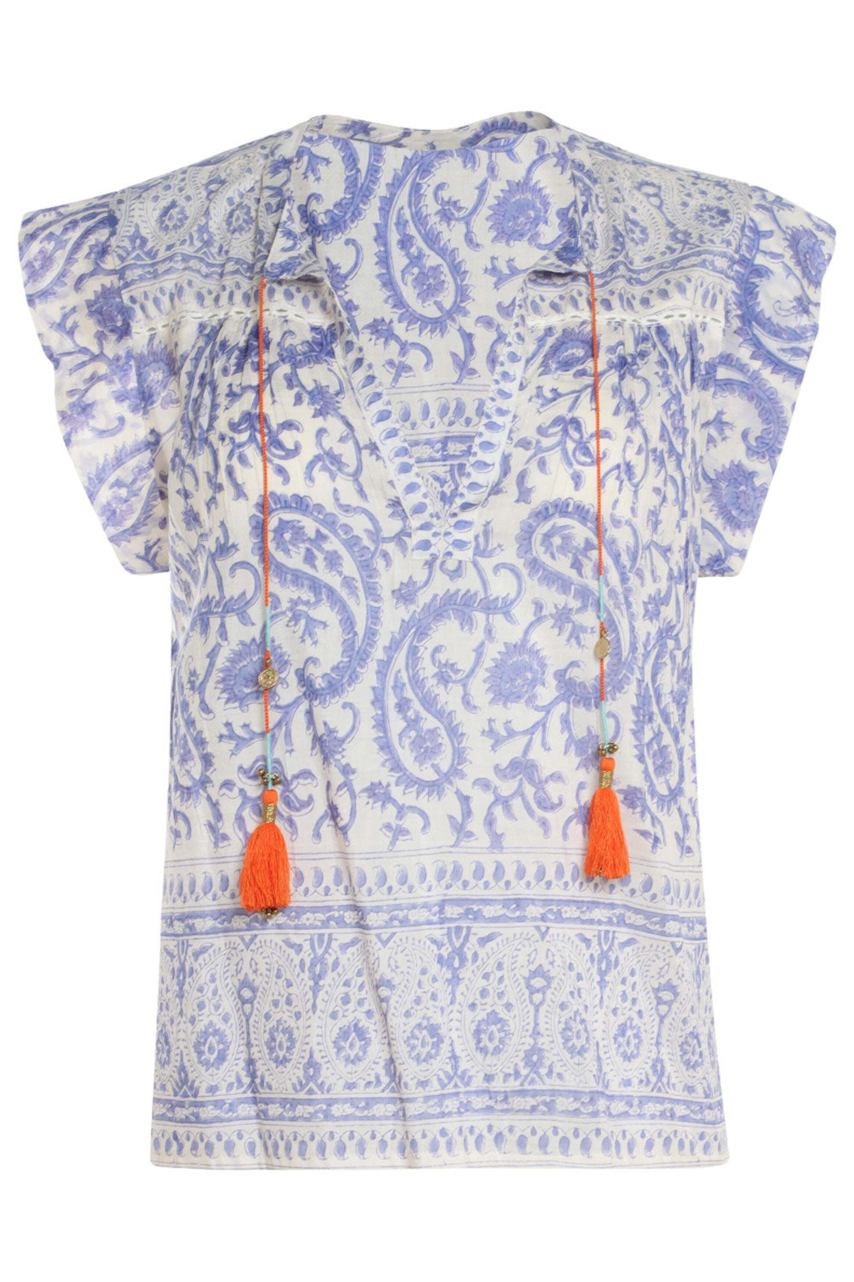 Bell Blue Paisley Aubrey Top. V neck. Self-tie tassel details. Short flutter sleeves. Relaxed fit.