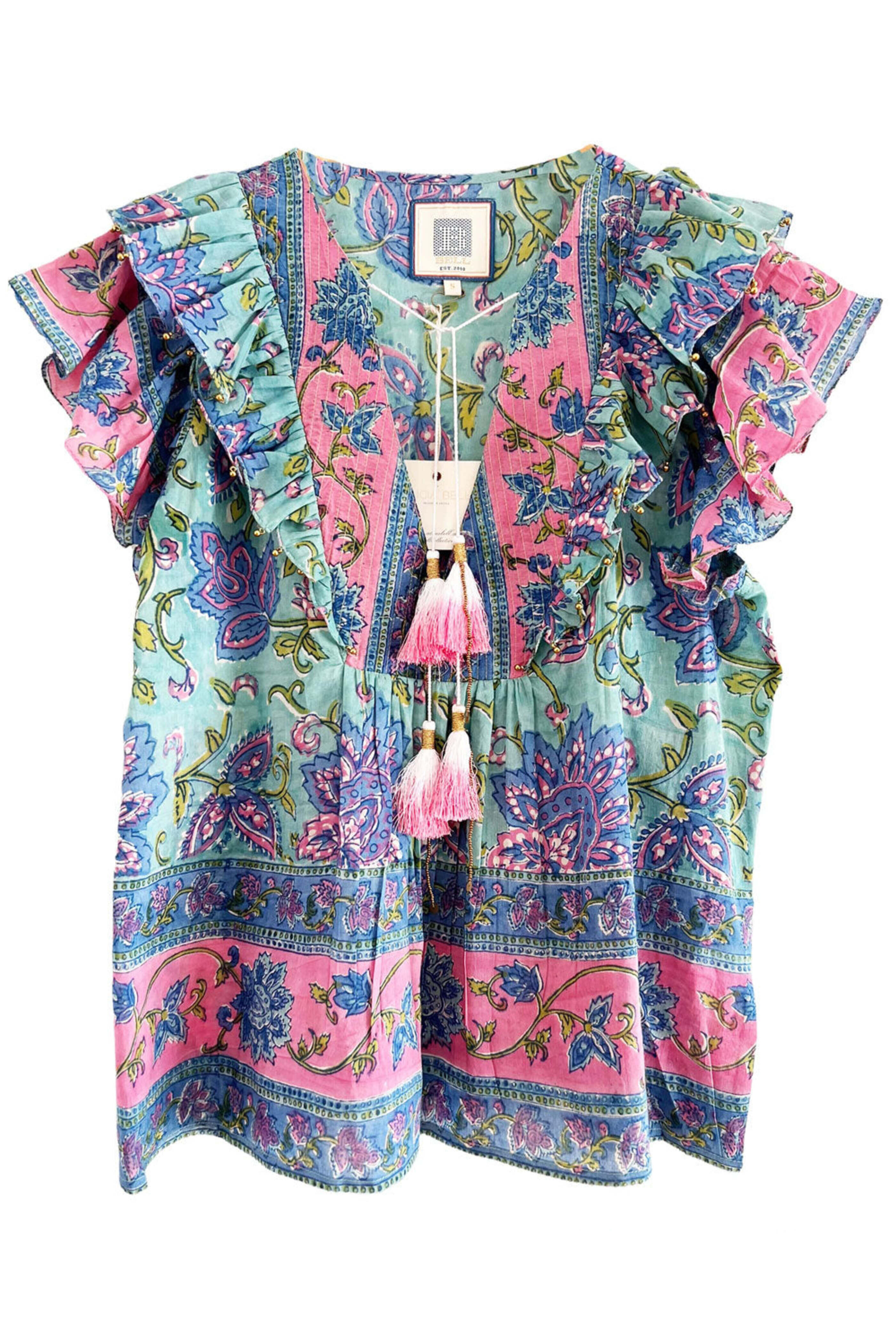 Bell Aqua and Pink Kiara Top. V neck. Self-tie closure; tassel detail. Short ruffle sleeves. Relaxed fit. Straight hem. 30% silk, 70% cotton.