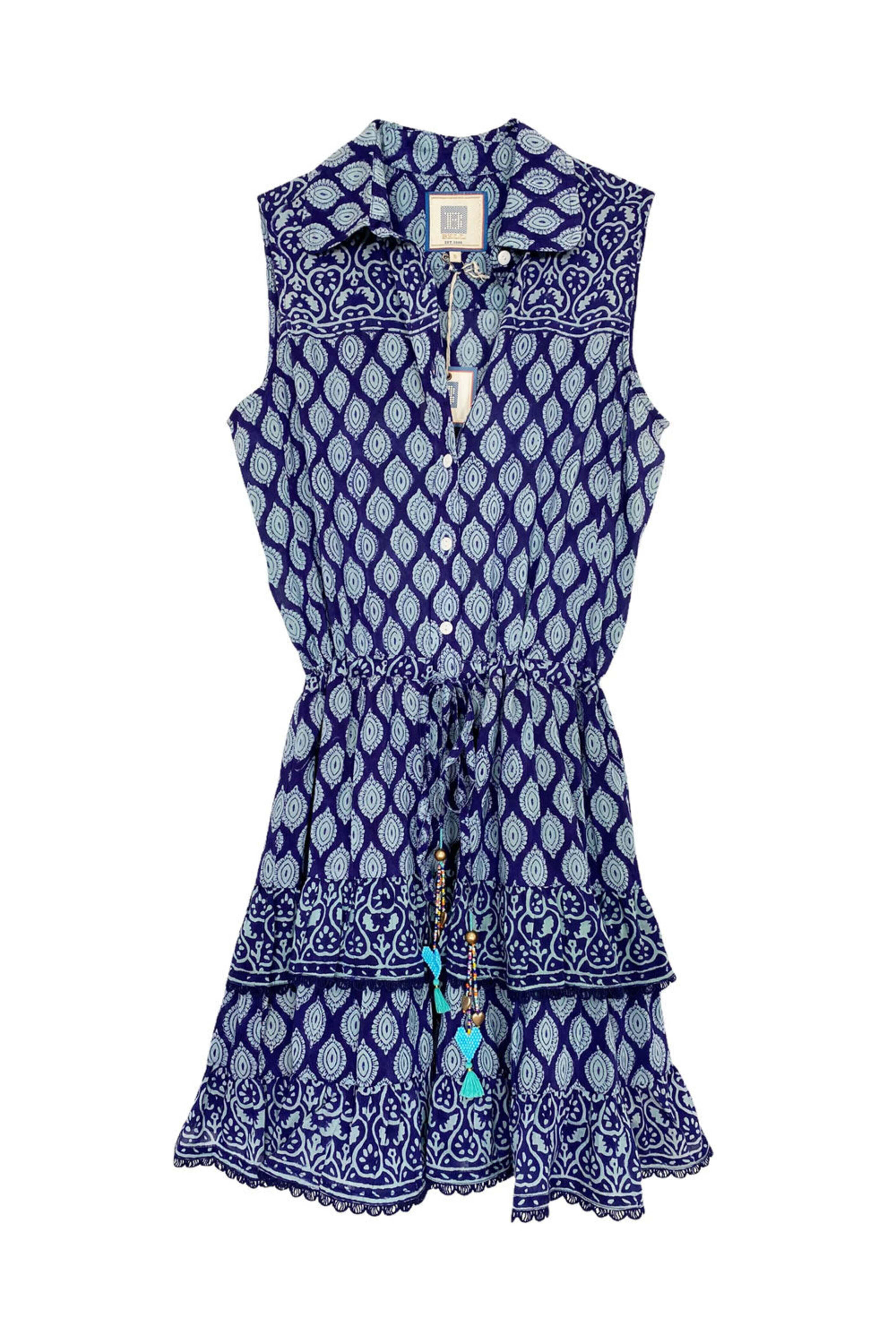Bell Navy Drawstring Birdie Mini Dress. Collar. Sleeveless. Button down front closure. Self-tie drawstring waist; tassel detail. Tiered ruffle skirt. Mini length. 30% silk, 70% cotton.