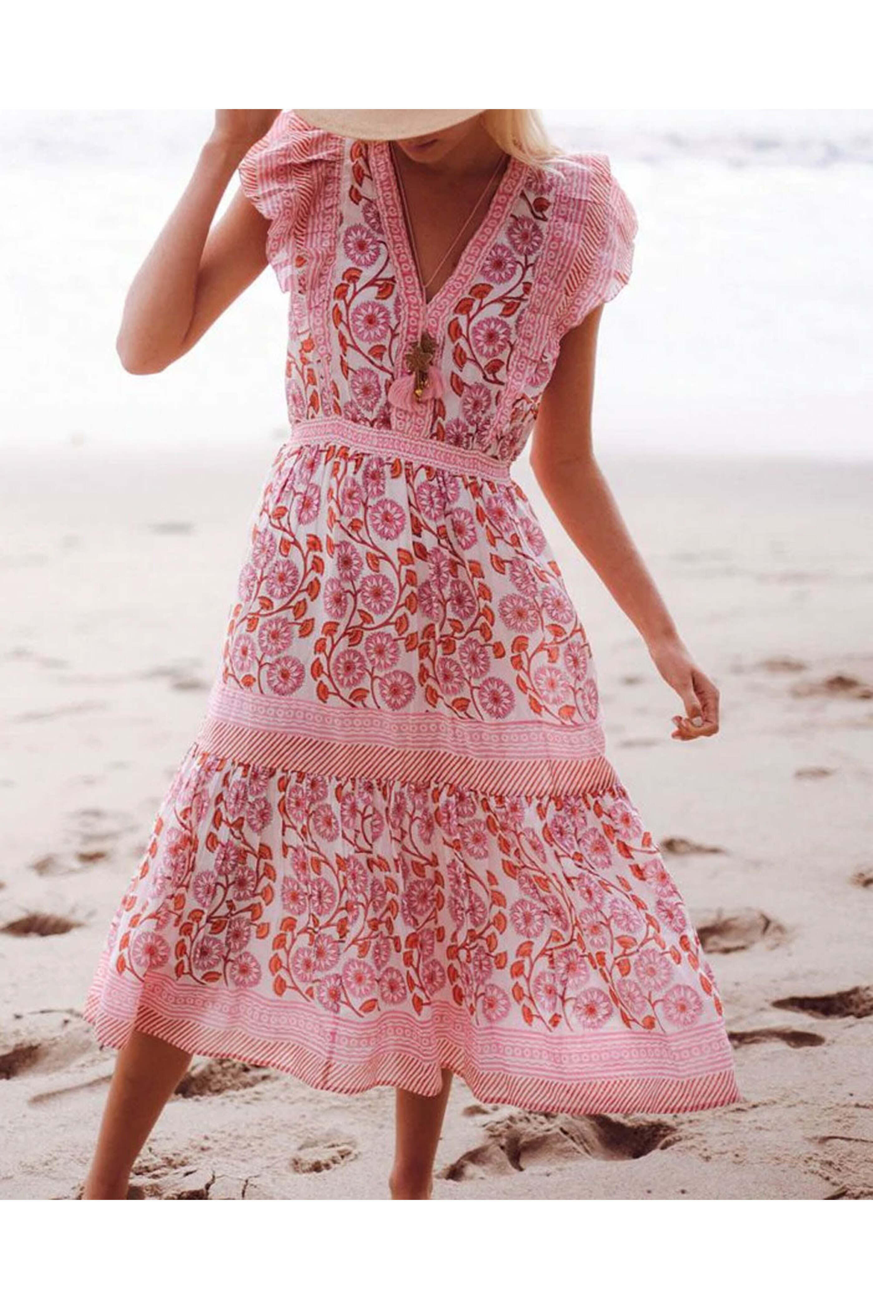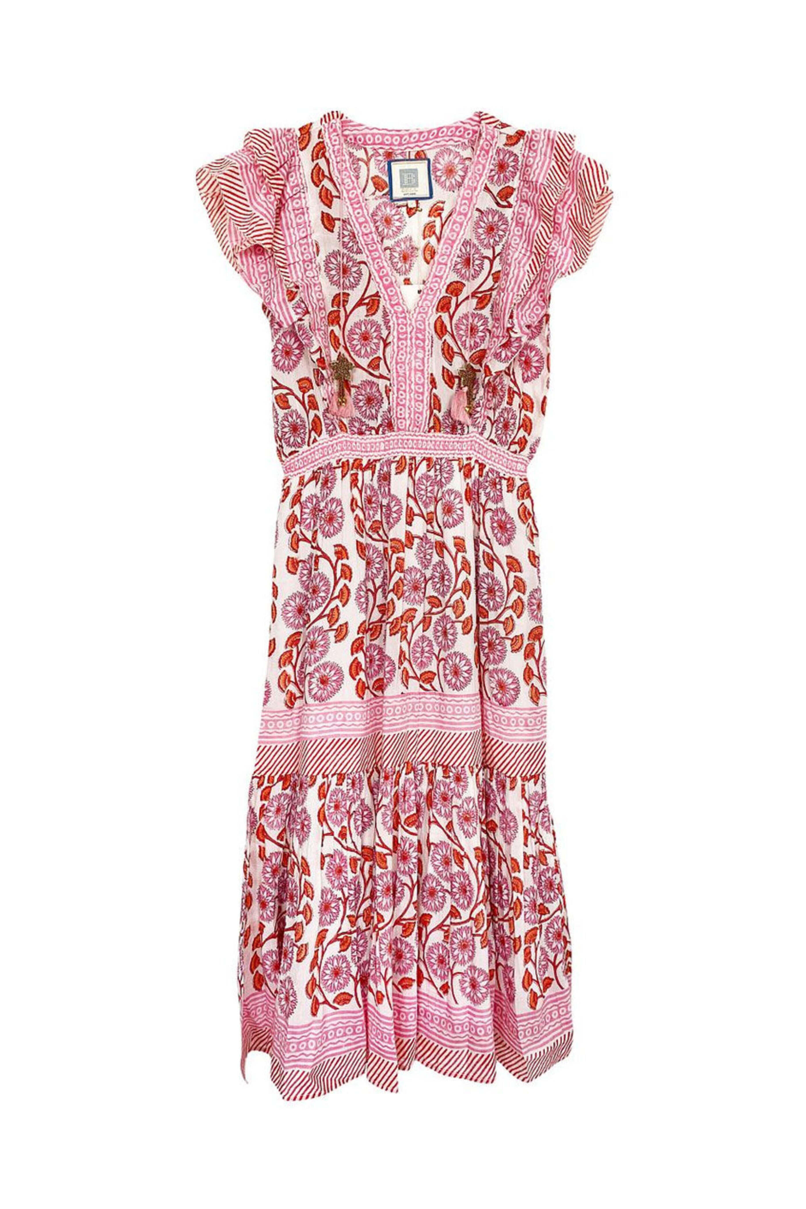 Bell Pink and Orange Phoebe Midi Dress. V neck. Short flutter sleeves. Relaxed fit. Midi length. 30% silk, 70% cotton.