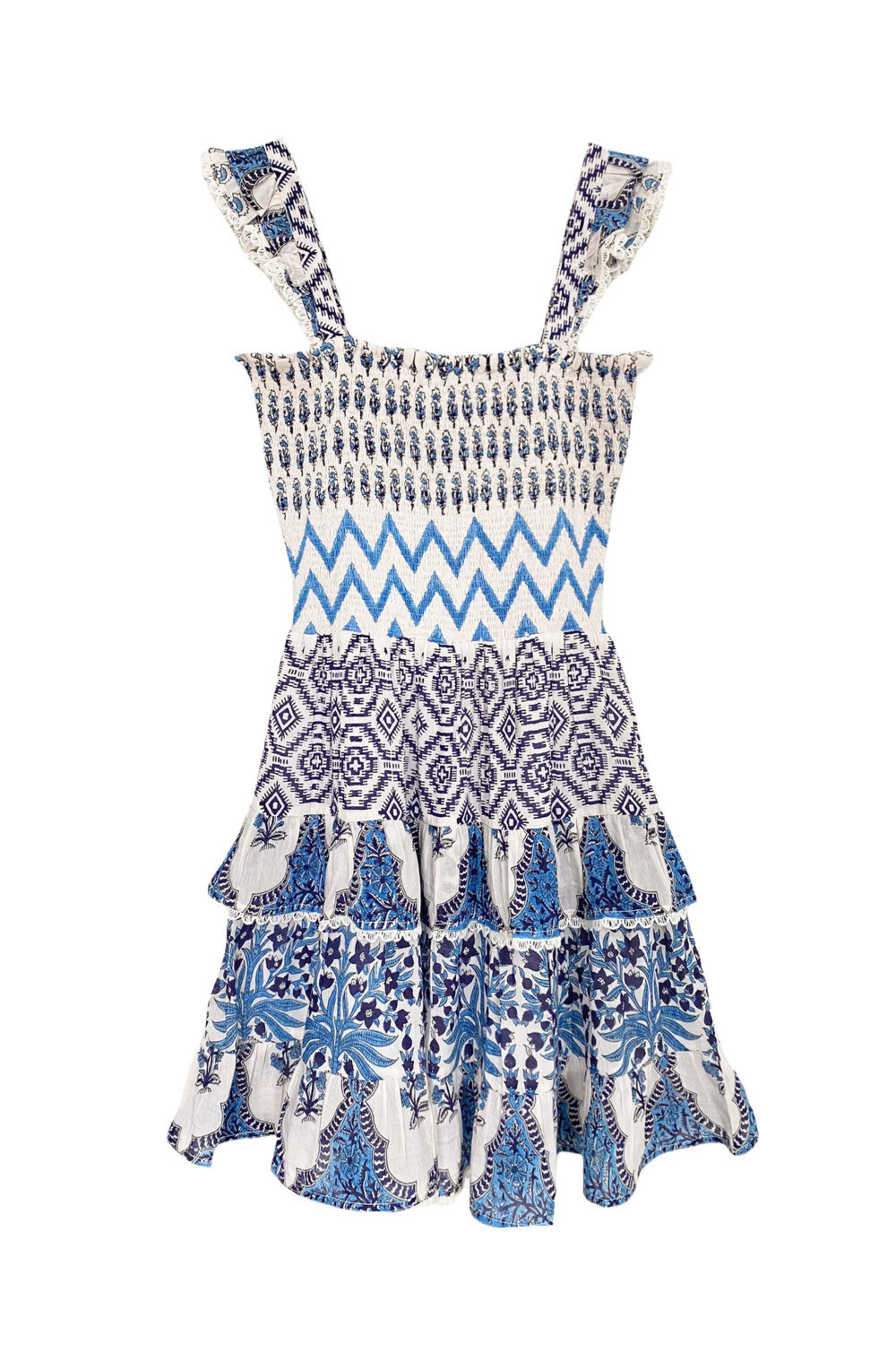 Bell Blue Christine Mini Dress. Square neck. Square back. Sleeveless; ruffle shoulder straps. Smocked at waist. Tiered ruffle skirt. Mini length. 30% silk, 70% cotton.