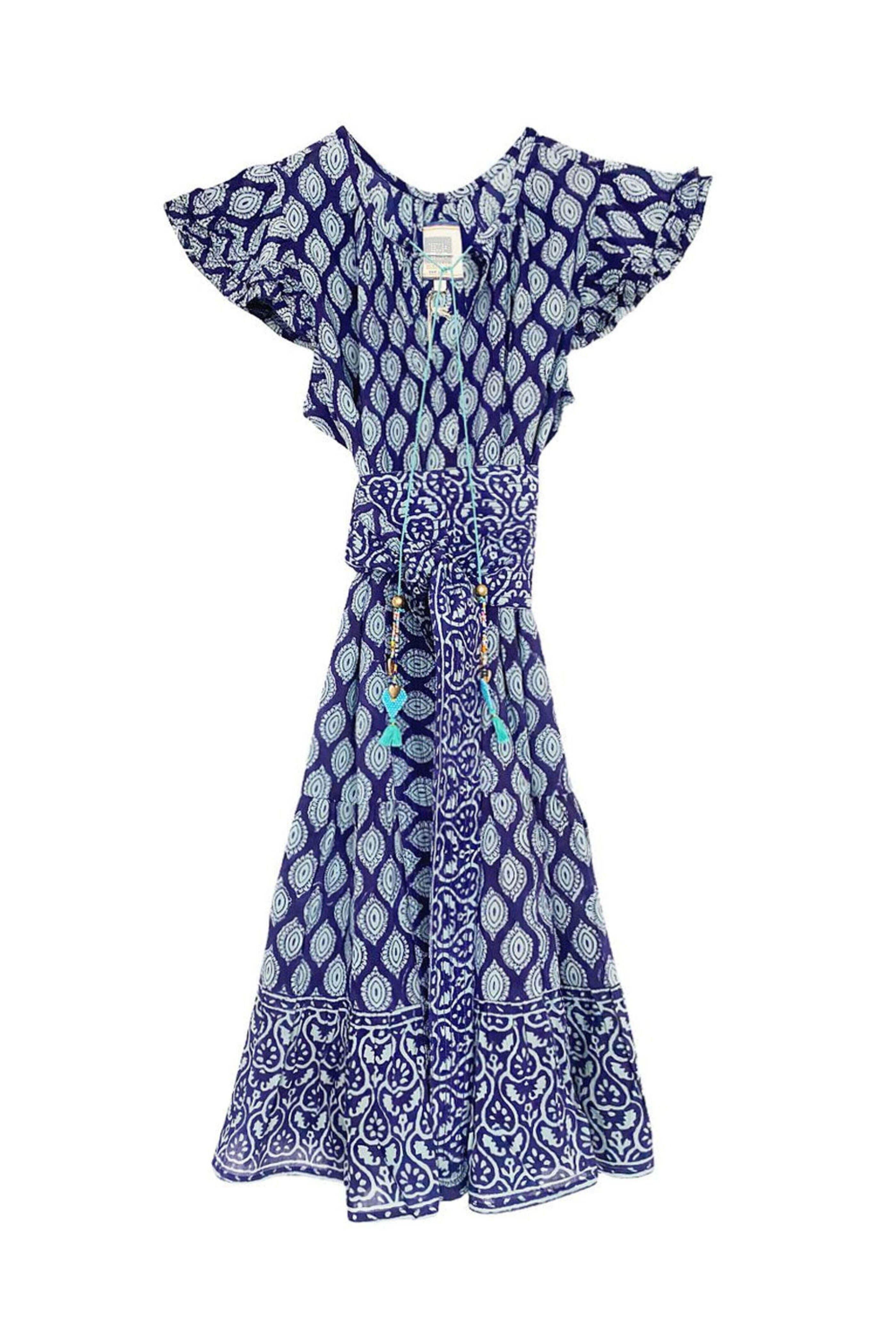 Bell Navy Belted Maya Mini Dress. V neck. Self-tie closure; tassel detail. Short flutter sleeves. Removable self-tie belt; self fabrication. Relaxed fit. Mini length. 30% silk, 70% cotton.