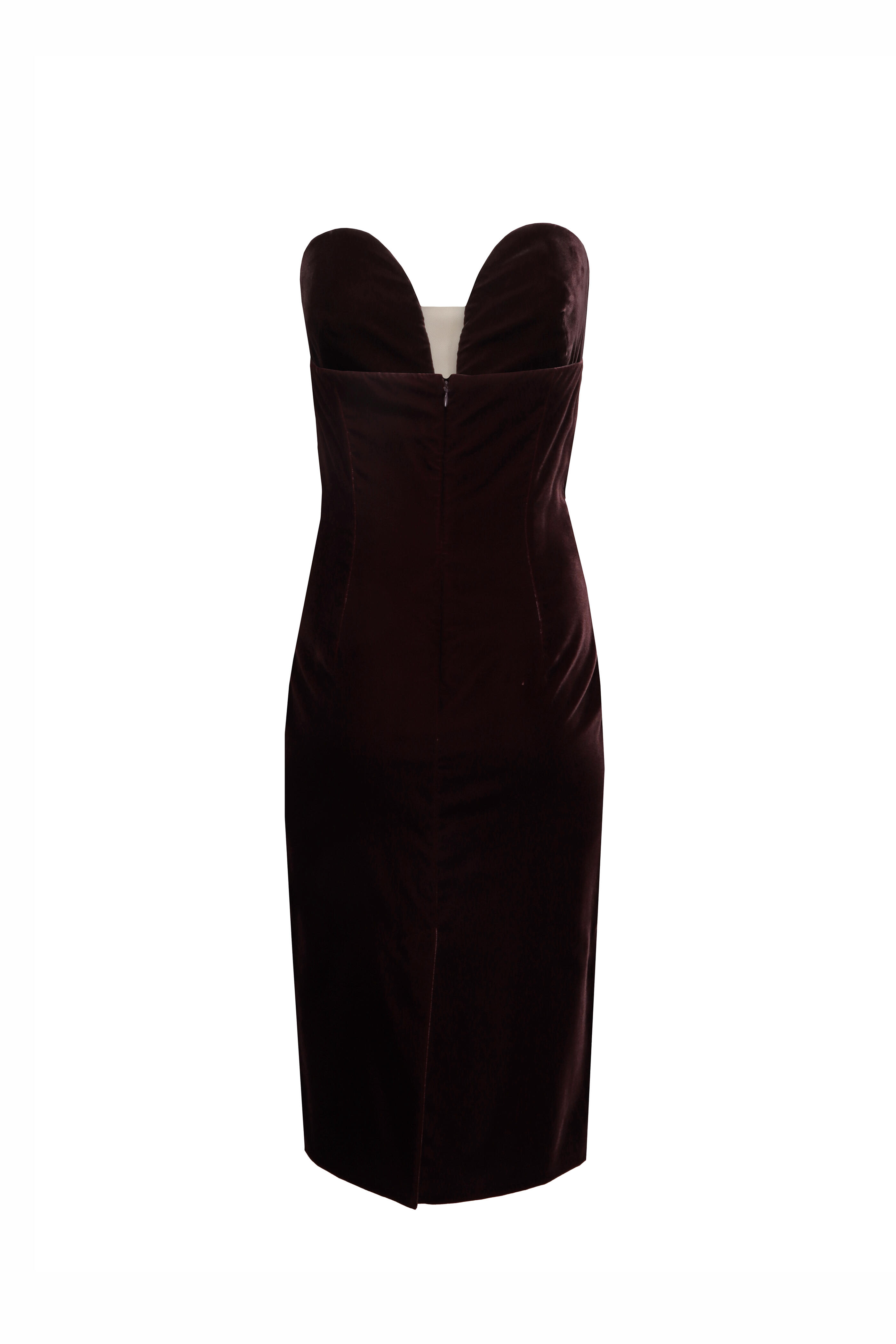 Strapless sweetheart neckline. Deep v mesh. Concealed back zip closure. Slim silhouette. Velvet fabrication. Imported. 66% viscose, 31% cupro, 3% elastane; lined. Dry clean.