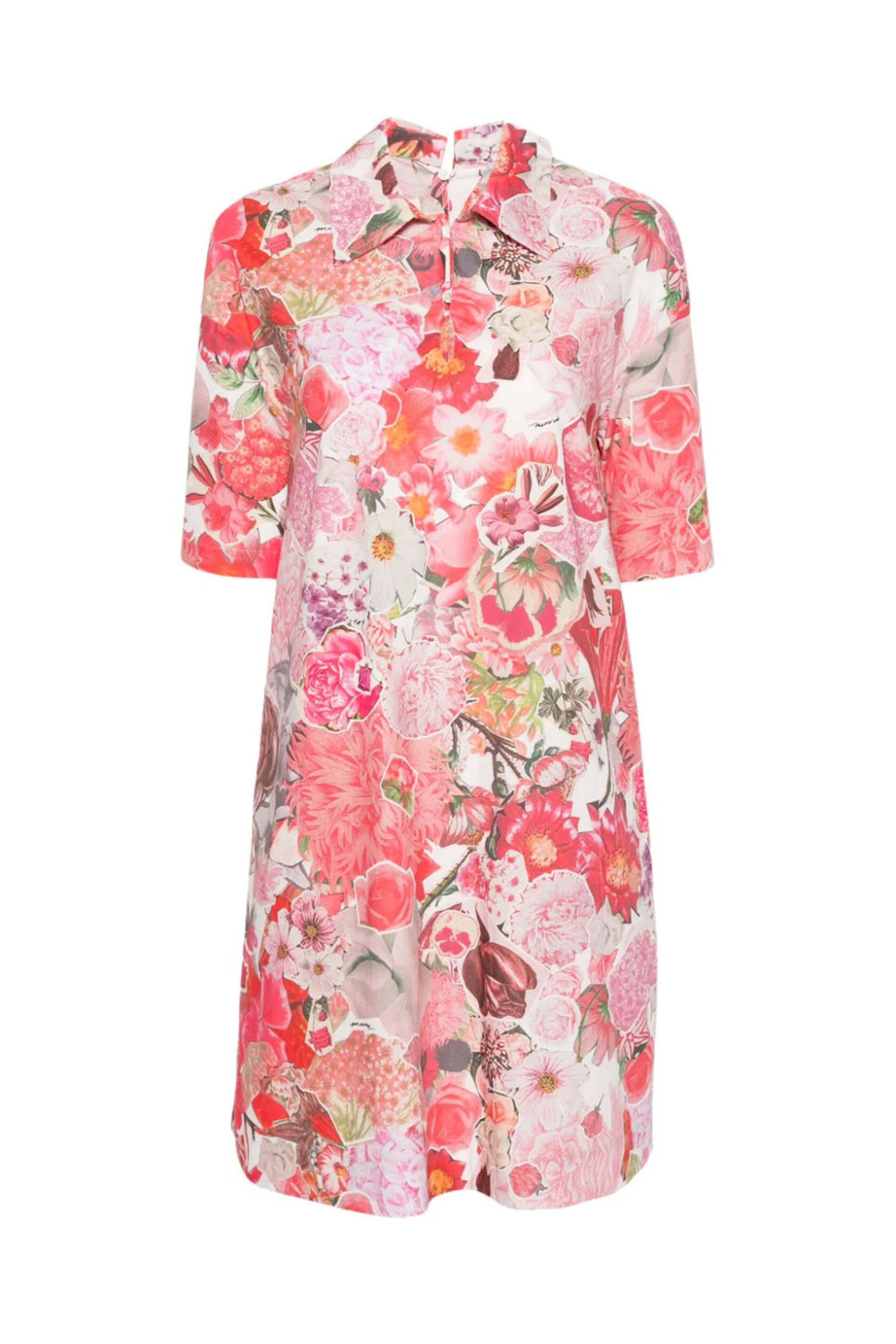 Marni Pink Clematis Cocoon Mini Dress. Collar. Back hook and eye closure. Front keyhole detail. Elbow length sleeves. Oversized fit. Mini to knee length. Made in Italy. 100% cotton.