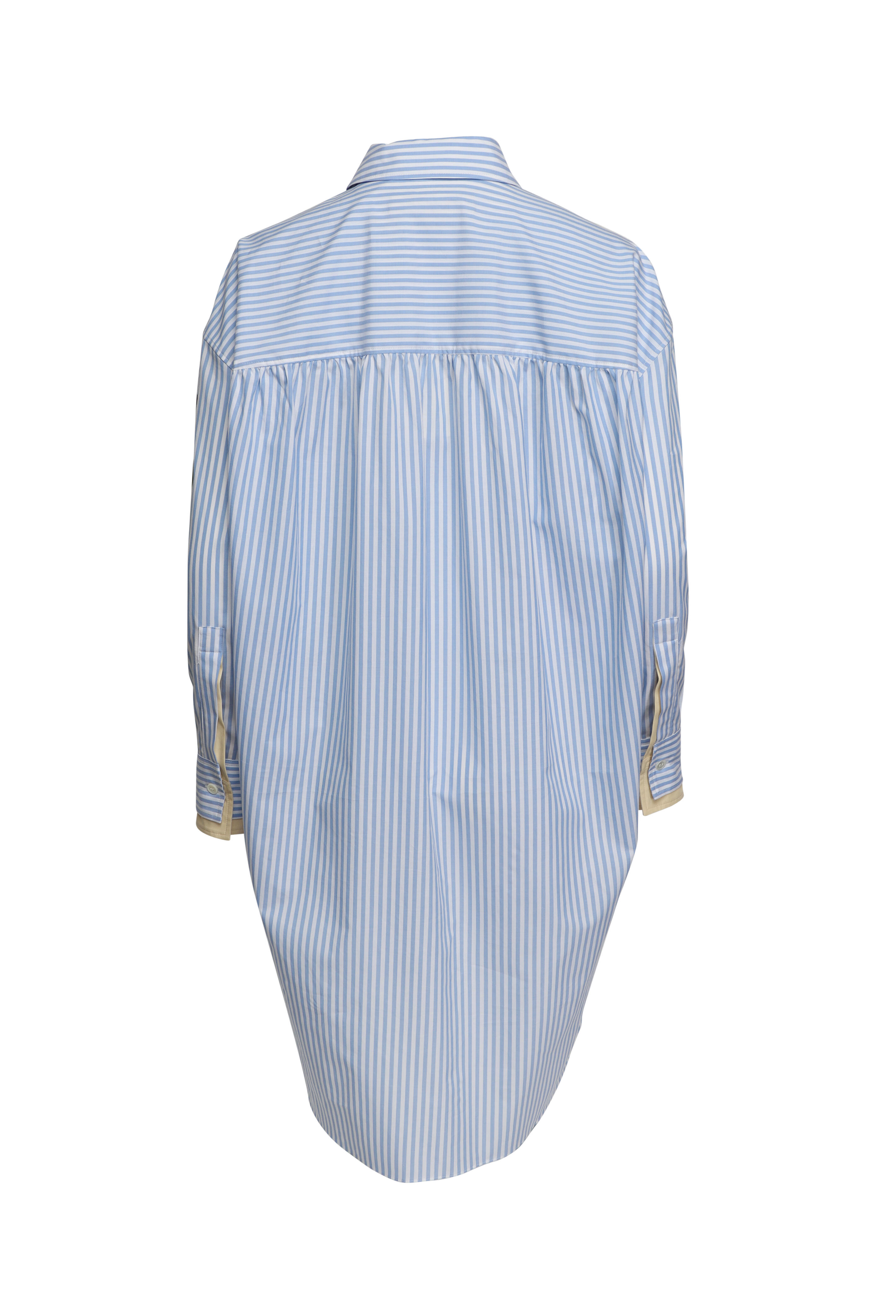Collar. Drop shoulders. Long sleeves; button cuffs. Button up front closure. Oversized fit. High low hem. Straight front hem. Rounded back hem. Made in Italy. Knee length. 100% cotton. Dry clean.