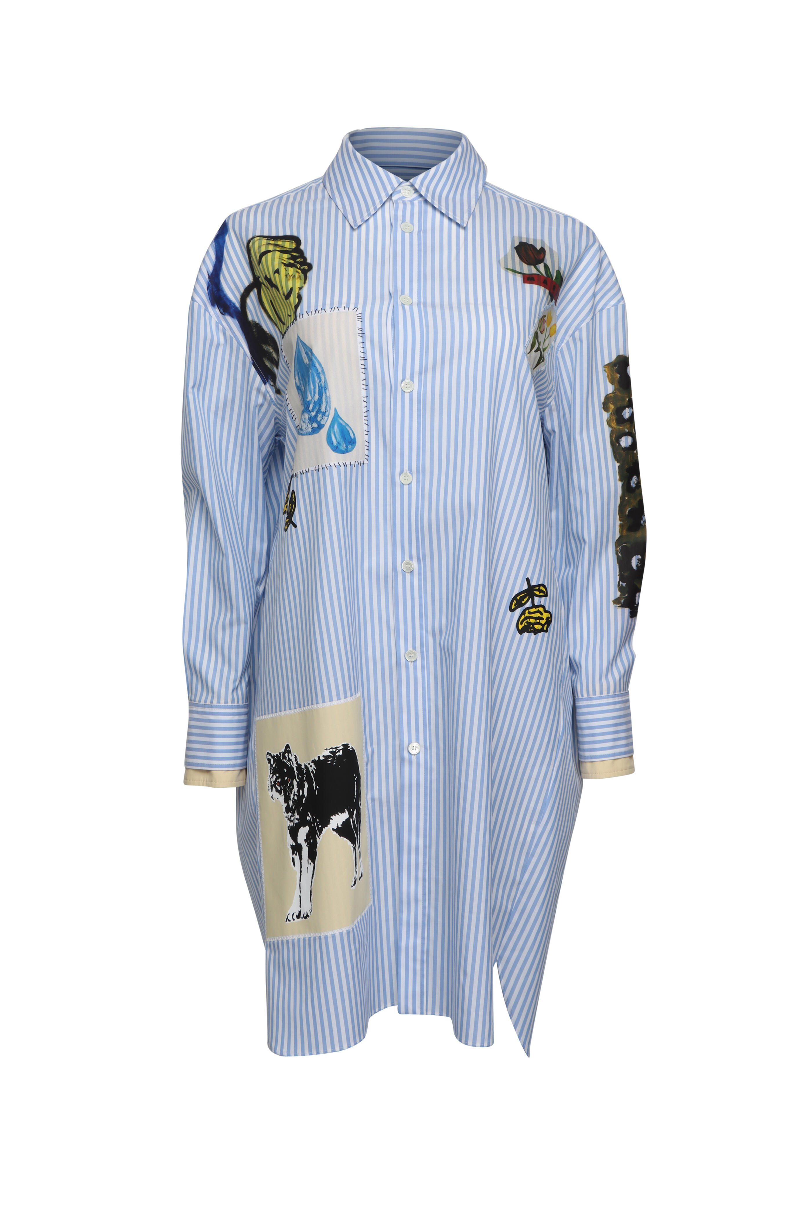 Iris Blue Stripe Floral Applique Print Shirtdress