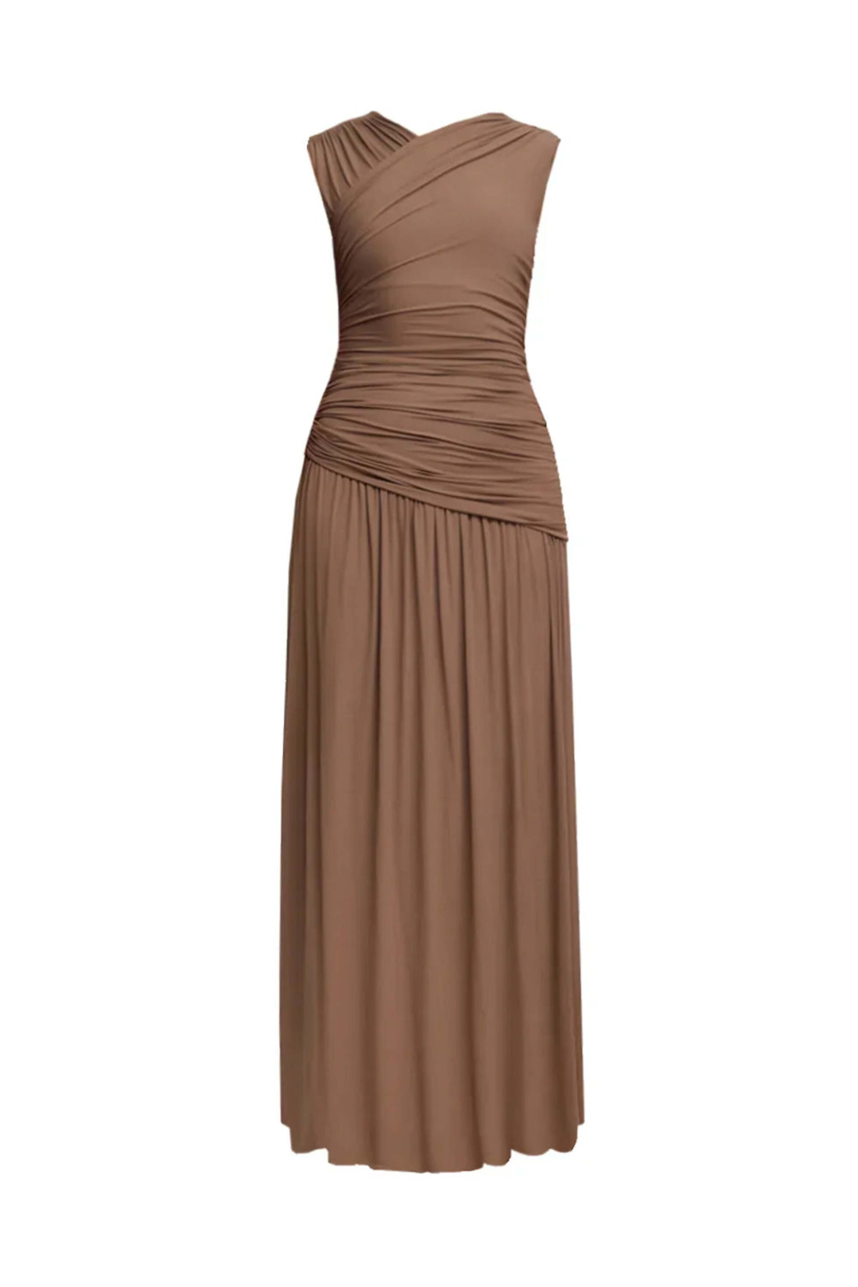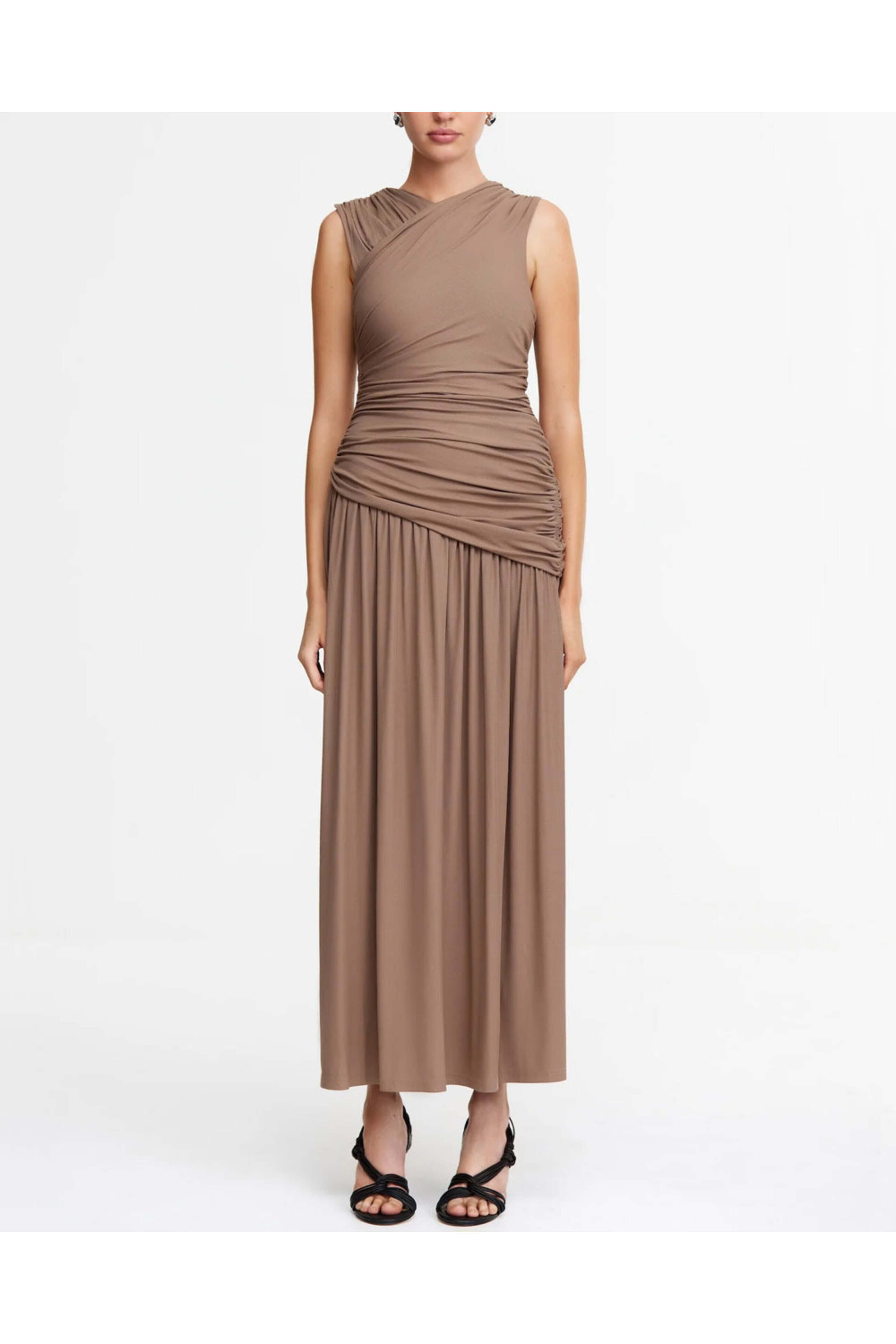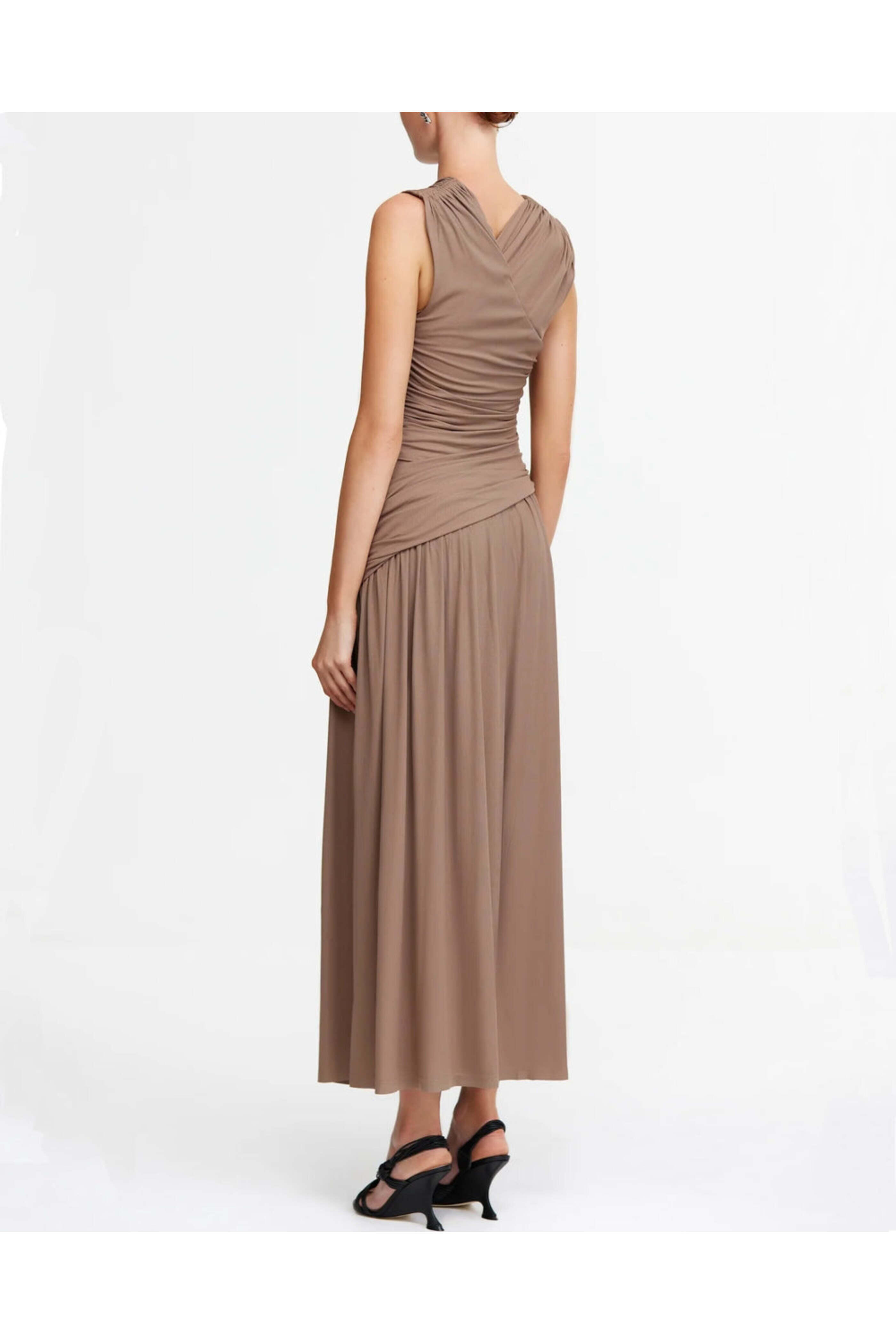 Acler Sepia Atterly Maxi Dress. V neck. V back. Sleeveless. Slim silhouette. Ruched along sides. Aline skirt. Midi to maxi length. Partially lined. 100% modal outer, 95% polyester, 5% elastane lining.