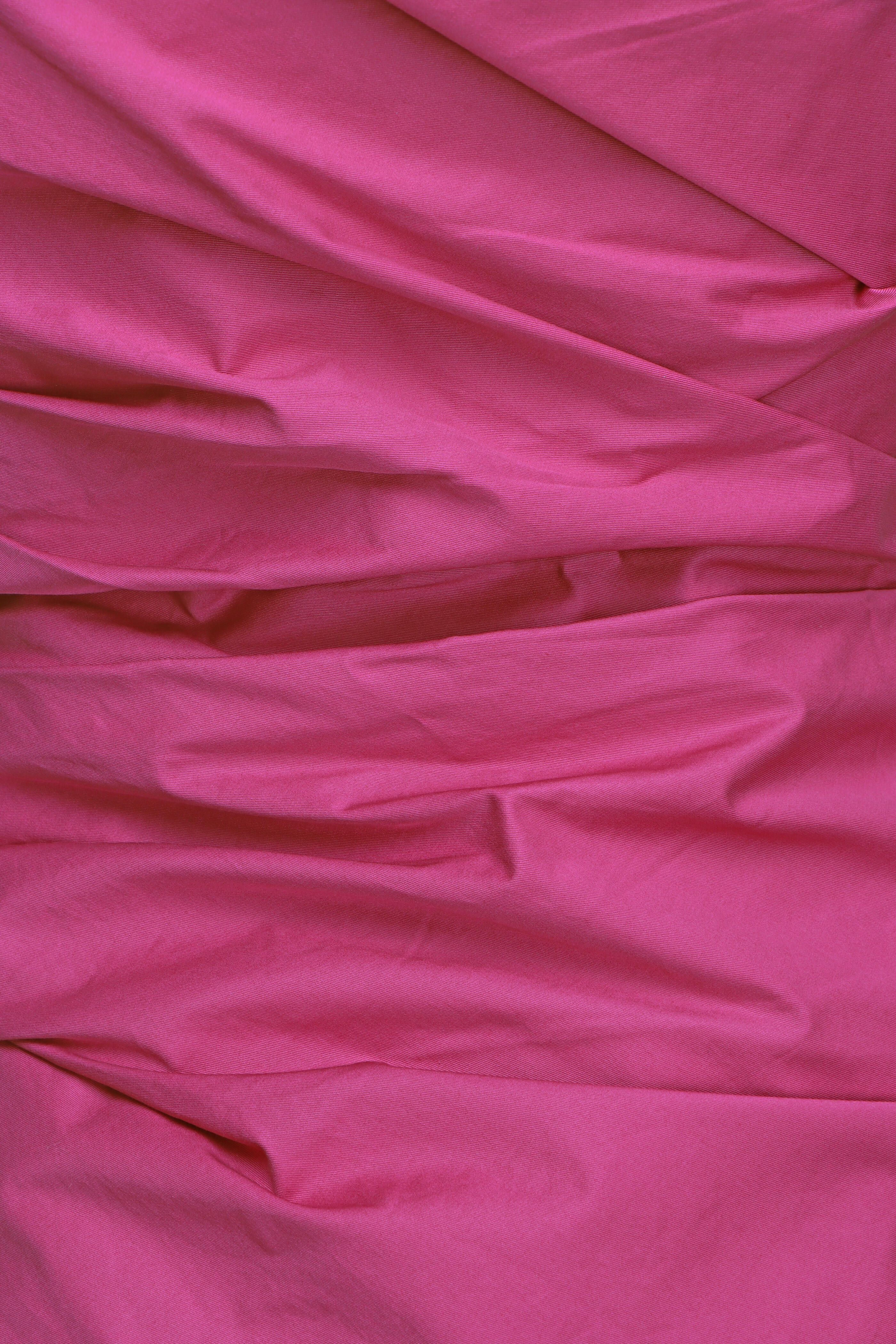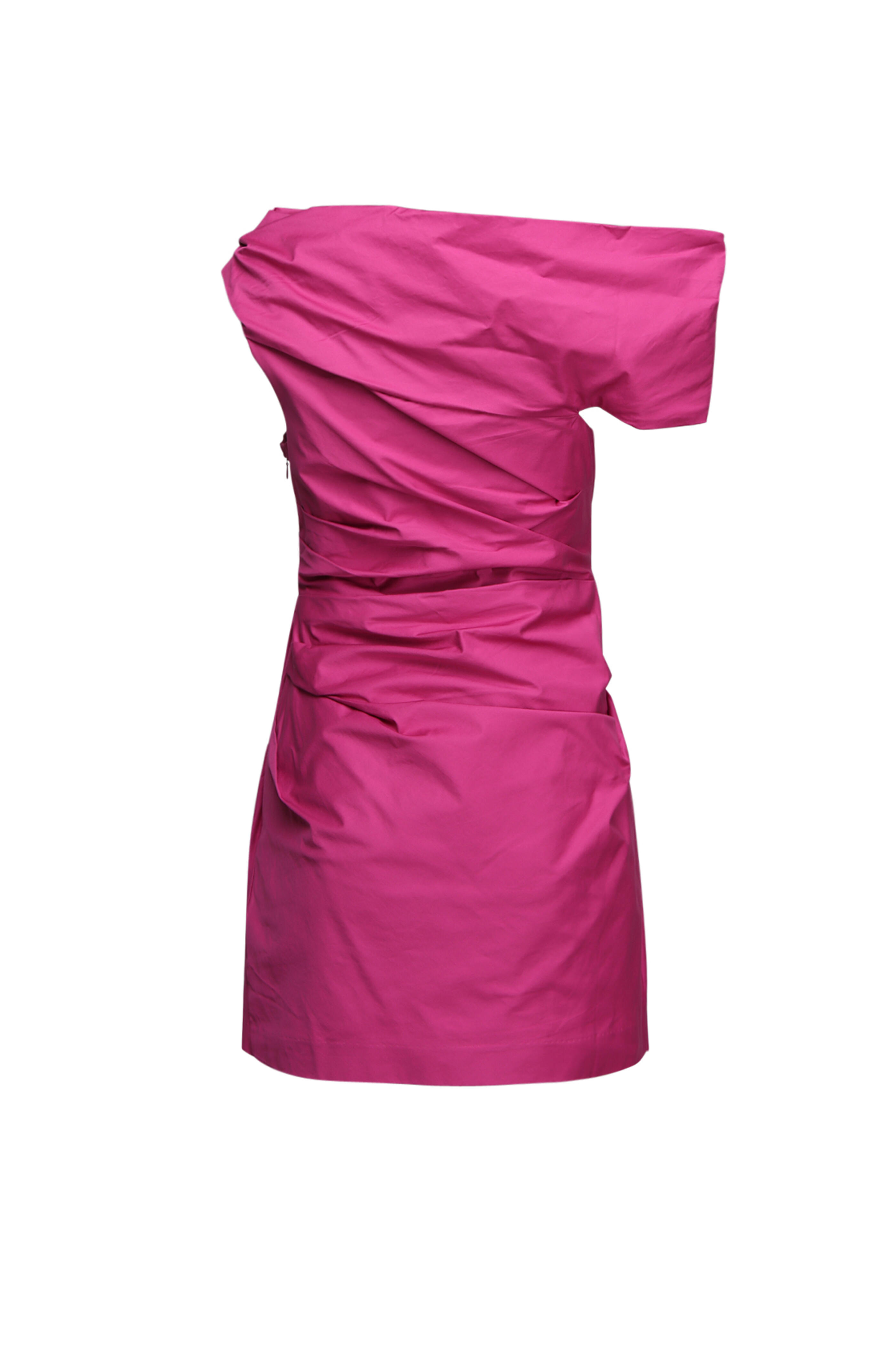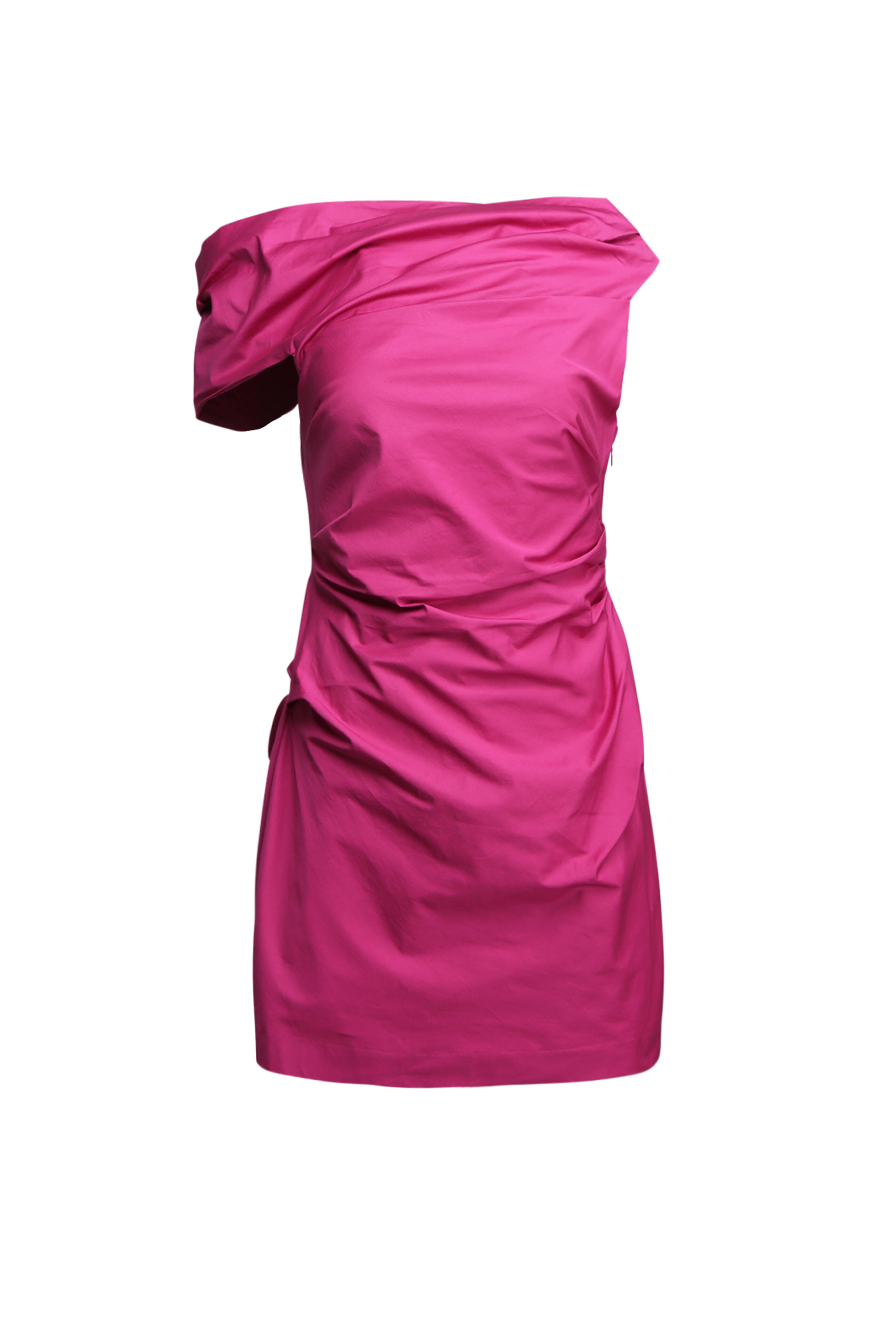 Off the shoulder neckline. Sleeveless; asymmetrical shoulder straps. Concealed side zip closure. Ruched throughout. Imported. Slim silhouette. Mini length. 72% cotton, 25% Tencel, 3% elastane; lined. Dry clean.