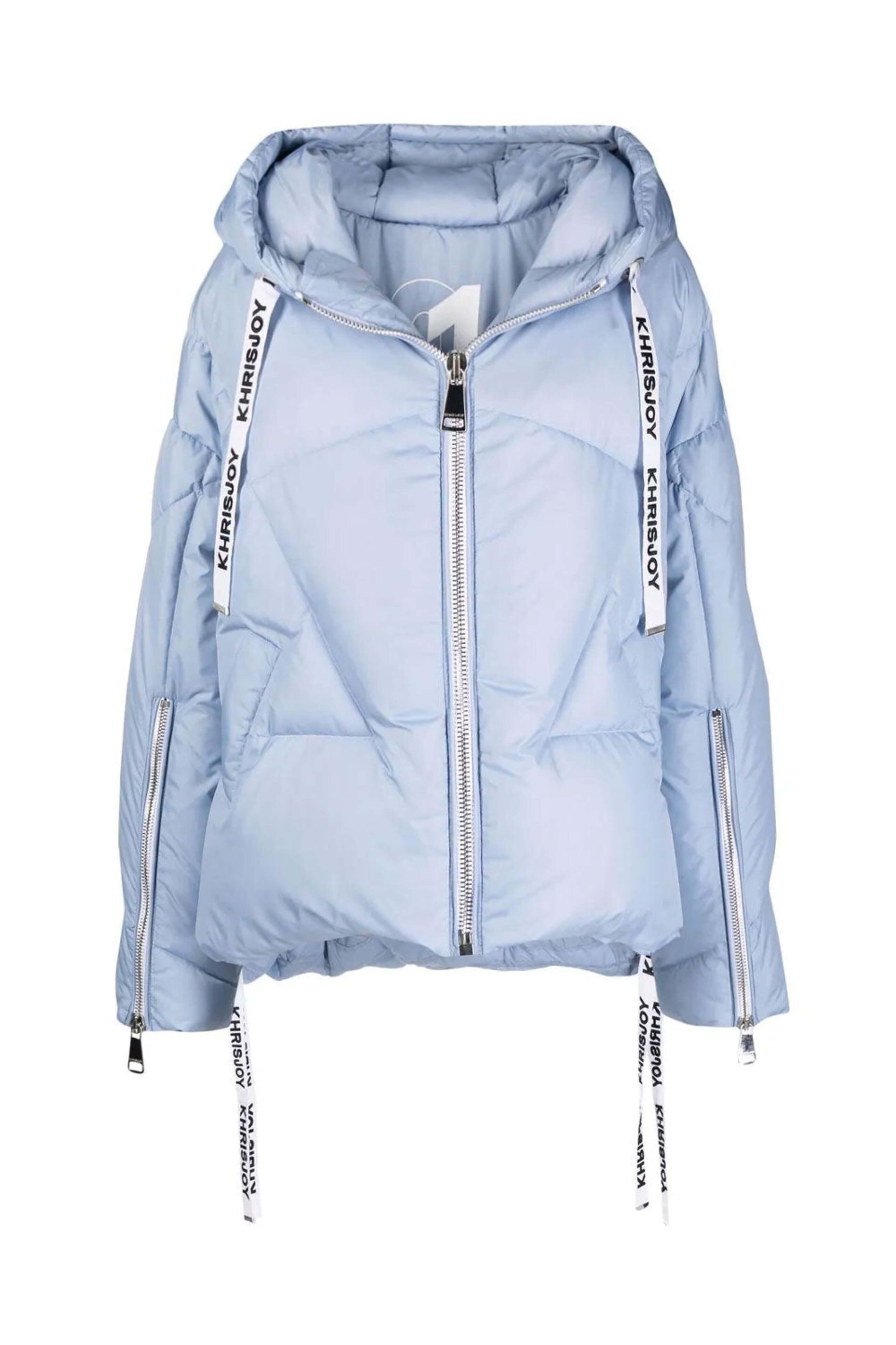 Khrisjoy Sky Blue Iconic Puffer Jacket. Hooded; logo tape drawstrings. Long sleeves; zip cuffs. Bold silver-tone front zip closure. Side slip pockets. Logo tape drawstring hem. Puffer style. Made in Italy. 100% polyester outer and lining, 100% feather down filling.