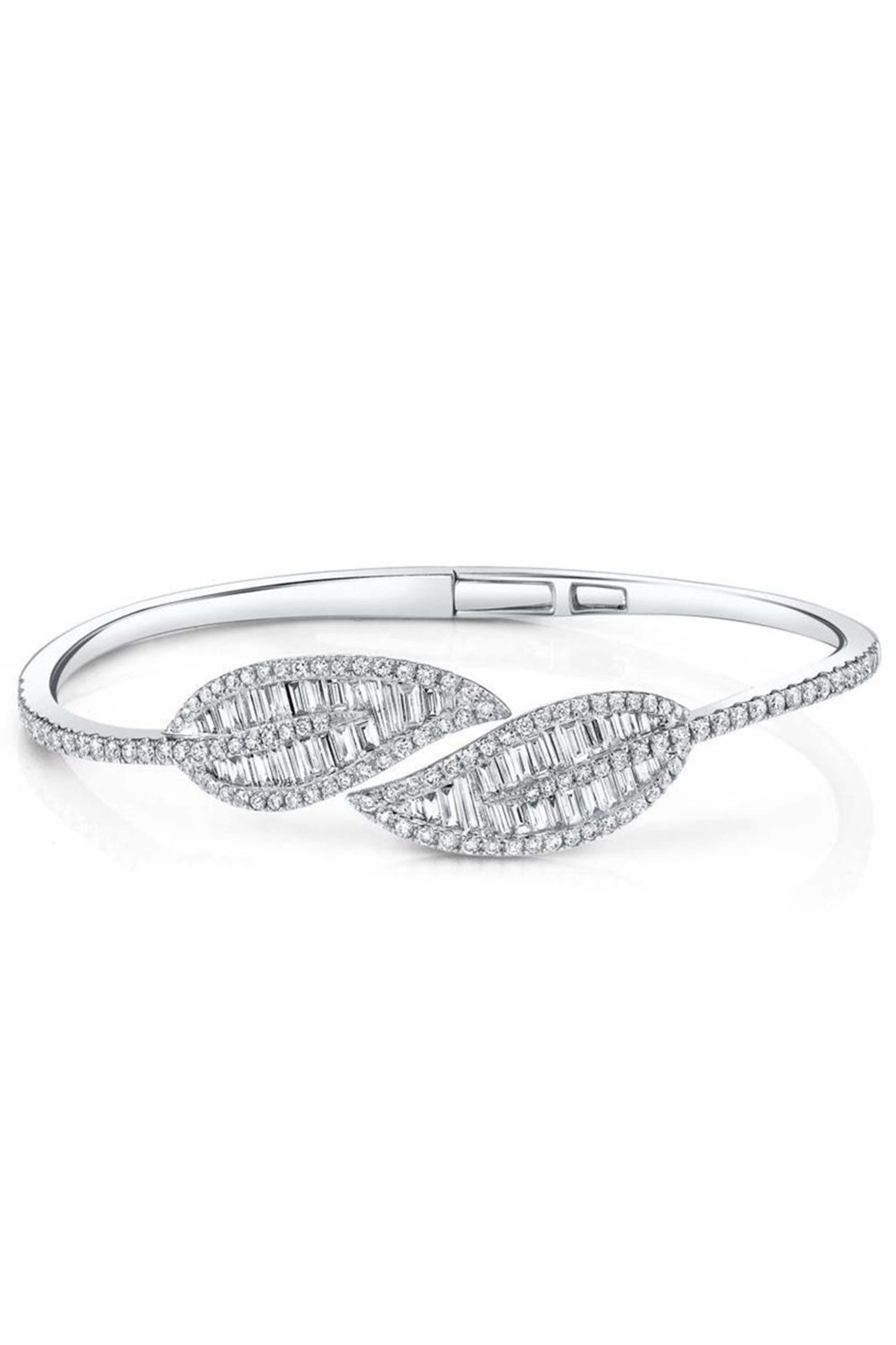 Anita Ko Diamond Leaf Bracelet. 18K white gold. 1.25 ct. round diamonds. 2.10 ct. baguette diamonds. Leaf design. Bangle style. 6.5 L. Safety closure at hinge.