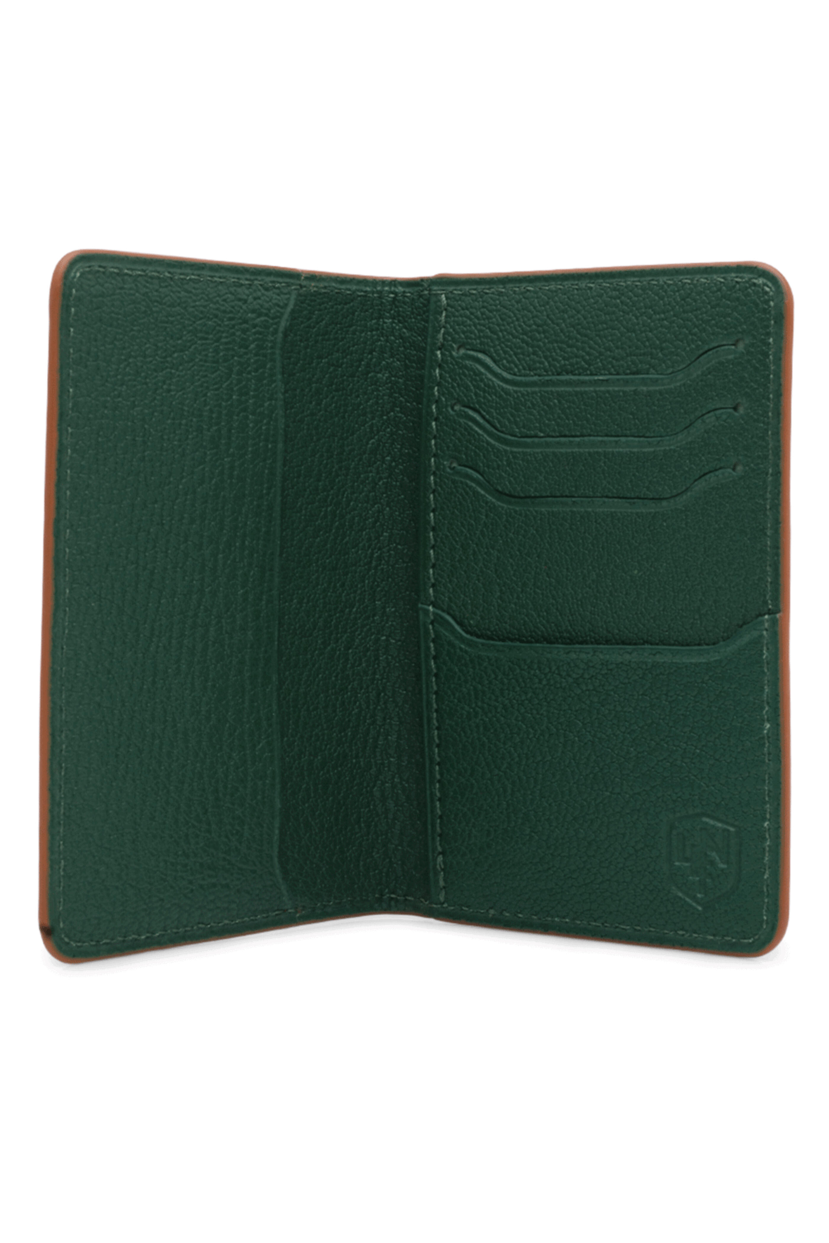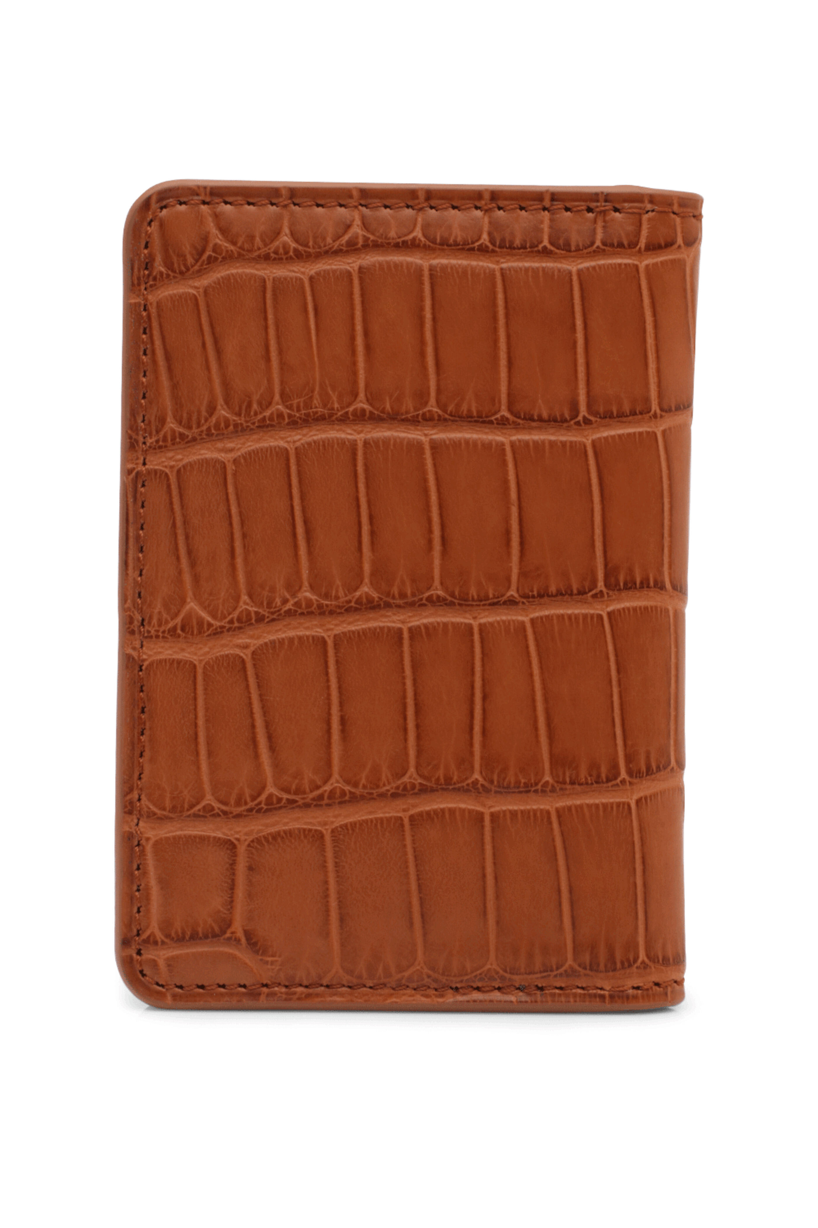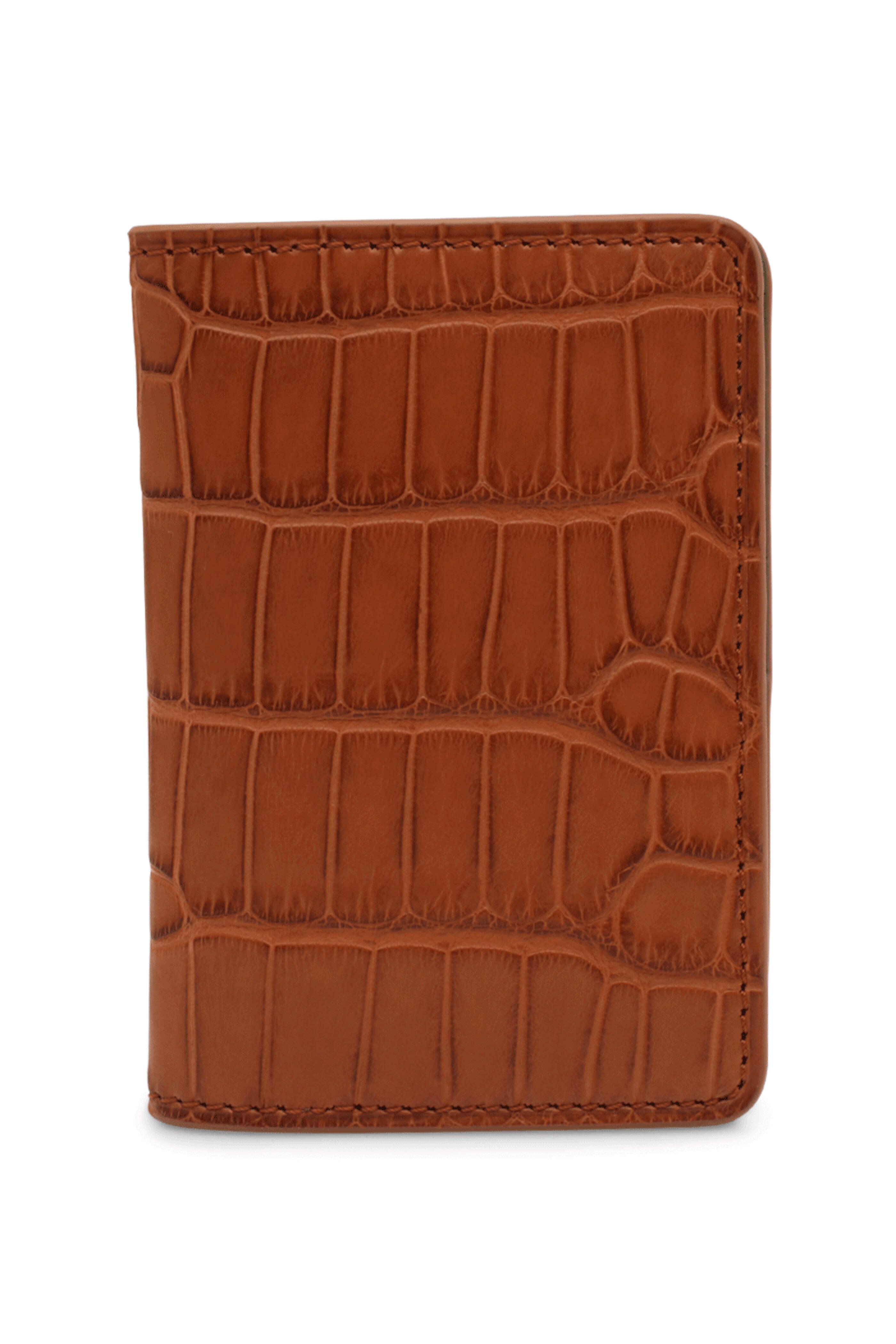 L.E.N. Alligator Passport Wallet in Cognac. Bi-fold closure. Two side slots. Four card slots. Green lining. Matte alligator. 4.5 L x 3 W x 0.75 D.
