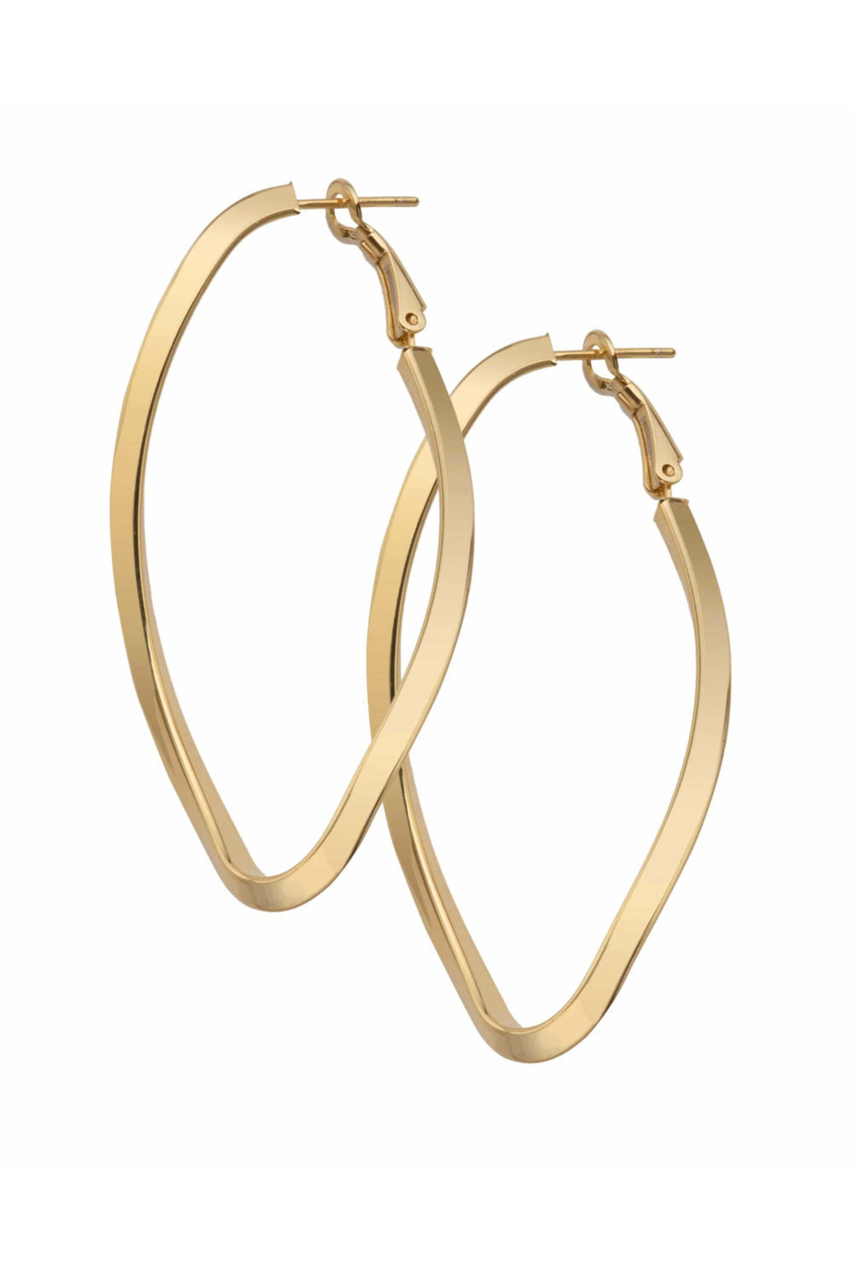 Jennifer Zeuner Jewelry Alex 2.5 Hoop Earrings. 18k yellow gold. Curved design. Hoop style. 2.5 L. Omega closure.