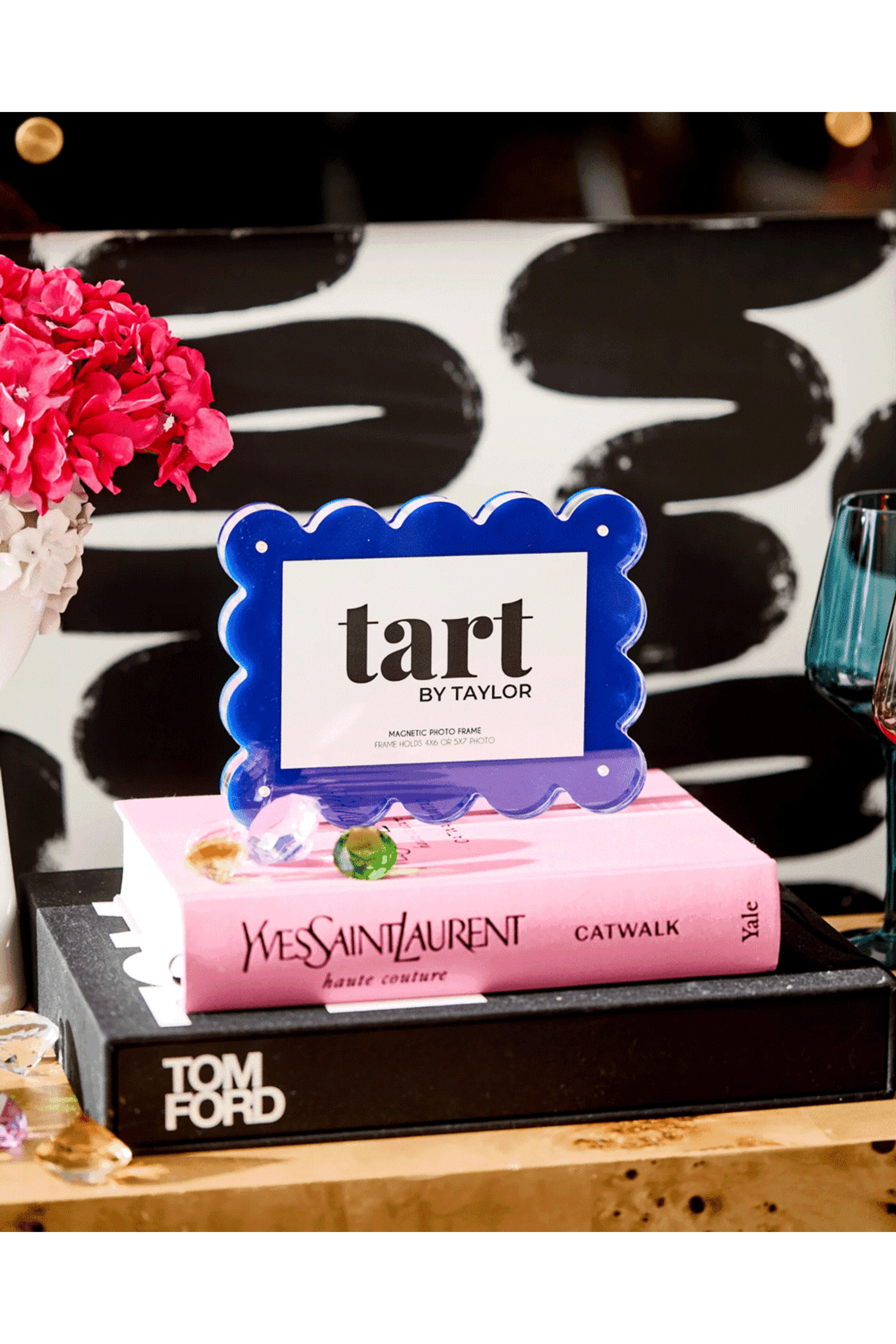 Two acrylic panels simply attach together using four industrial strength magnets. Scallop design. Self-standing frame. Frame holds up to a 4x6 OR 5x7 photo. 8 L x 6 W x 1 D.