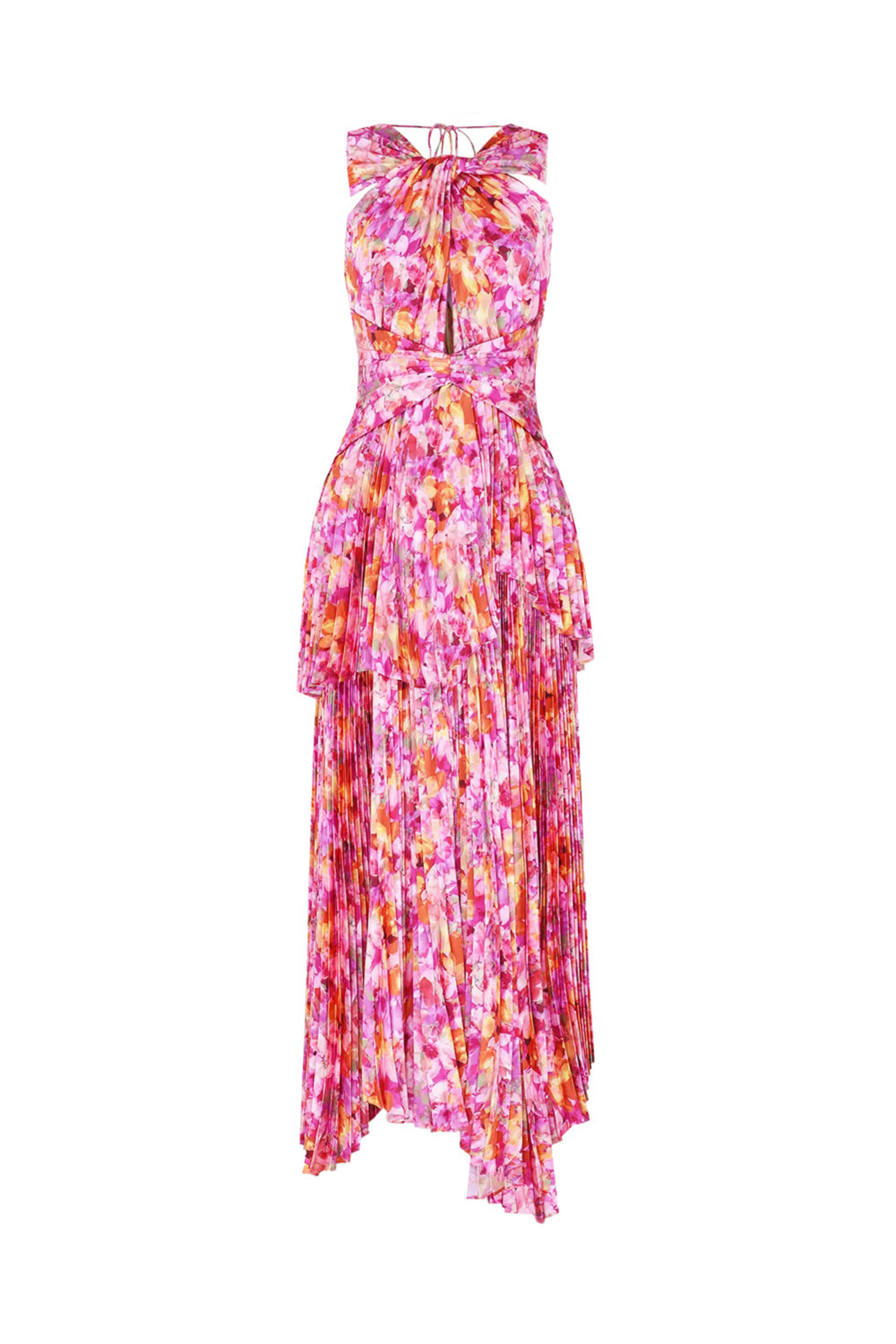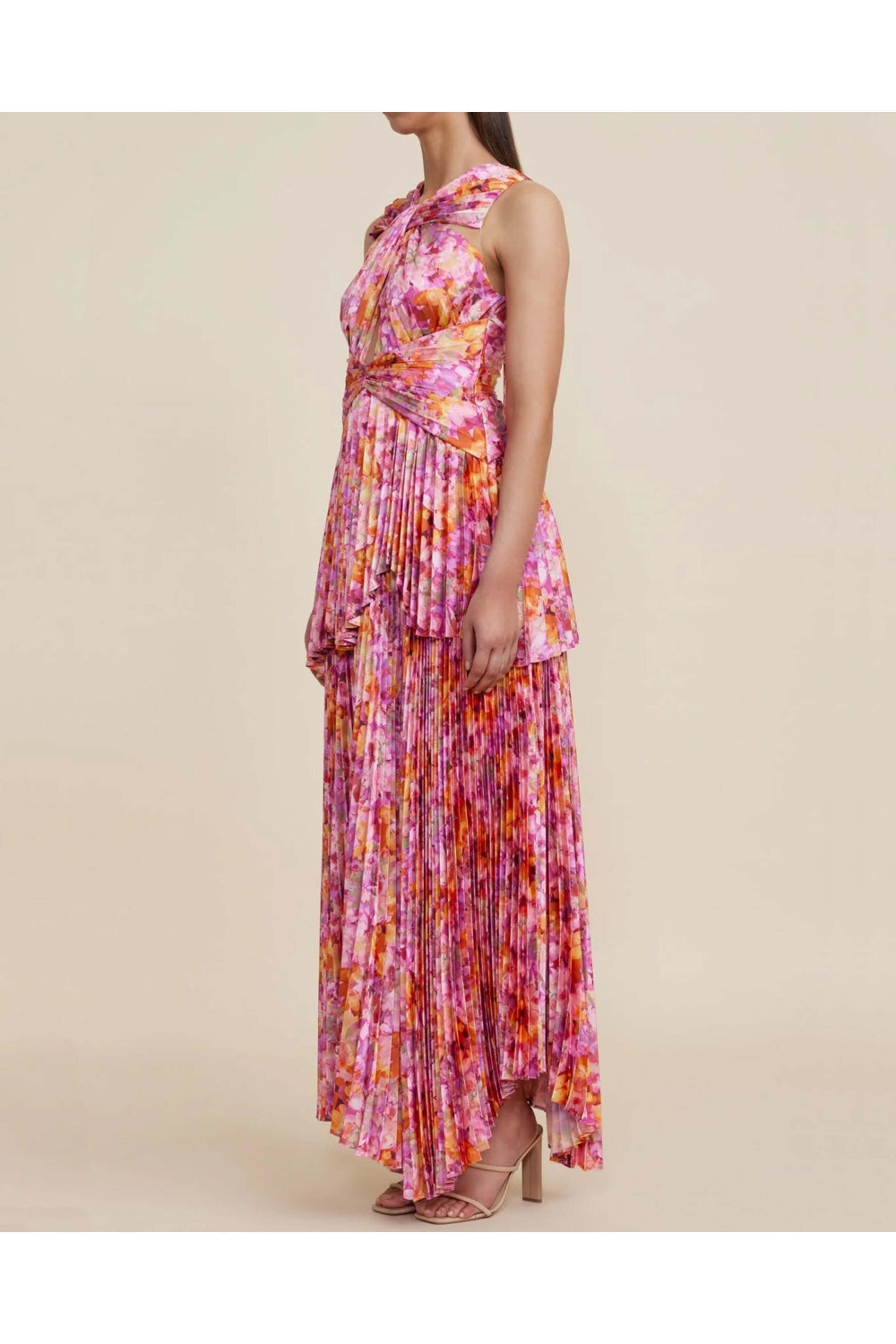 Acler Lotus Sleeveless Ormond Gown. V neck; twist detail. Back v; self-tie closure. Cutout detail at front. Concealed back zip closure. Pleated throughout. Tiered silhouette. Asymmetrical hem. Maxi length. 100% polyester.