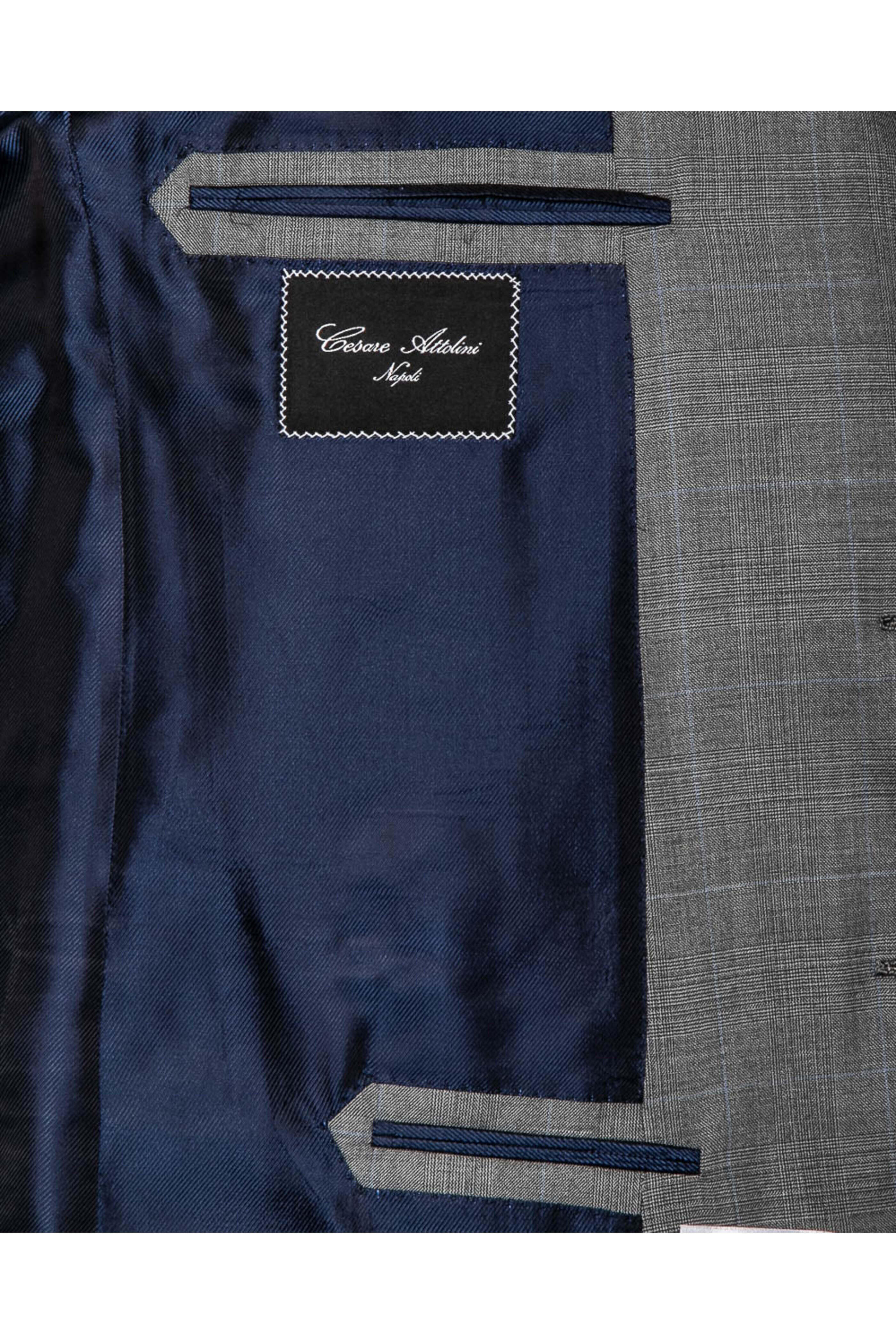 - Cesare Attolini Grey Glen Plaid with Light Blue Windowpane Suit Two button jacket Notch lapel Pick stitch detailing Front left chest pocket Flap waist pockets Fully lined Double back vents Flat front pant: Zip fly Three button closure On seam waist pockets Coin pocket Double welt button back pockets 10.5 rise 7.5 hem opening Drop: 7 100% wool 170s Made in Italy