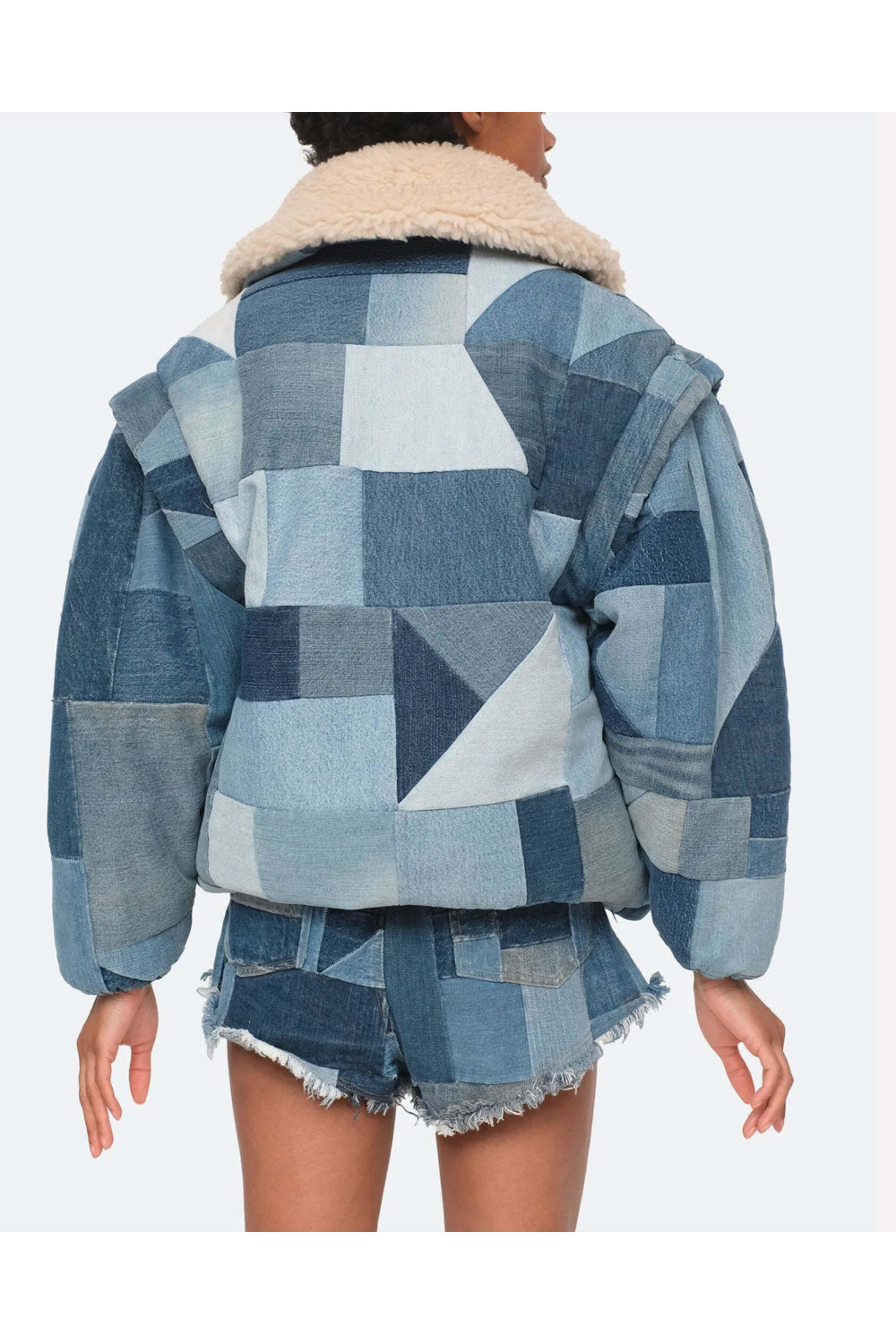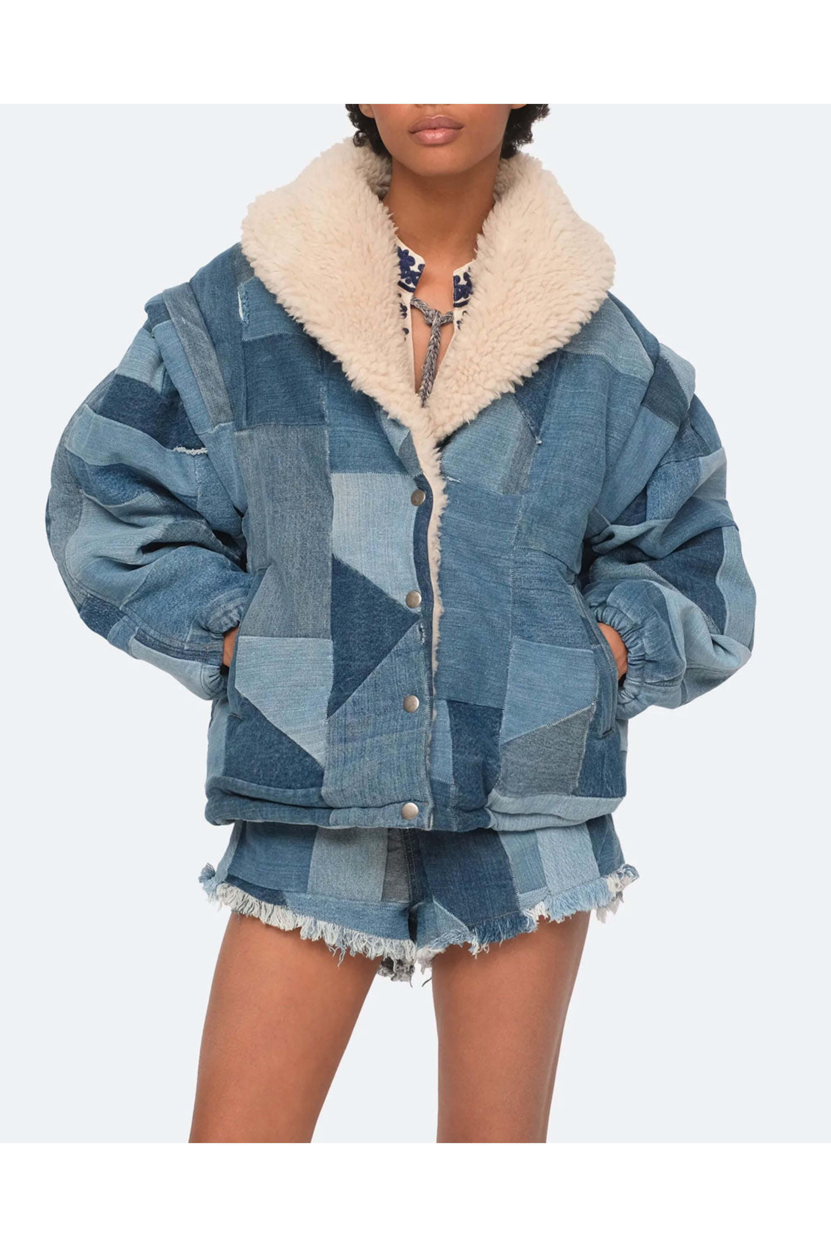 Sea Multi Diego Denim Patch Coat. Shawl collar. Extended shoulders. Voluminous long sleeves; elasticized cuffs. Snap button up front closure. Front slant pockets. Oversized fit. Sherpa fleece lined. 100% Cotton.