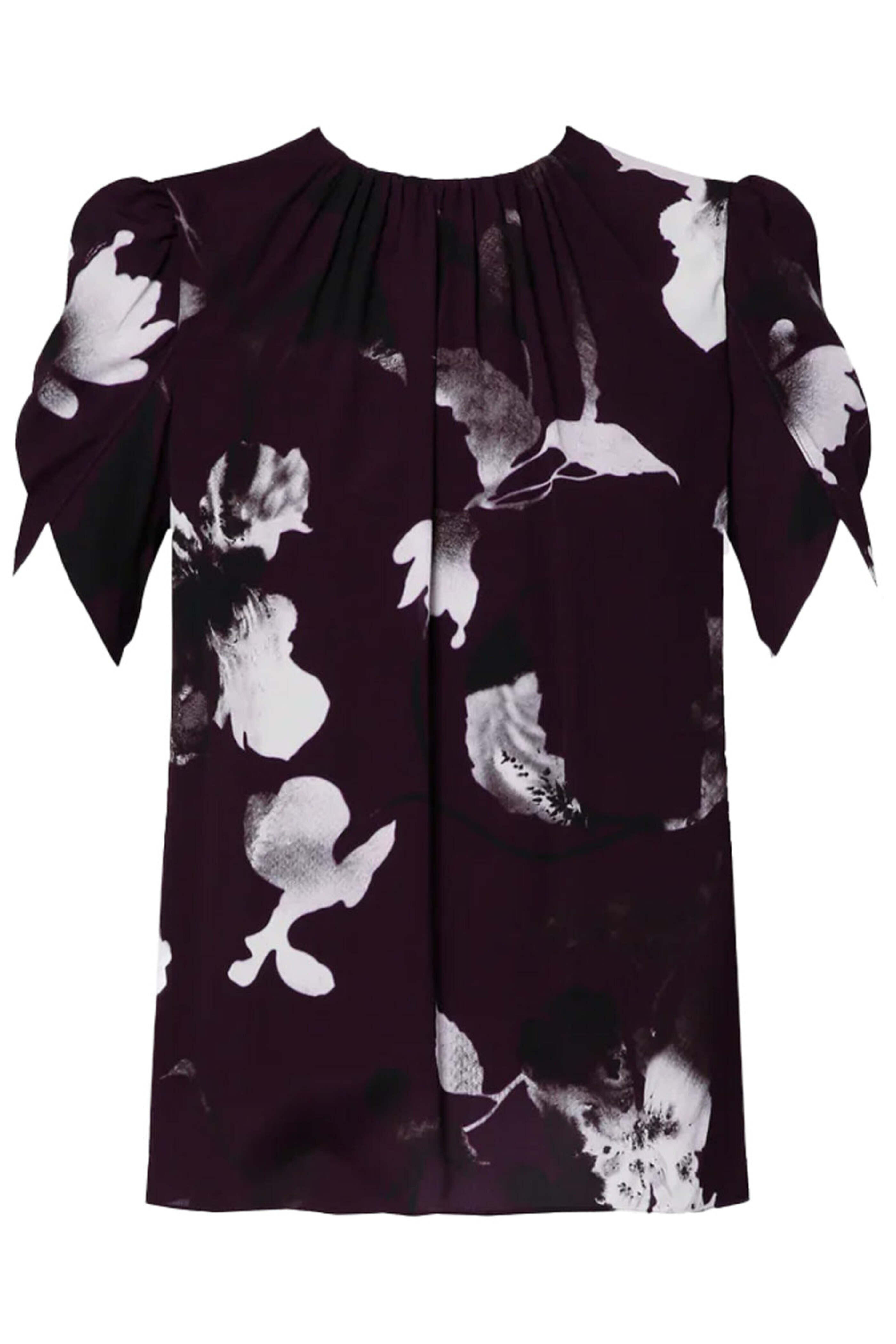 ERDEM Purple Evelyn Short Sleeve Blouse. Round neck. Puff shoulders. Short tulip sleeves. Gathered detail at neck. Relaxed fit. Lined. 100% viscose outer, 73% acetate, 27% silk lining.
