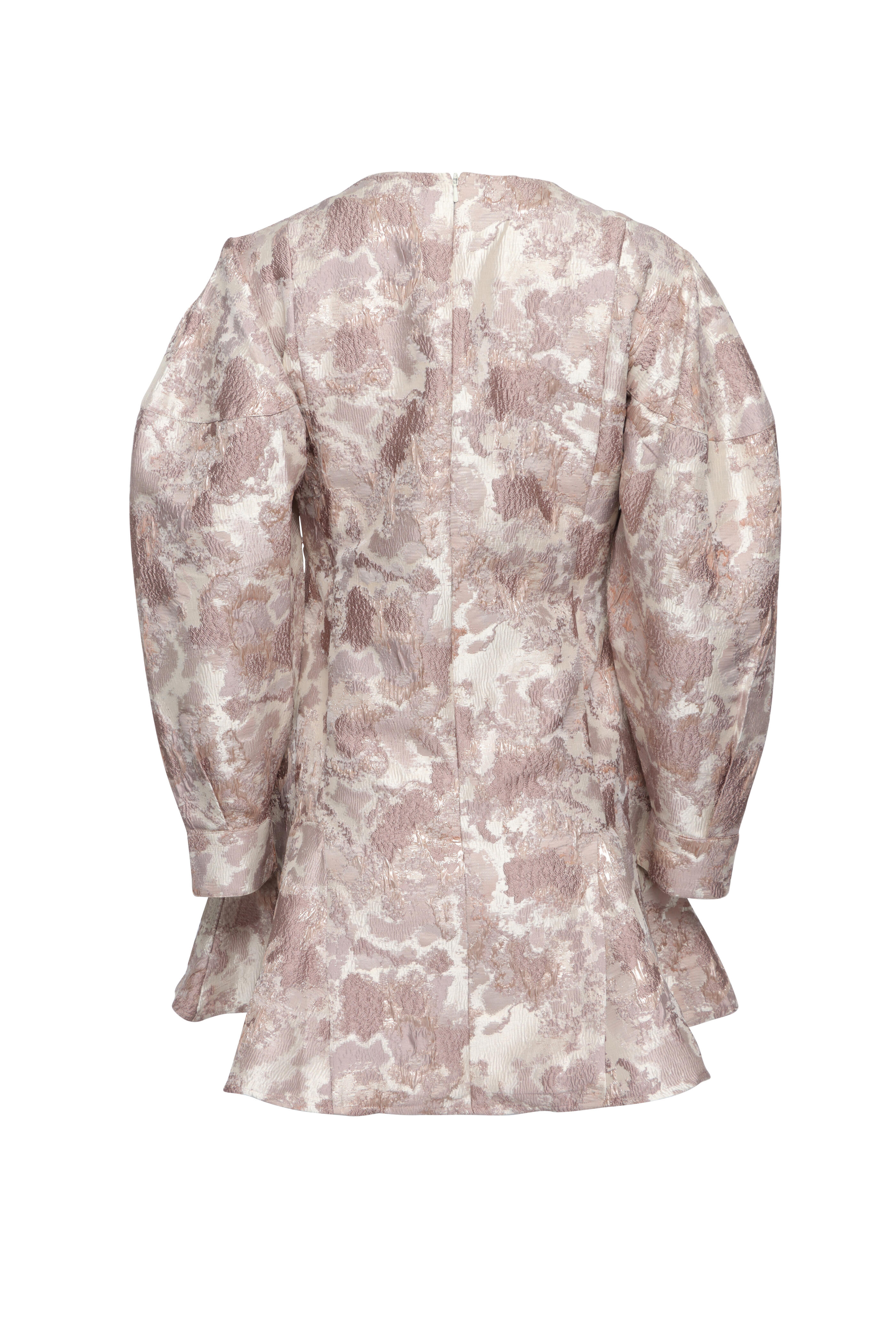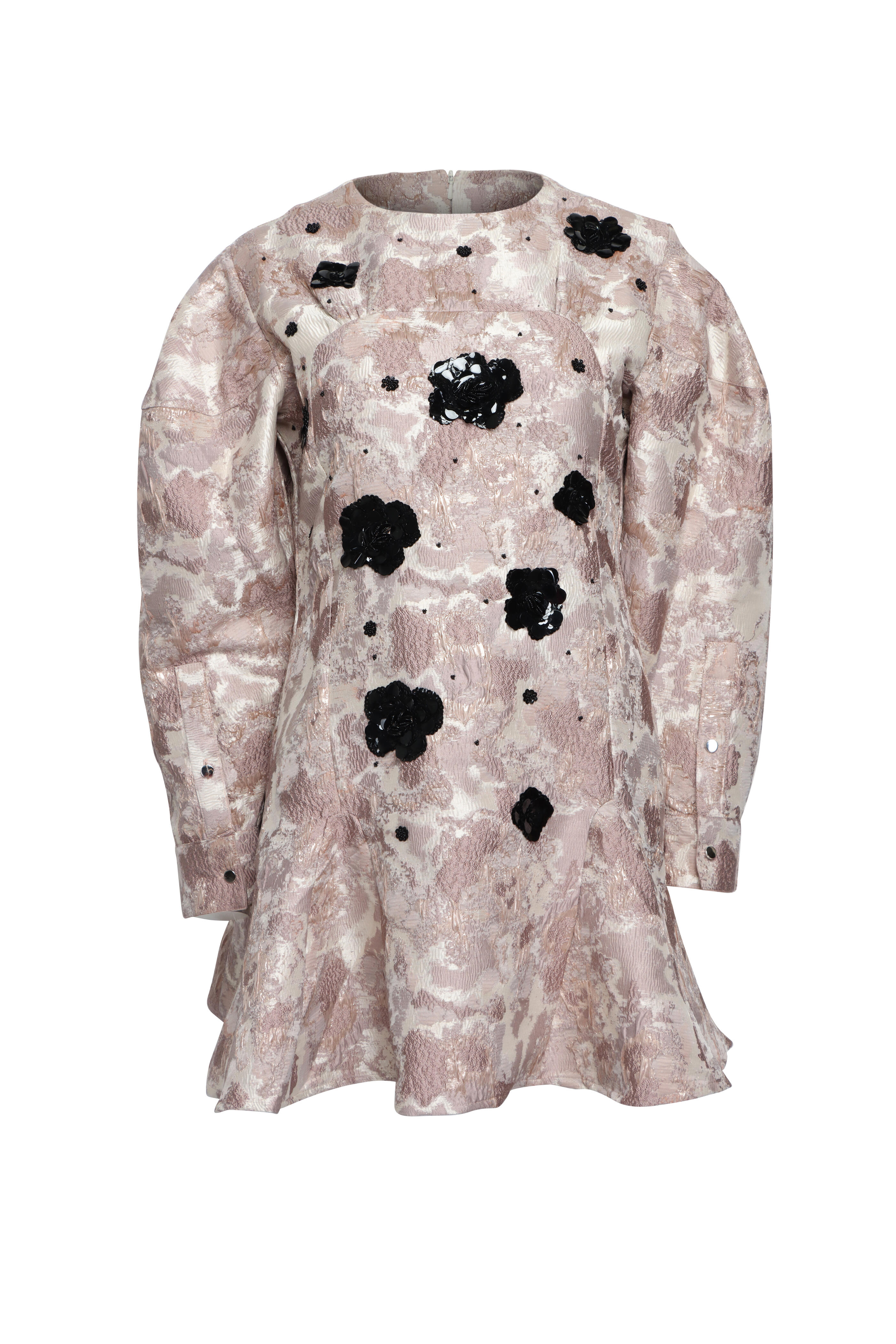 Round neck. Puff shoulders. Long sleeves; button cuffs. Concealed back zip closure. Flounce hem. Jacquard fabrication. Sequin embellishment throughout. Imported. Mini length. 88% polyester, 12% metallic. Dry clean.