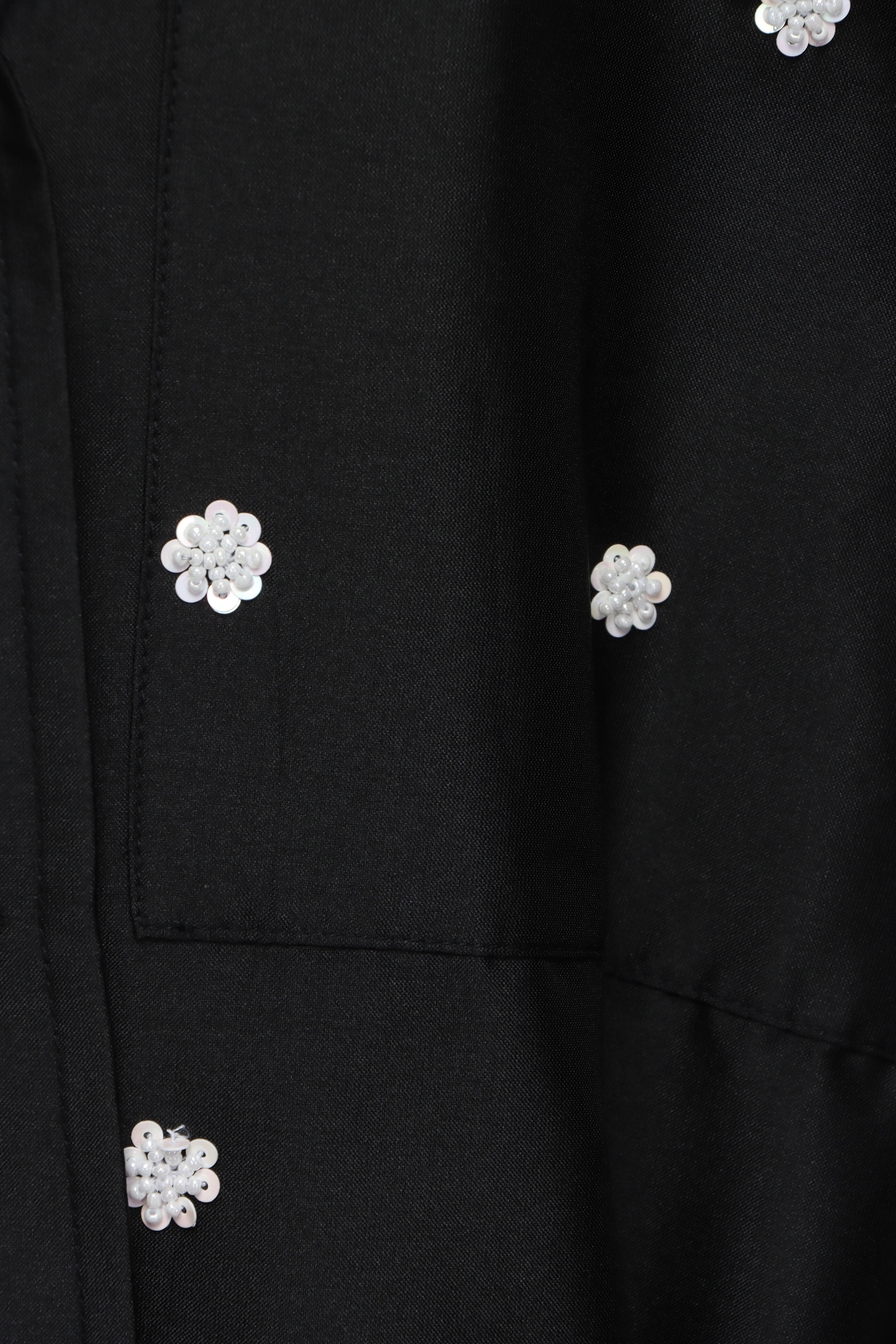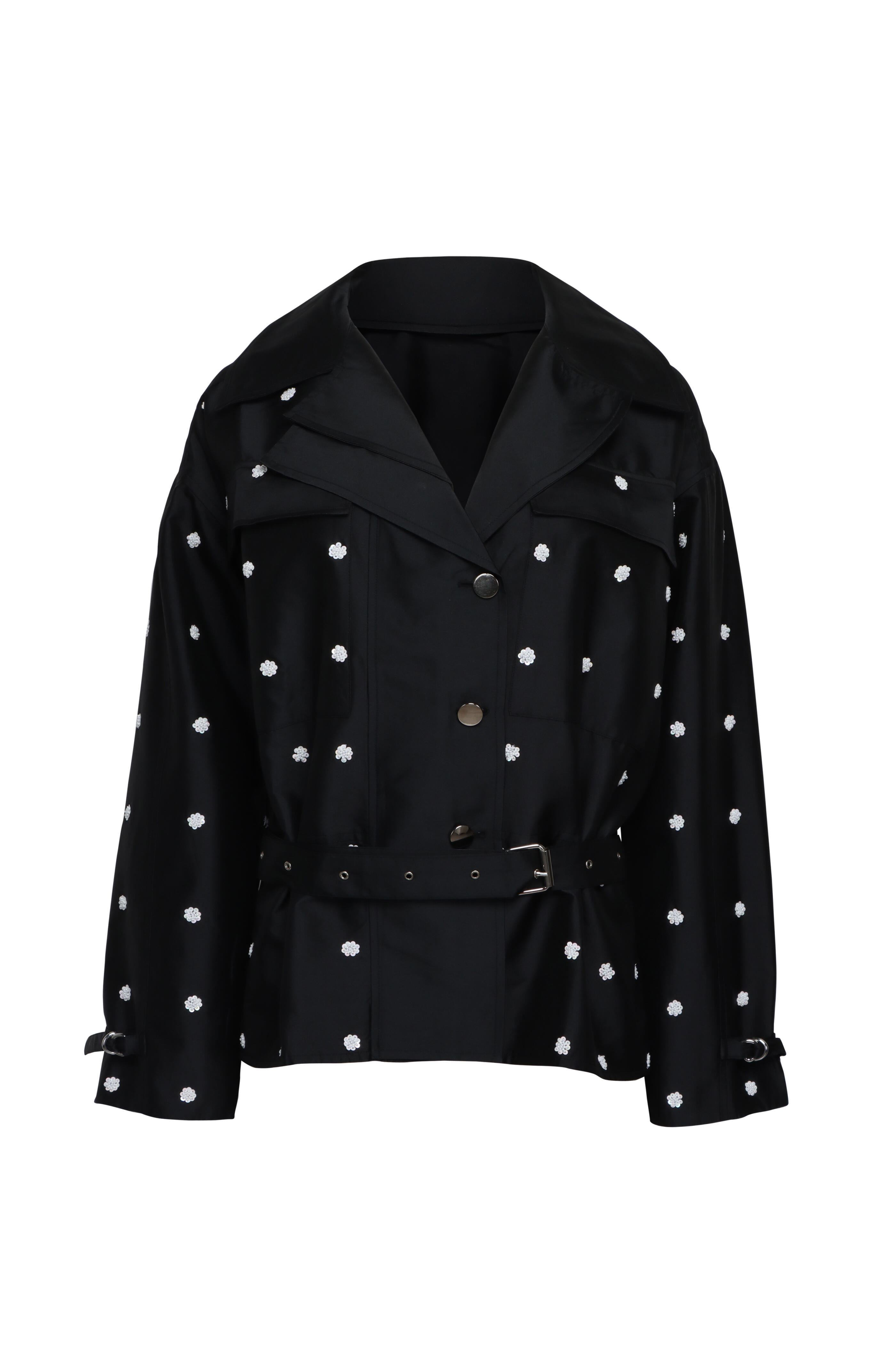 Oversized notch collar. Drop shoulders. Long sleeves; d-ring tab cuffs. Chest flap pockets. Button up front closure. Adjustable buckle belt. Relaxed fit. Sequin detail throughout. Imported. 100% polyester. Dry clean.