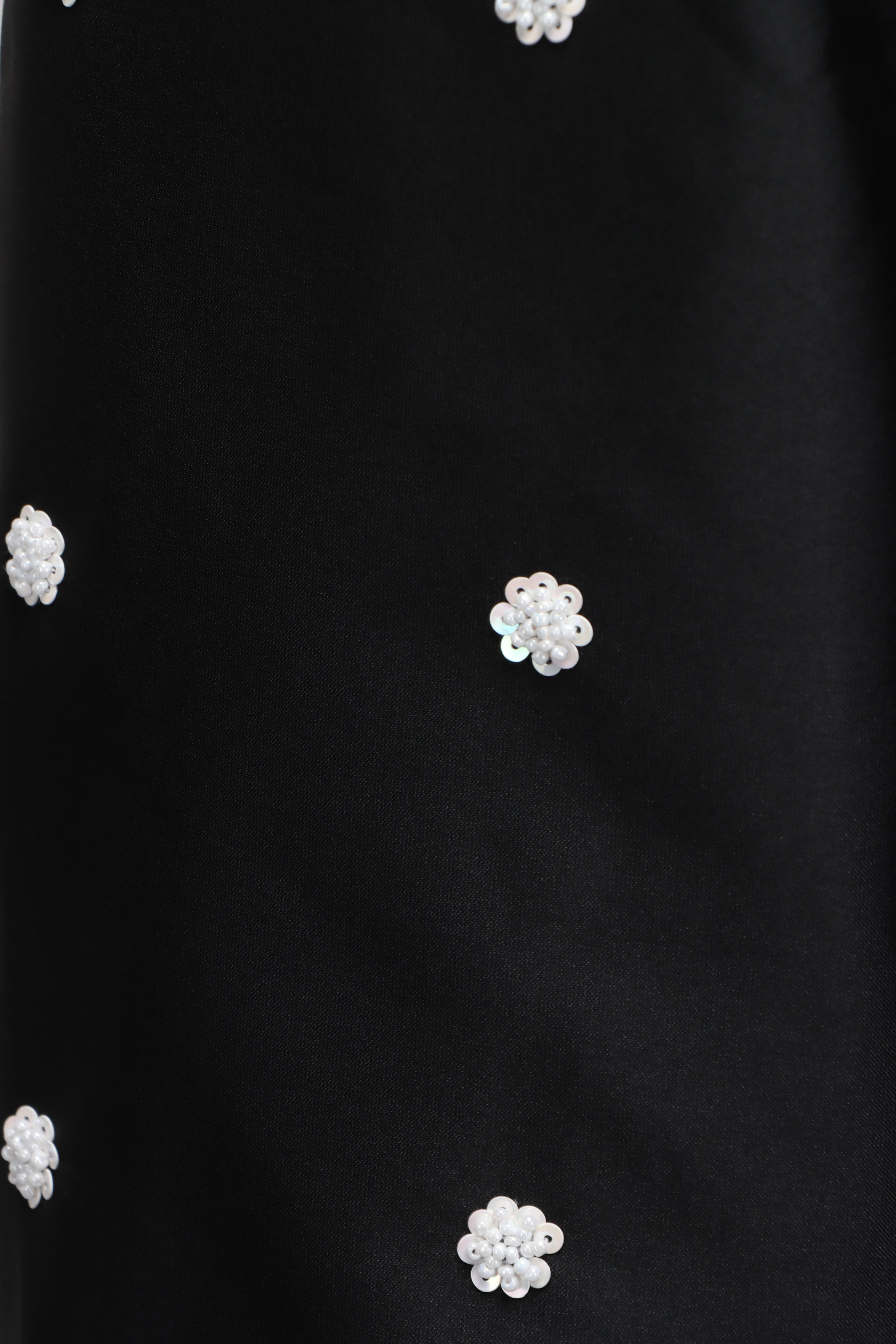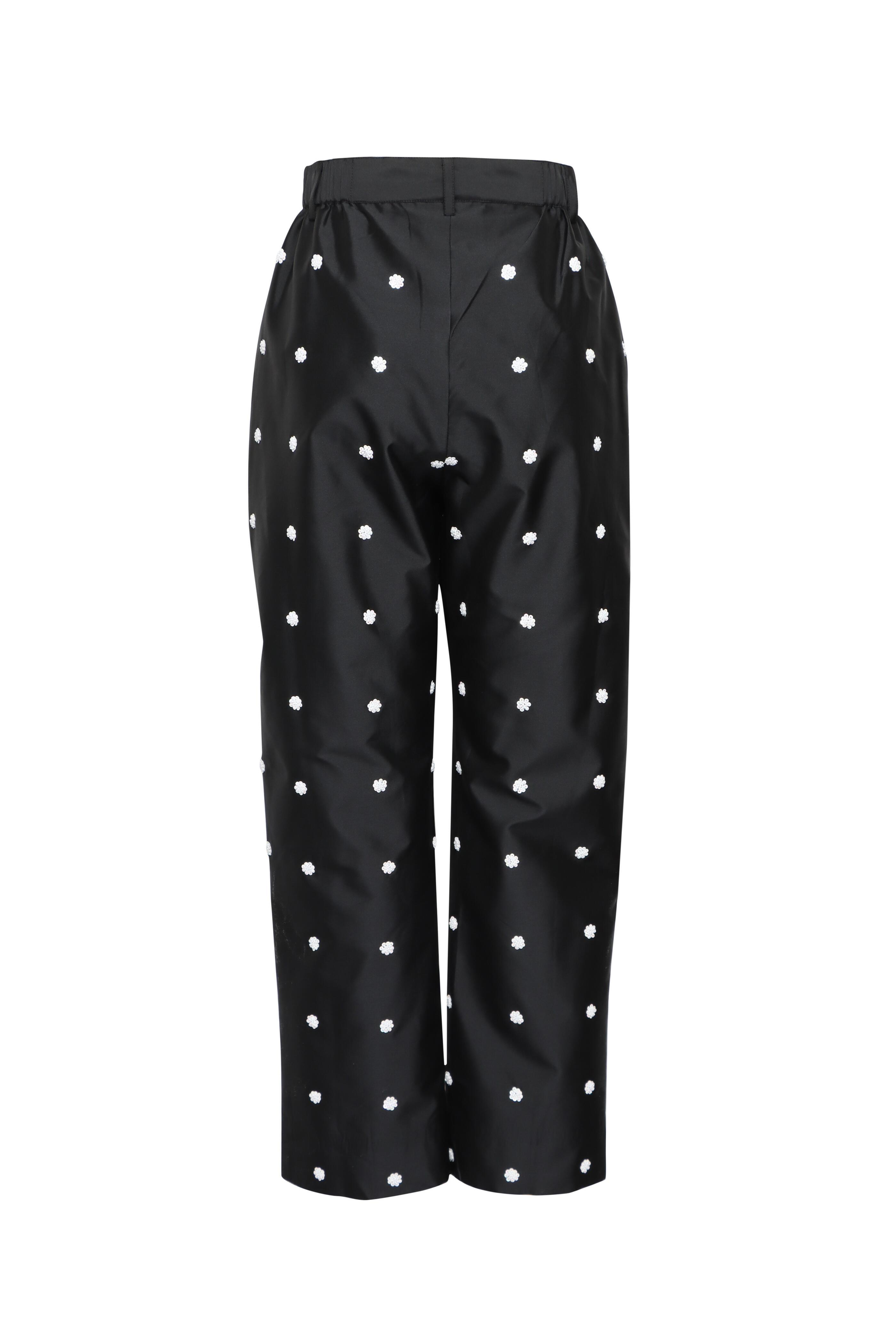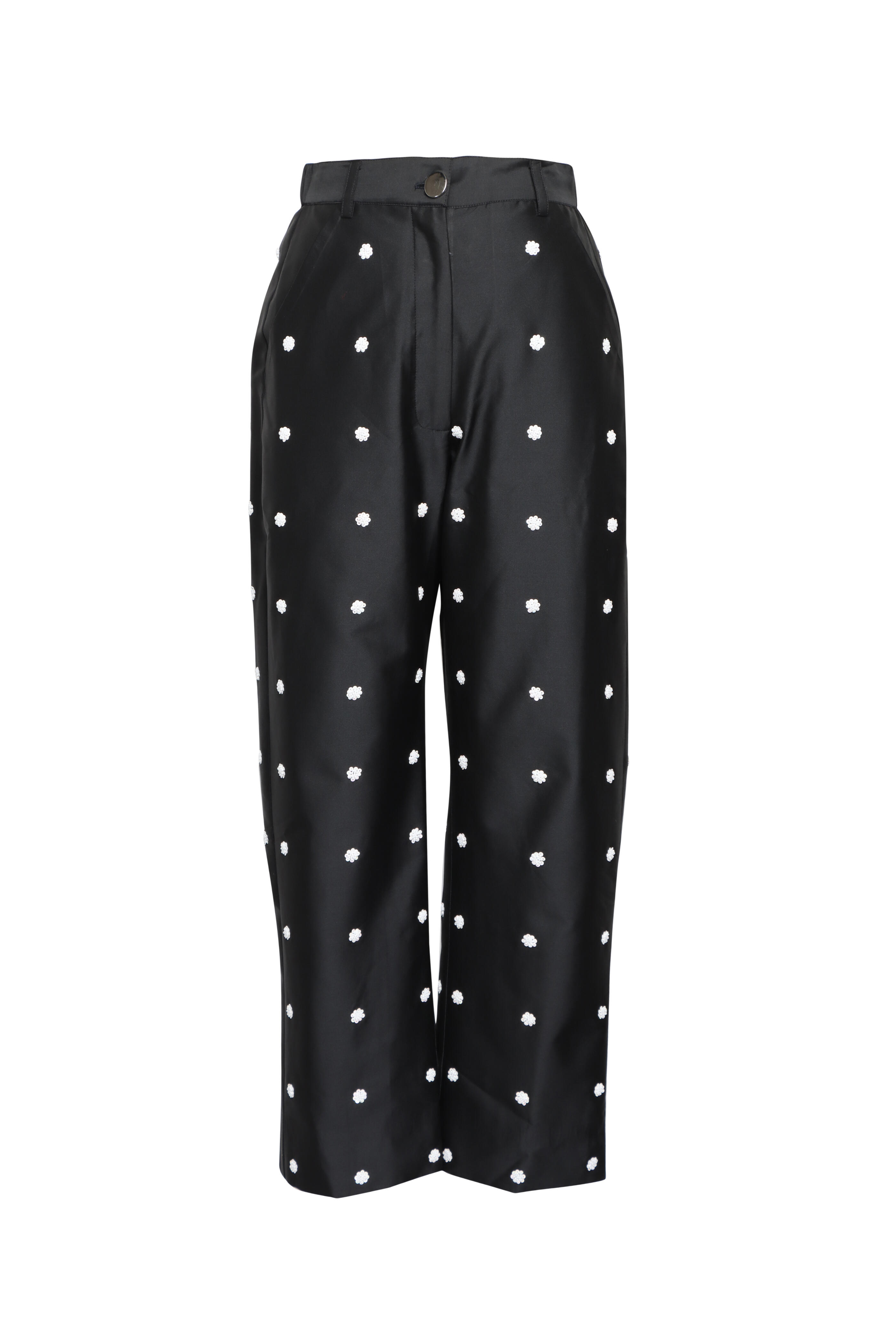 High rise. Button closure. Zip fly. Belt loops. Straight through leg. Sequin detail throughout. Imported. Cropped length. 100% polyester. Dry clean.