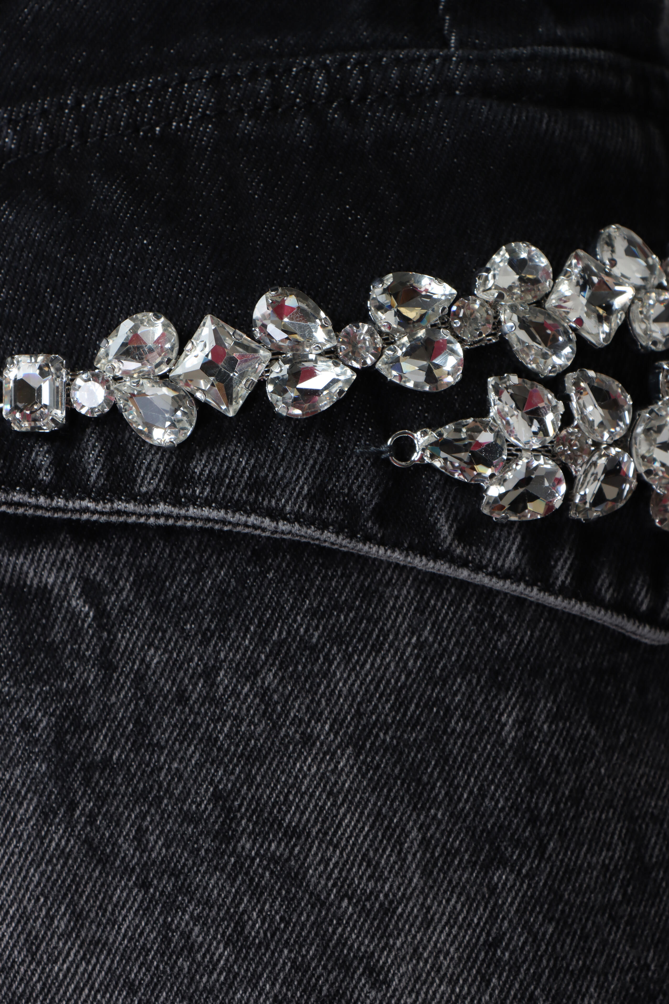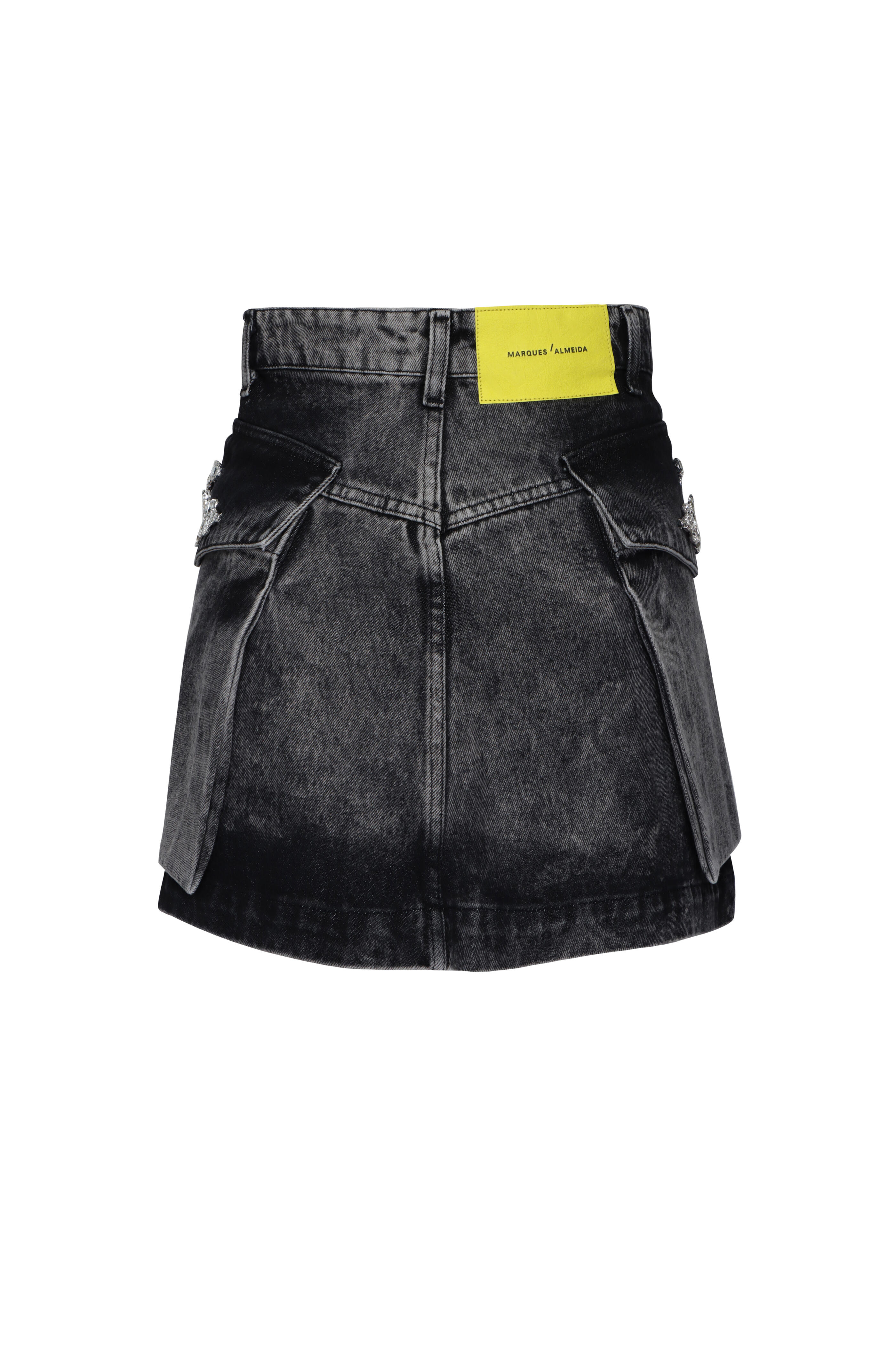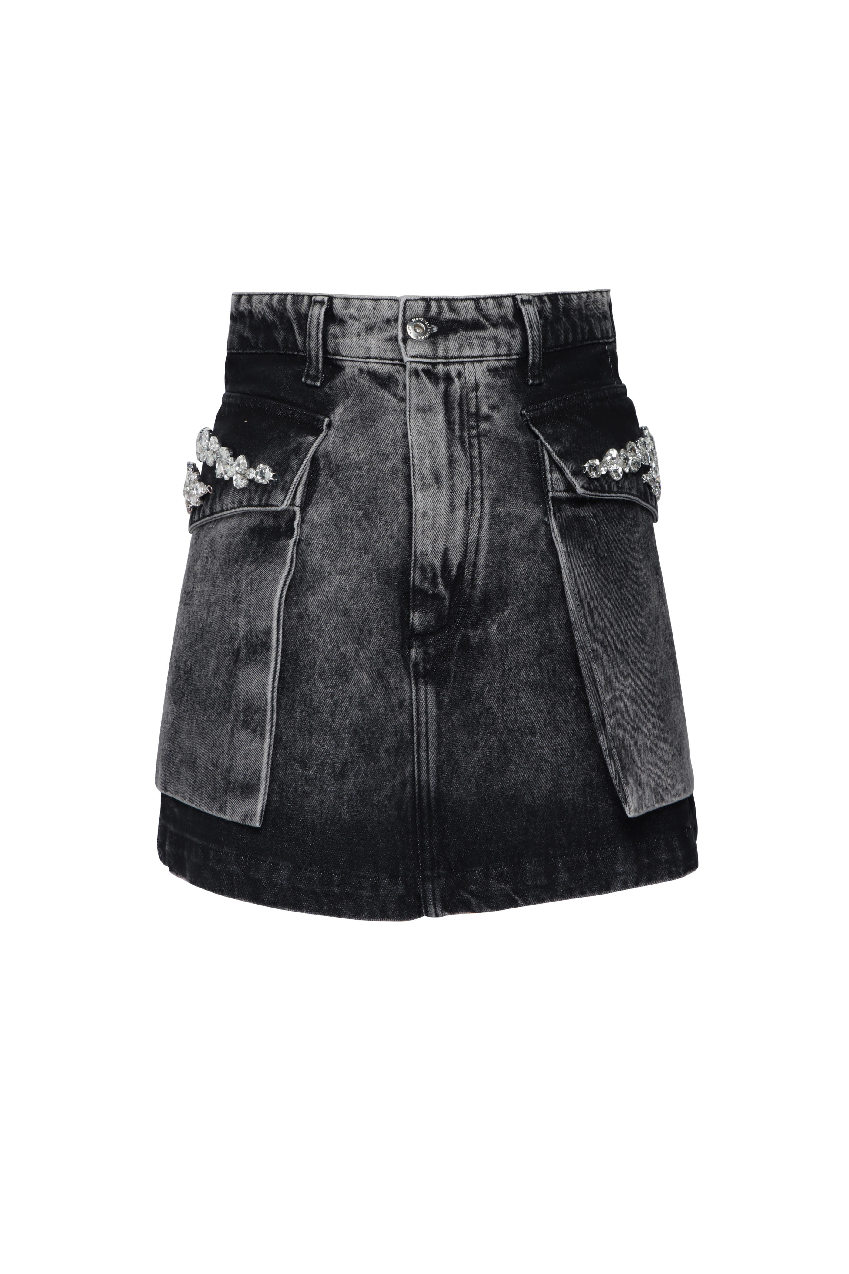 High rise. Button closure. Zip fly. Belt loops. Cargo pockets; embellished detail. Aline silhouette. Denim fabrication. Imported. Mini length. 100% organic cotton. Dry clean.