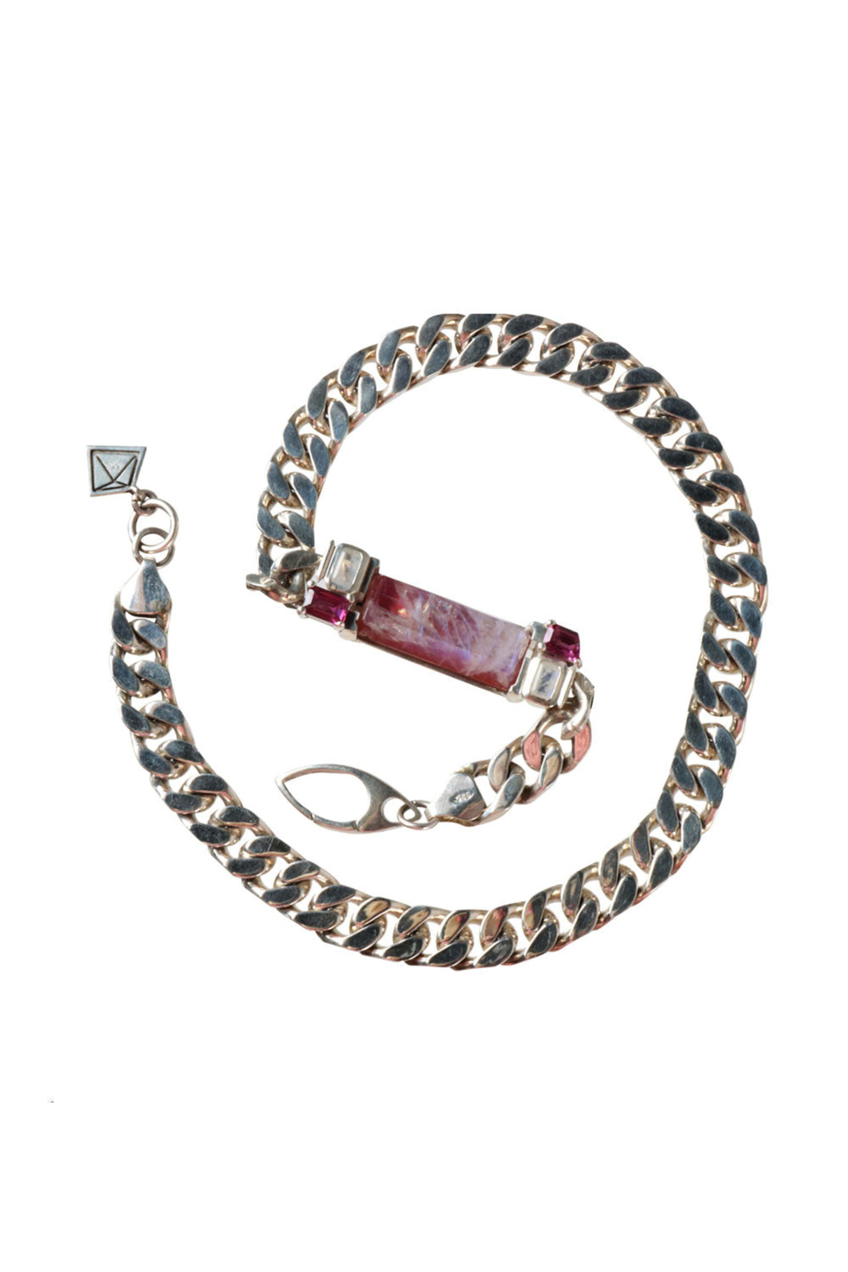 Ferocity Jewelry Jasper Moonstone and Garnet Double Wrap Bracelet. Sterling silver. Jasper. Moonstone. Doublet garnet. Curb chain. Double wrap design. Lobster clasps.