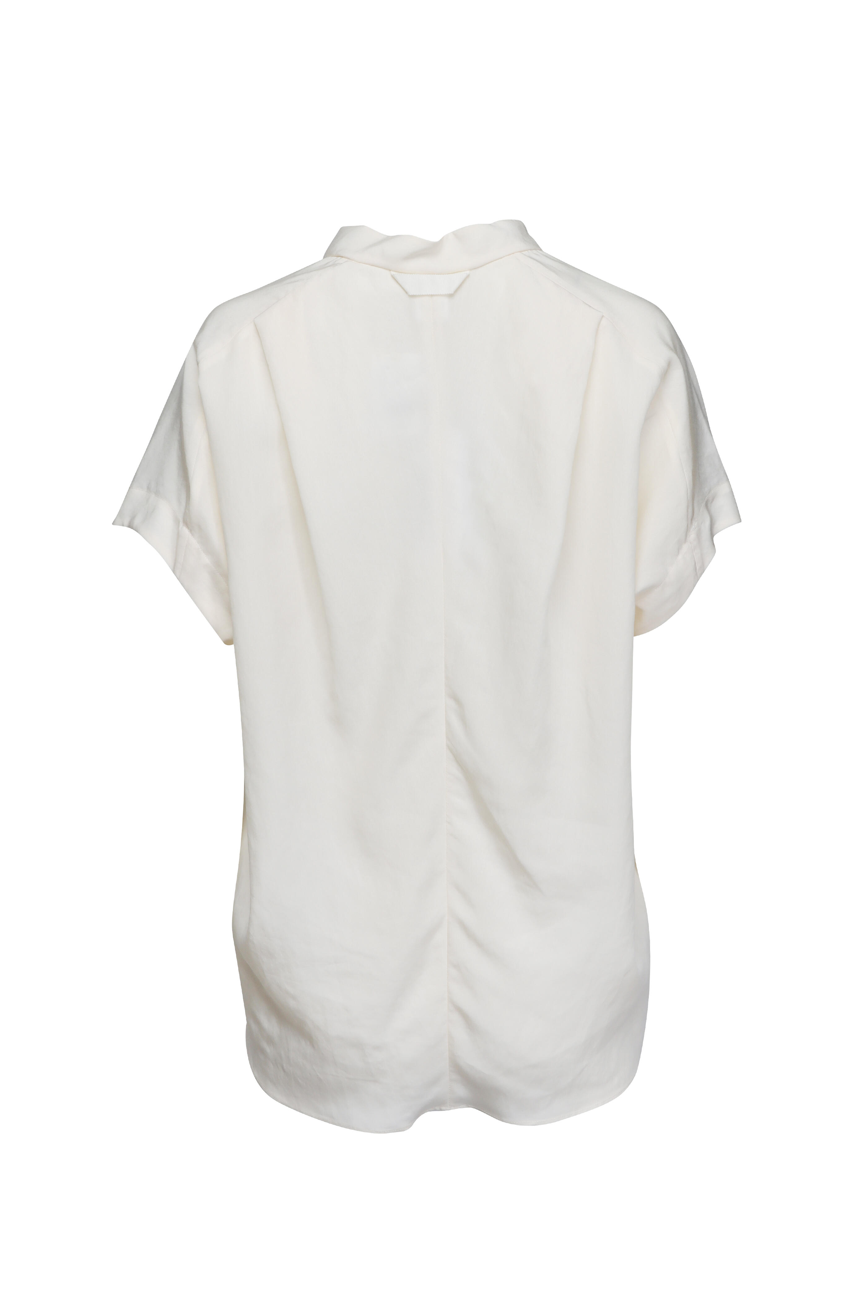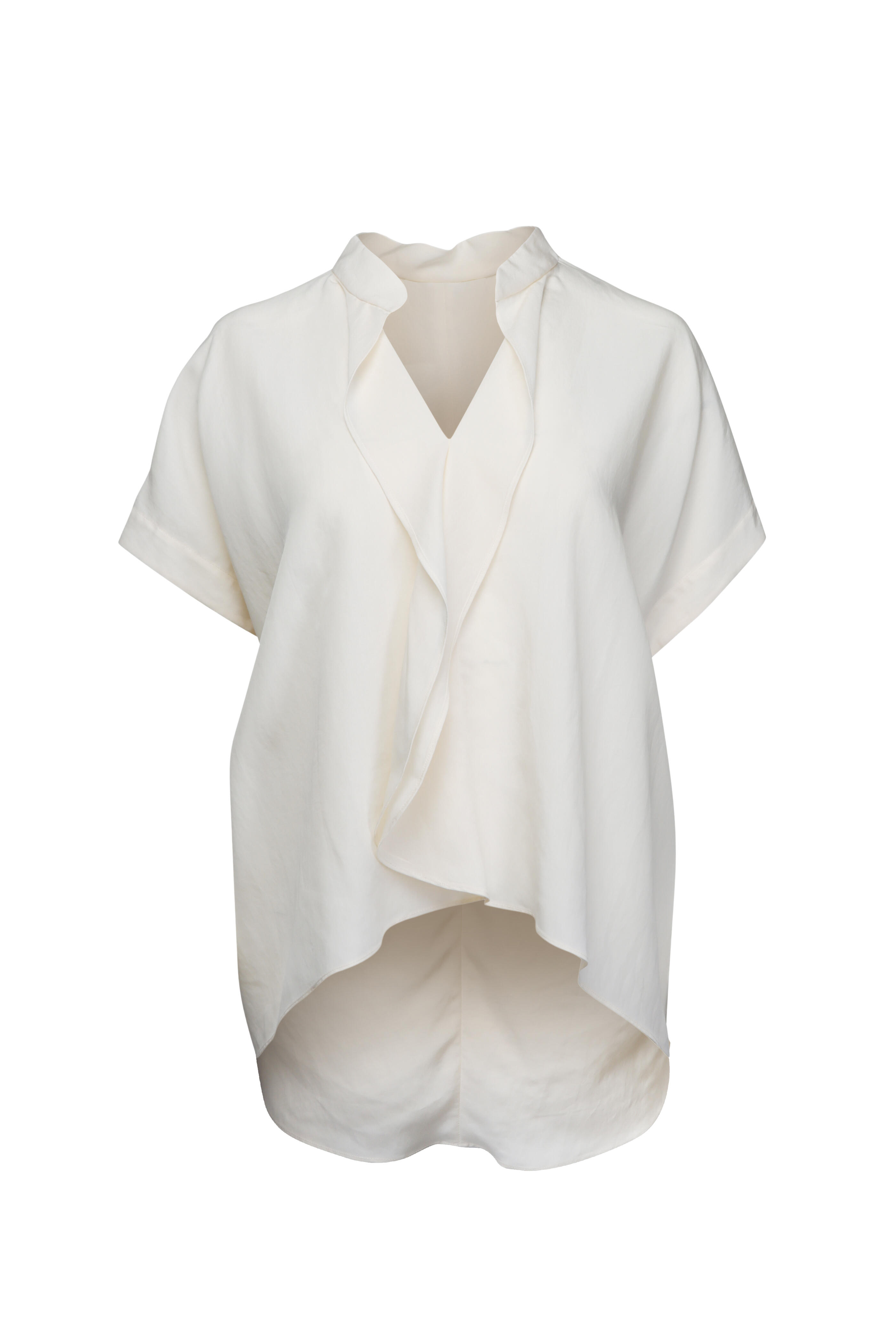 Stand collar. V neck. Short dolman sleeves. Front ruffle neckline and center front. Relaxed fit. Rounded back hem. Made in NYC. Bust 53.75” (US 4-includes drape). Length 27” (US 4). 91% lyocell, 9% nylon. Handwash.