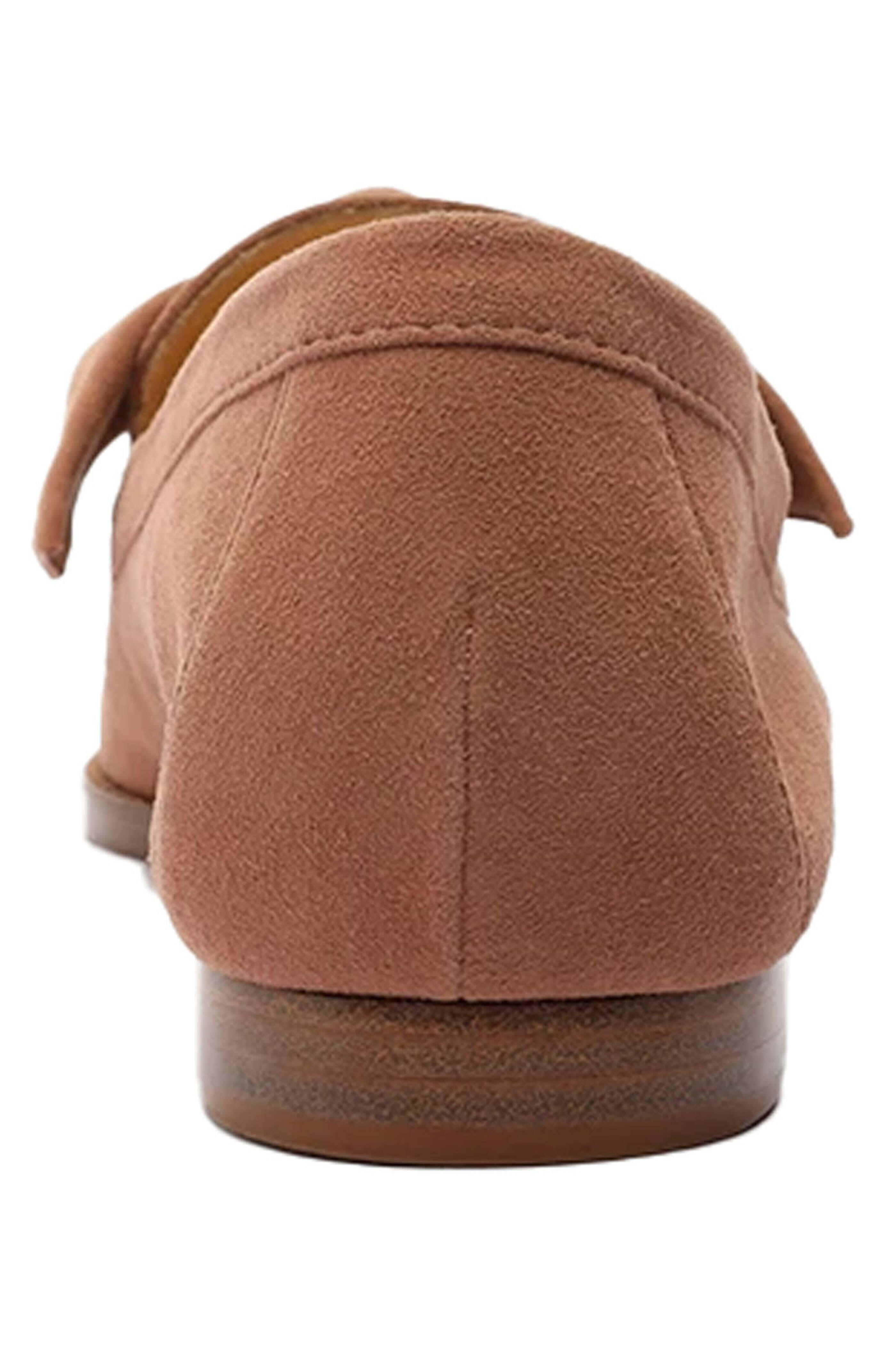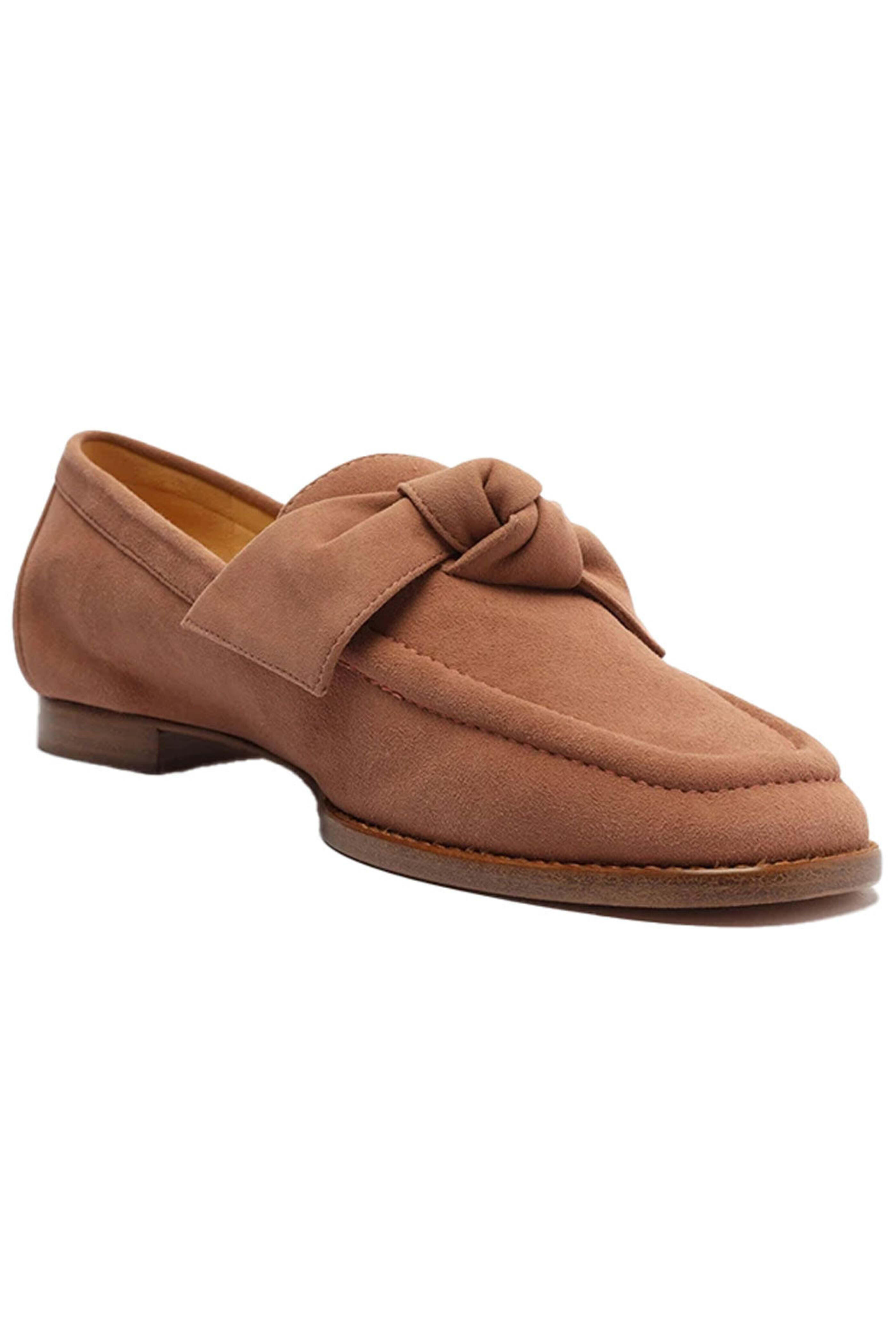 Alexandre Birman Maxi Clarita Suede Loafer in Clay. Apron toe. Slip on. Signature bow accent. 0.3 in. stacked heel. Leather upper. Leather sole.