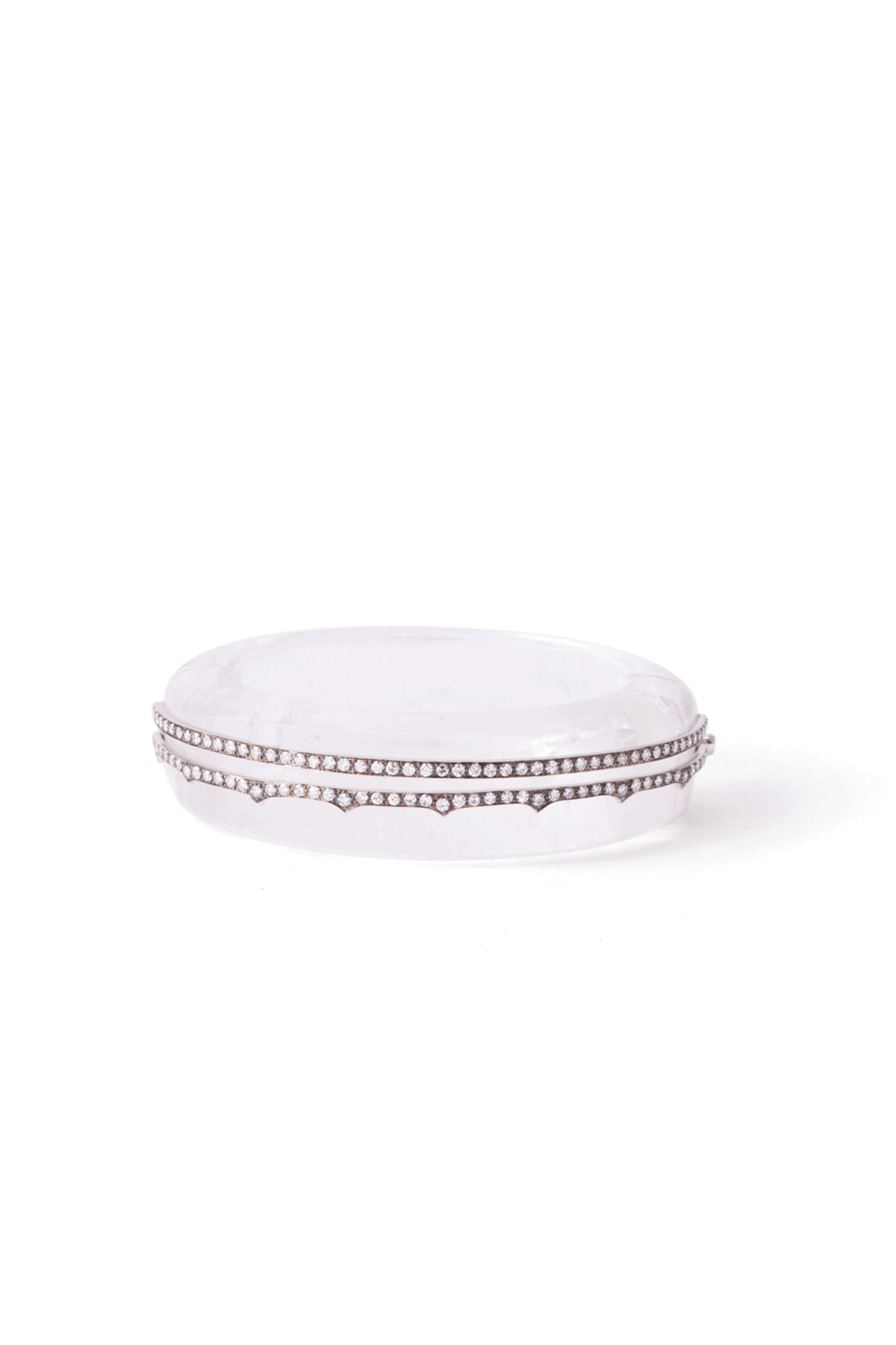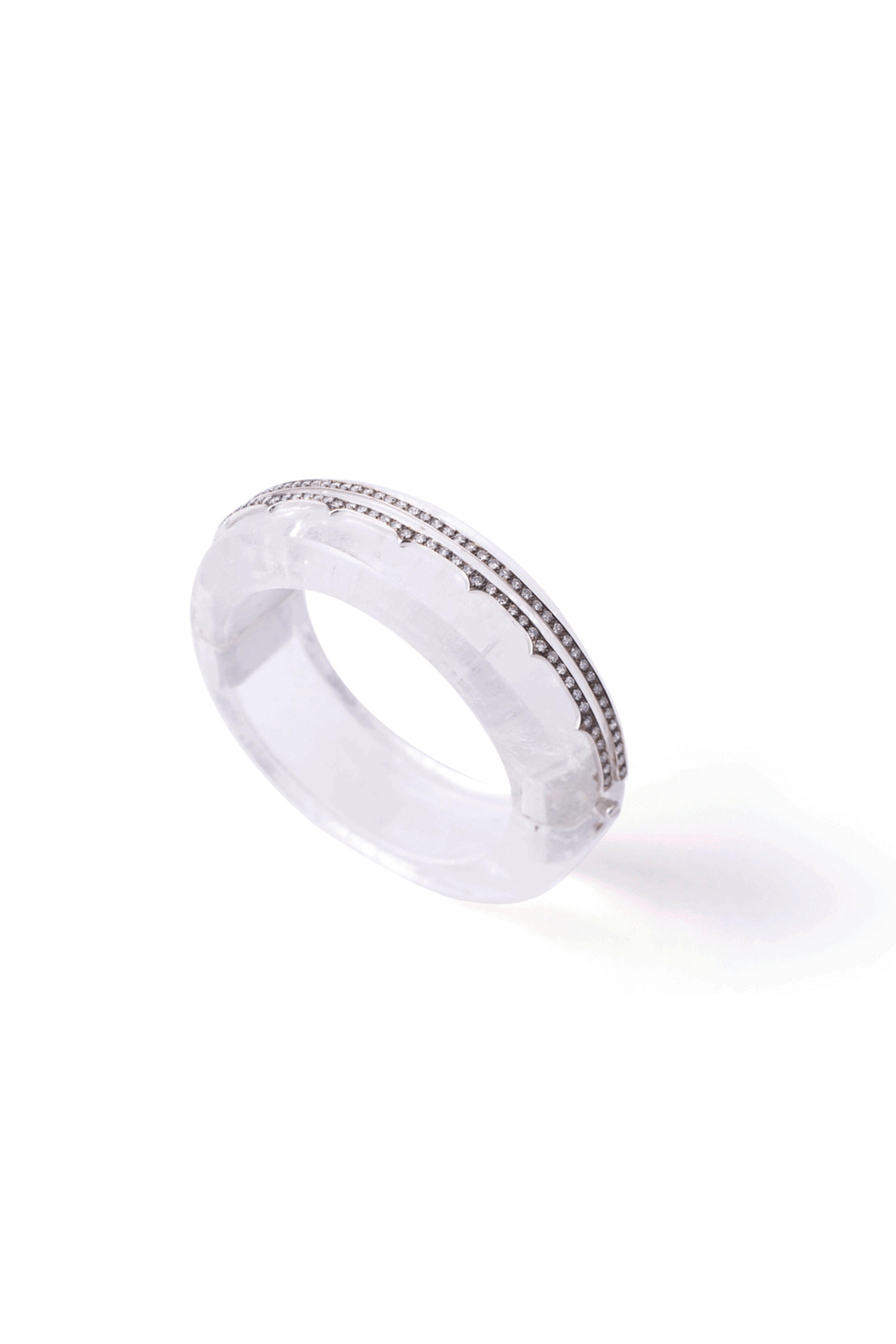 Sylva & Cie White Quartz Bangle. 18k gold. White quartz. Diamond. Two diamond rows. Prong setting. Spike detailing. Bangle style. Slip-on. Made in the USA.