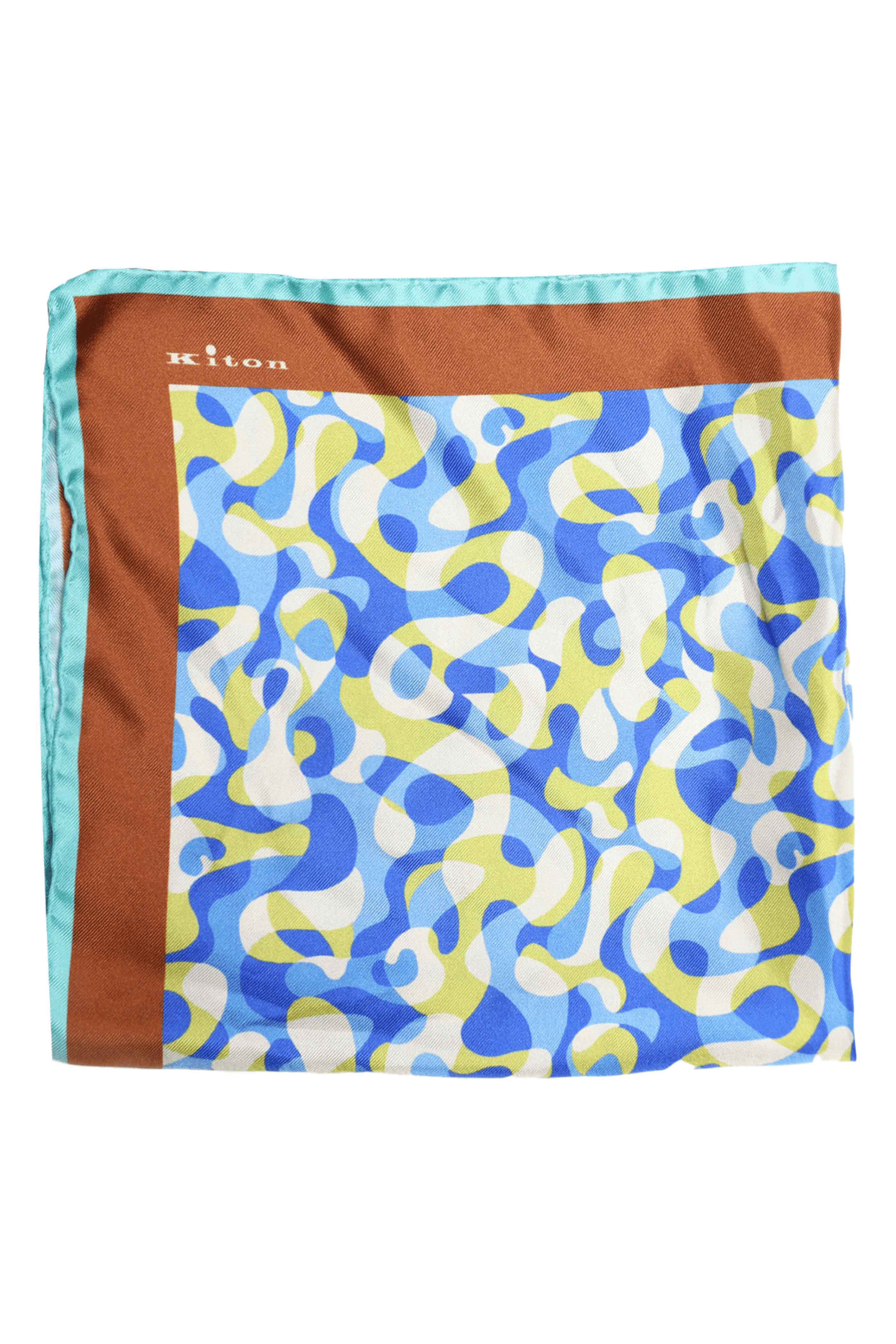 Kiton Sky Blue Gold and Beige Swirl Silk Pocket Square. 15.5 x 15.5. Made in Italy. 100% silk.