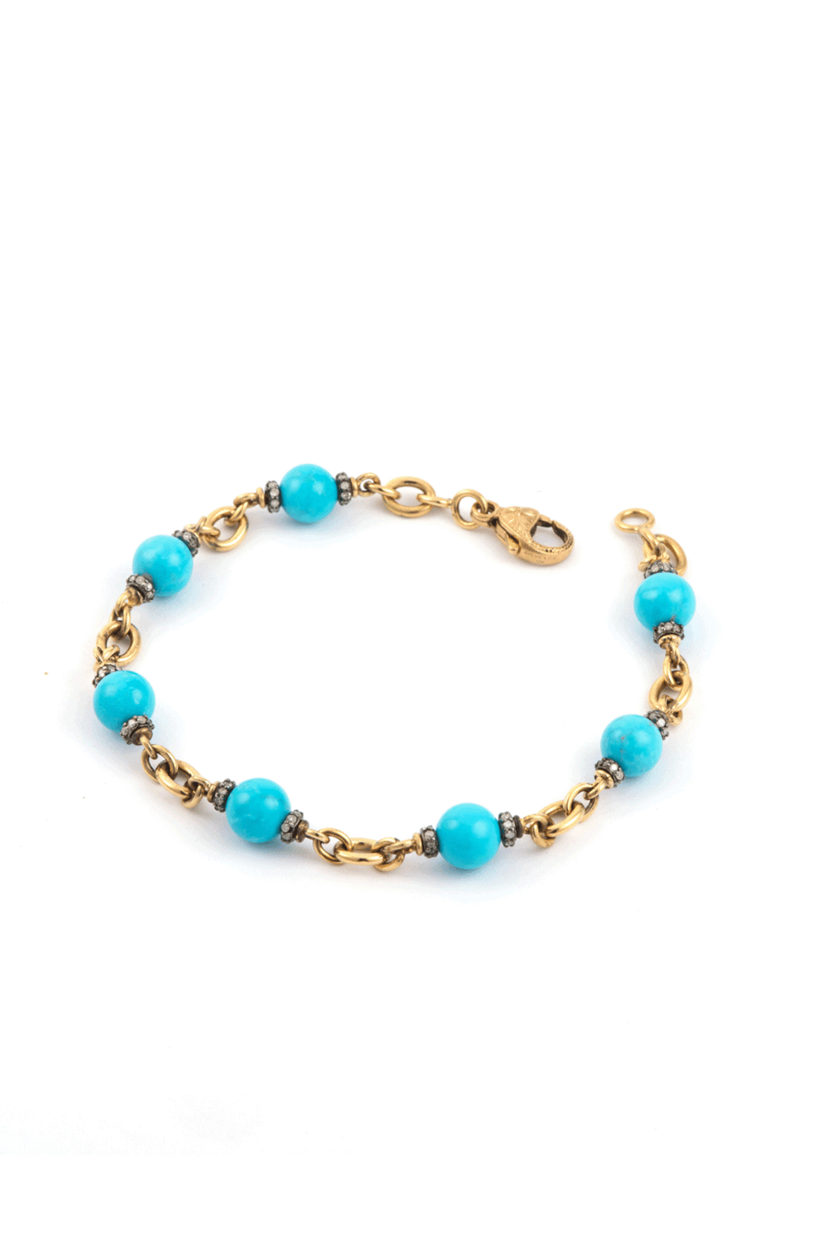 Sylva & Cie Turquoise Ball Bracelet. 18k gold. Turquoise. Diamond. Beaded. Chain link. 8 L. Lobster claw clasps. Made in the USA.