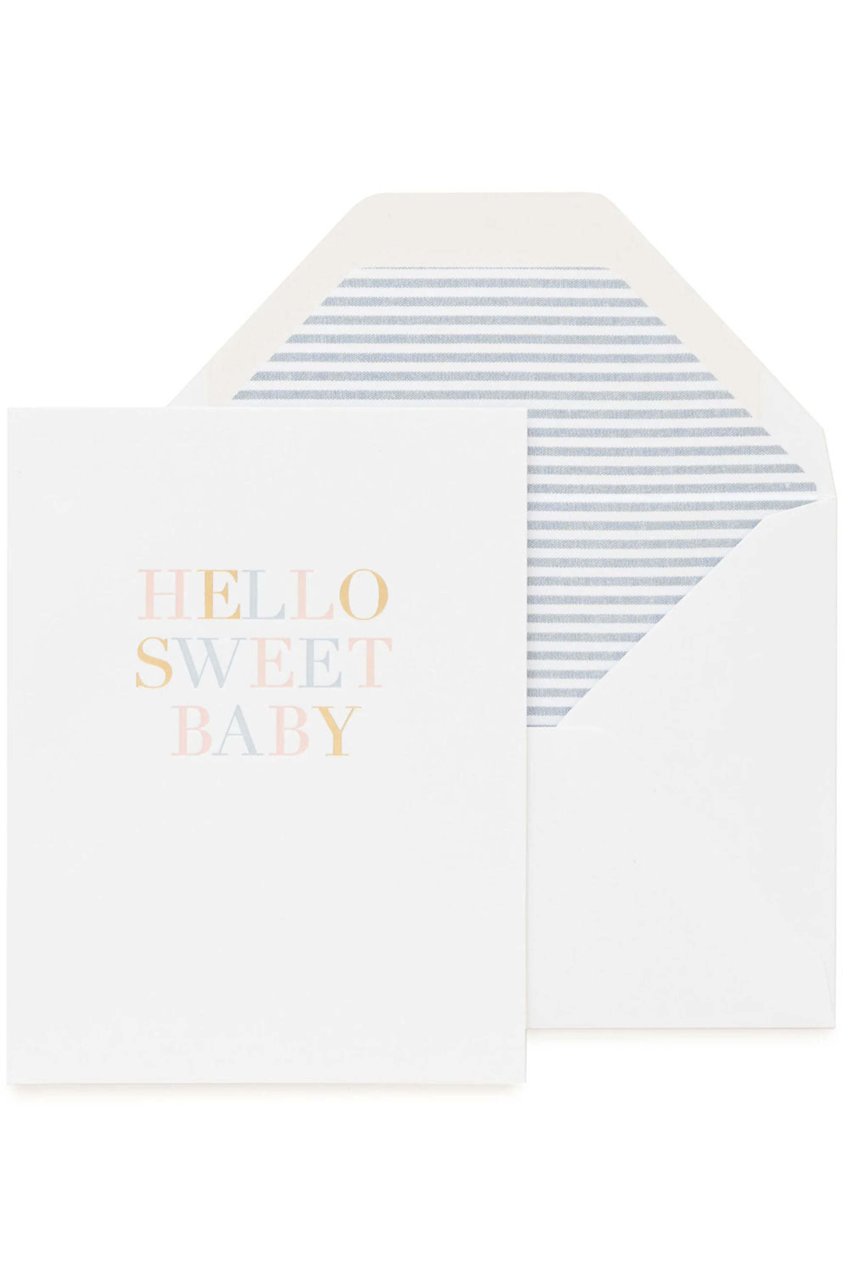 Sugar Paper Hello Sweet Baby Card. Baby greeting cards. Folded Card. Letterpress + Foil Printed. Blank interior. Crisp White Paper. Pale Pink Ink, Dusty Blue Ink, + Gold Foil. Crisp White Envelope. Dusty Blue Stripe Liner. 4.25 x 5.5. Hand printed in LA.