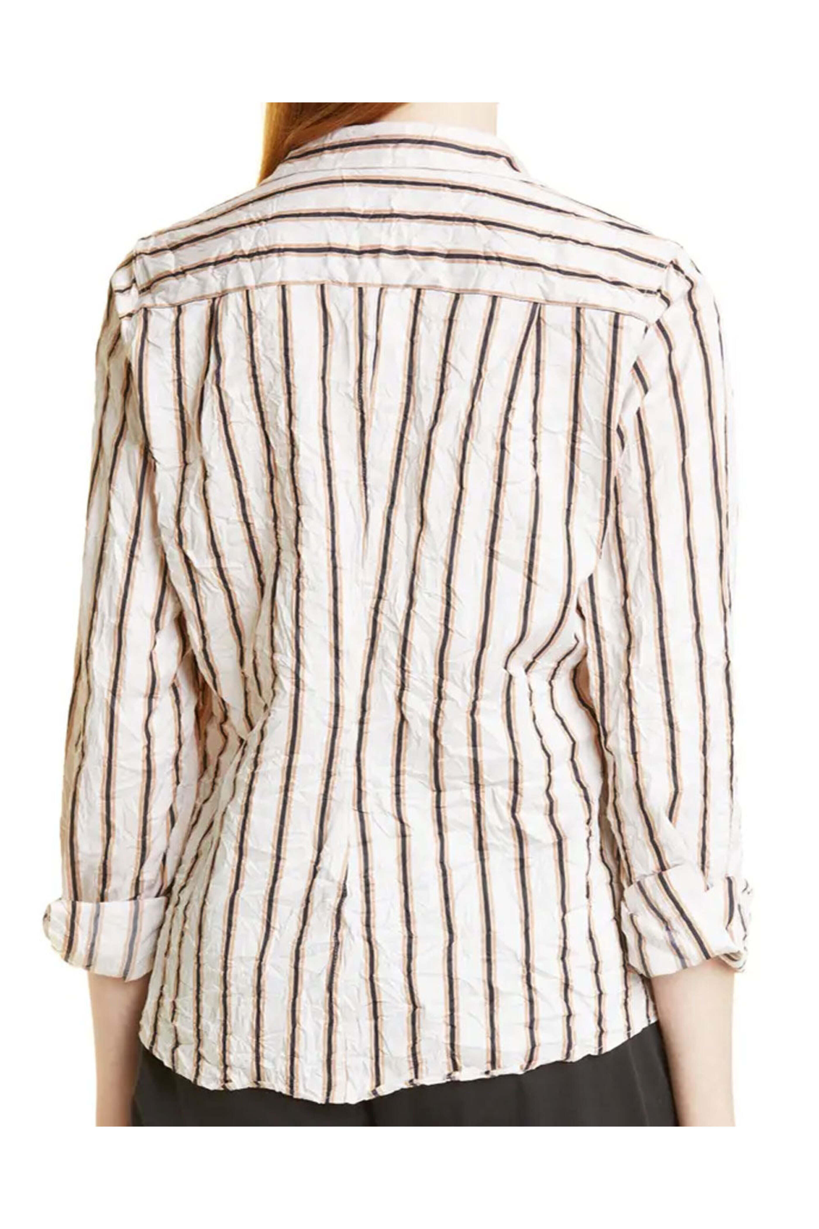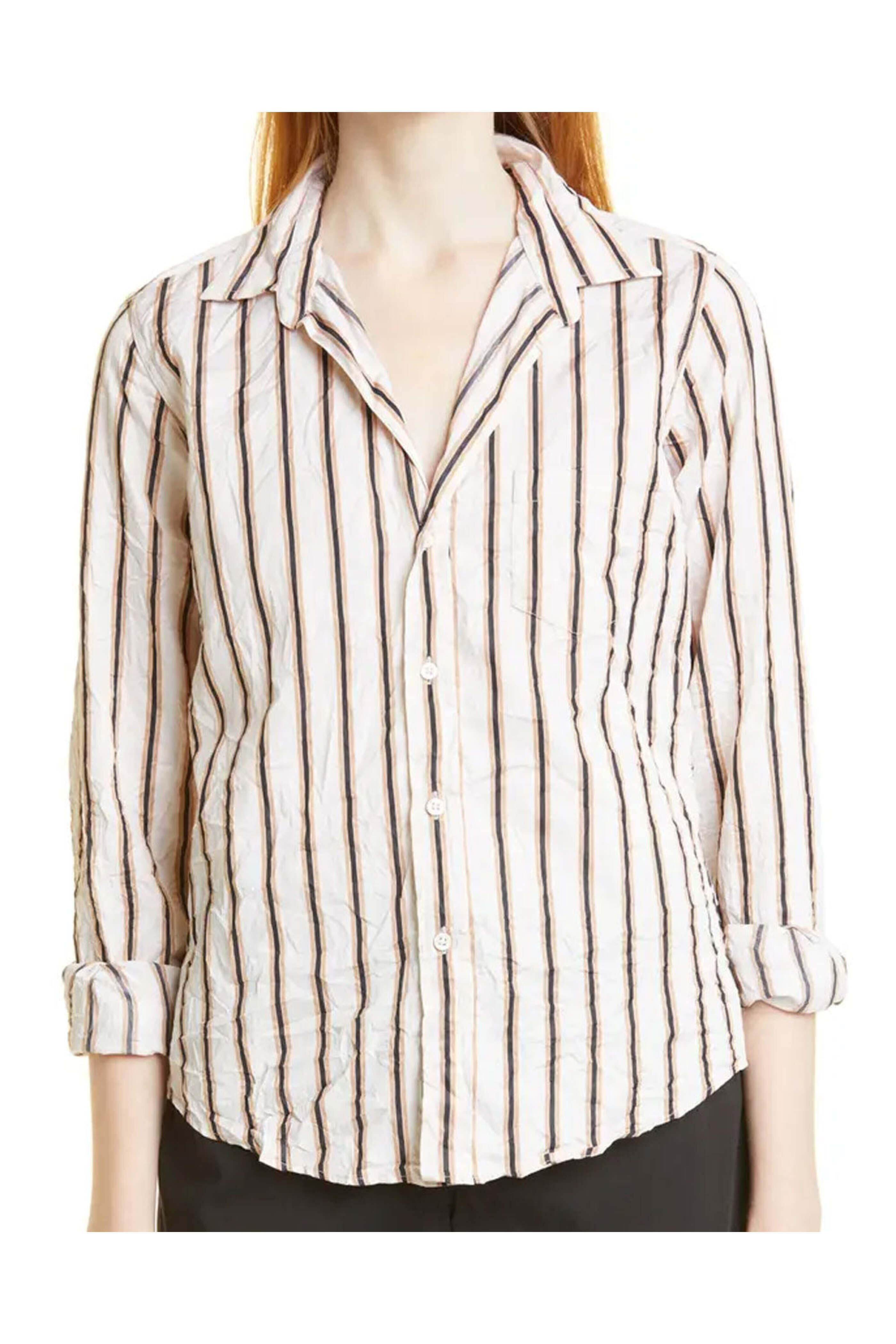 Frank & Eileen Camel Stripe Barry Button Up Shirt. Collared. Long sleeves; button cuffs. V neck; button up front closure. Single front chest pocket. Relaxed fit. Crinkle cotton fabrication. 100% cotton.