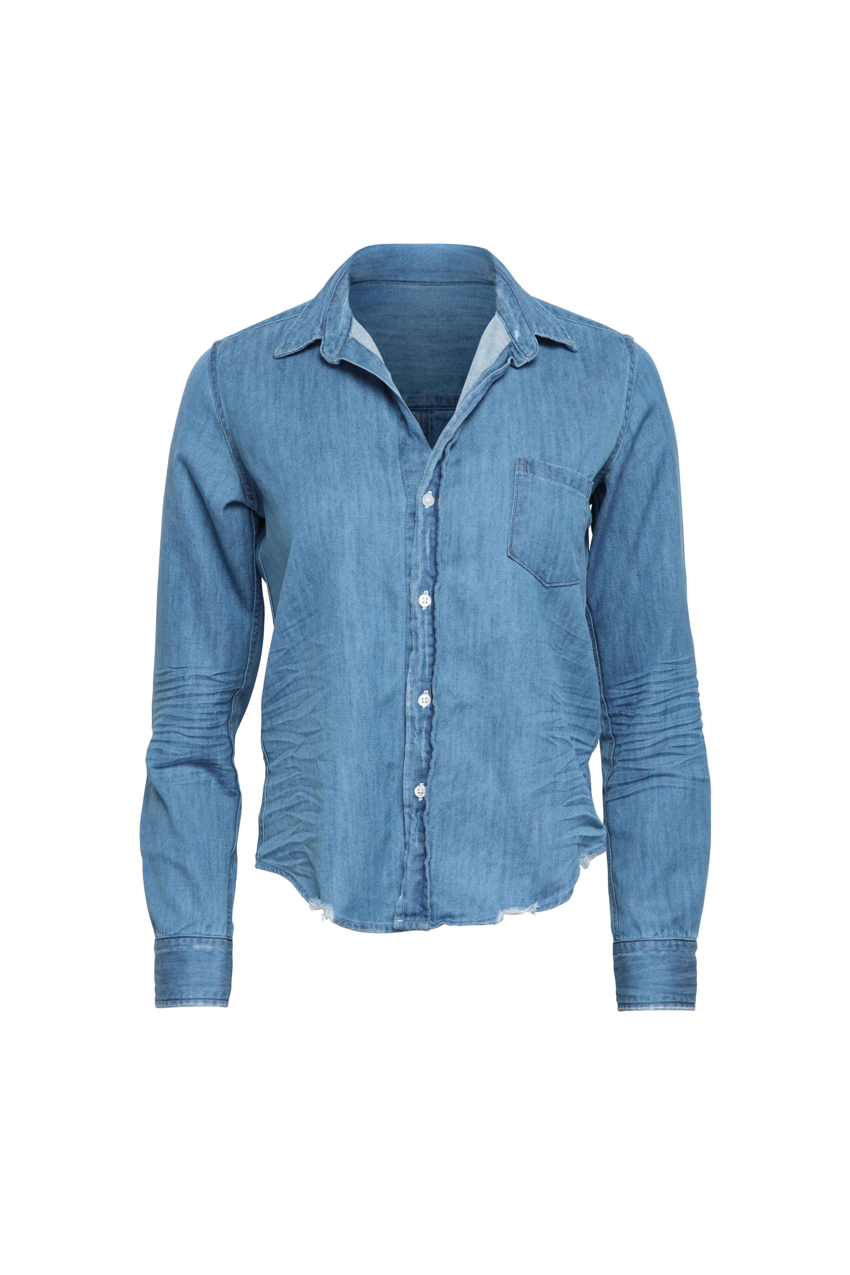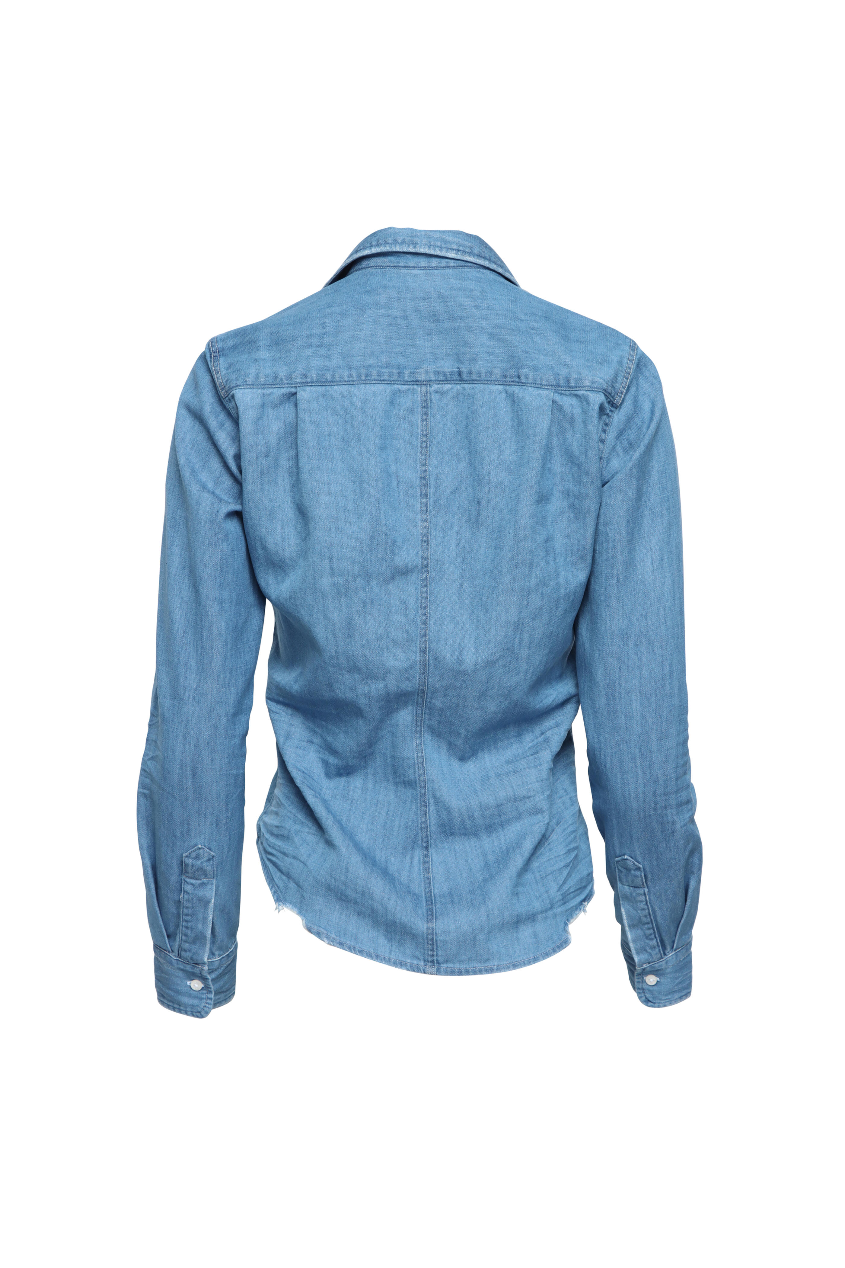 Collar. V neck. Long sleeves; button cuffs. Button front closure. Single chest patch pocket. Tailored fit. Denim fabrication. Made in USA. 100% cotton. Machine washable.