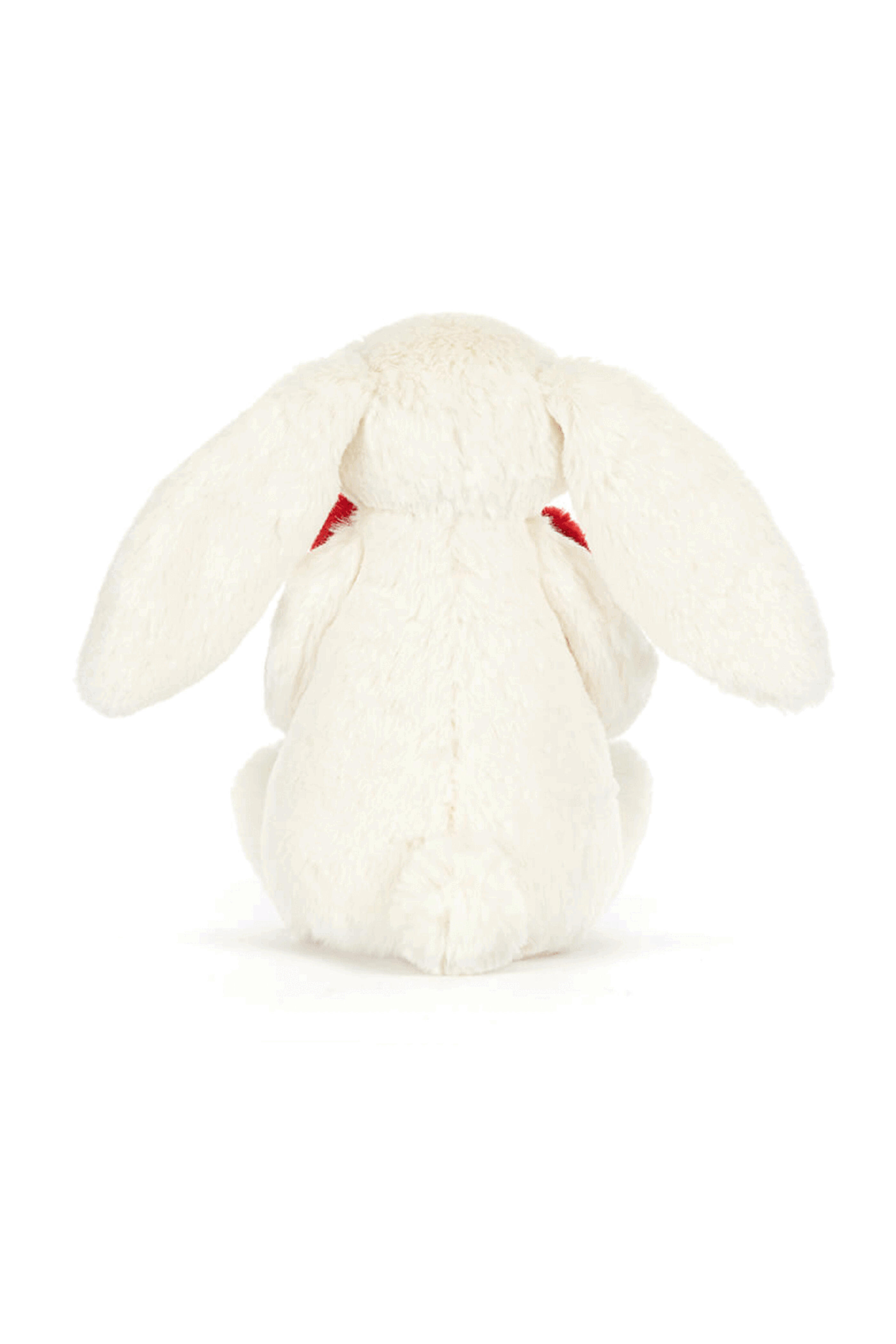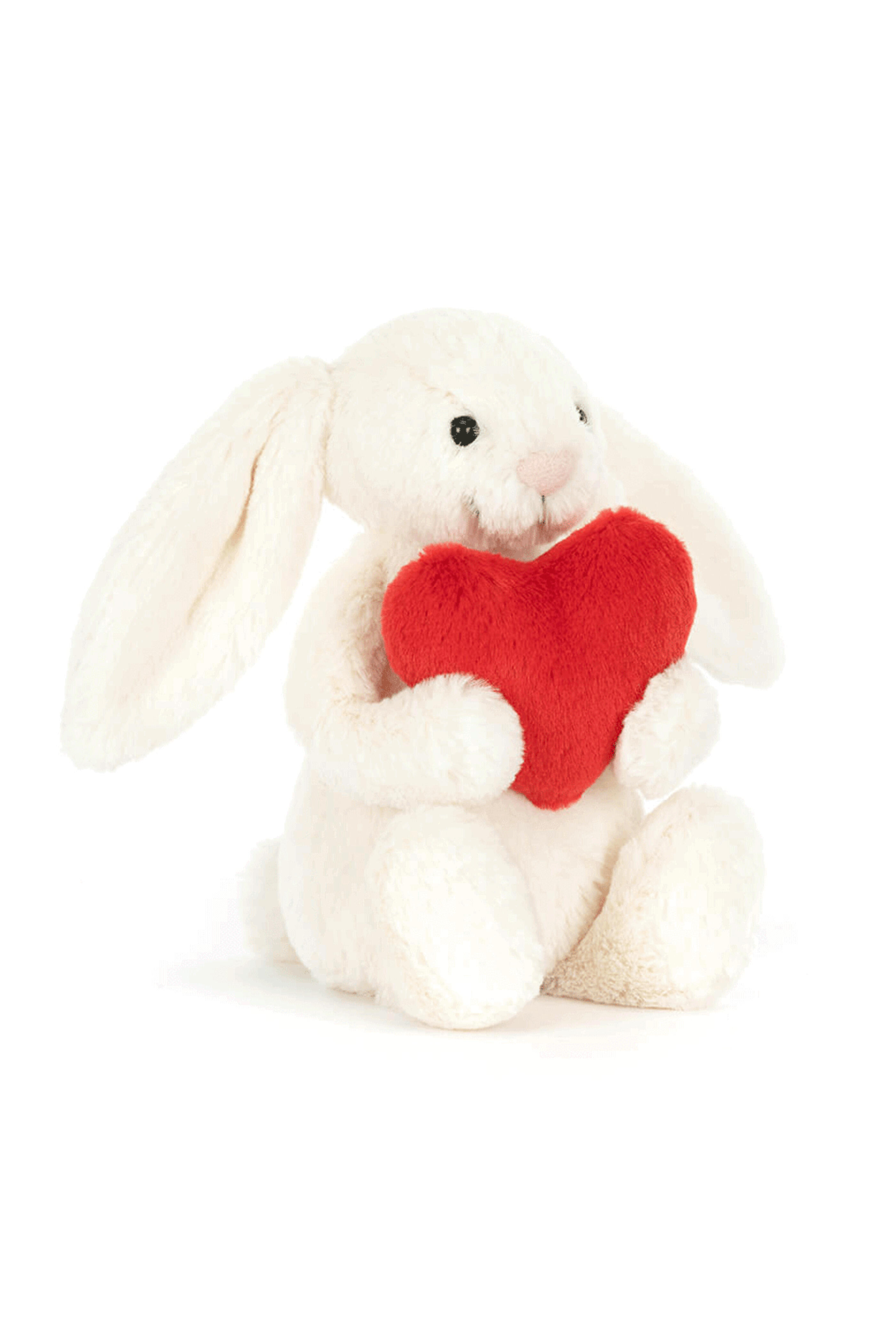 Jellycat Bashful Red Love Heart Bunny. Dimensions: 12.2in x 4.7in x 3.5in. Sitting Height: 9in. Main Materials: Polyester. Inner Filling: Polyester Fibers, PE Beans. Hard Eye.