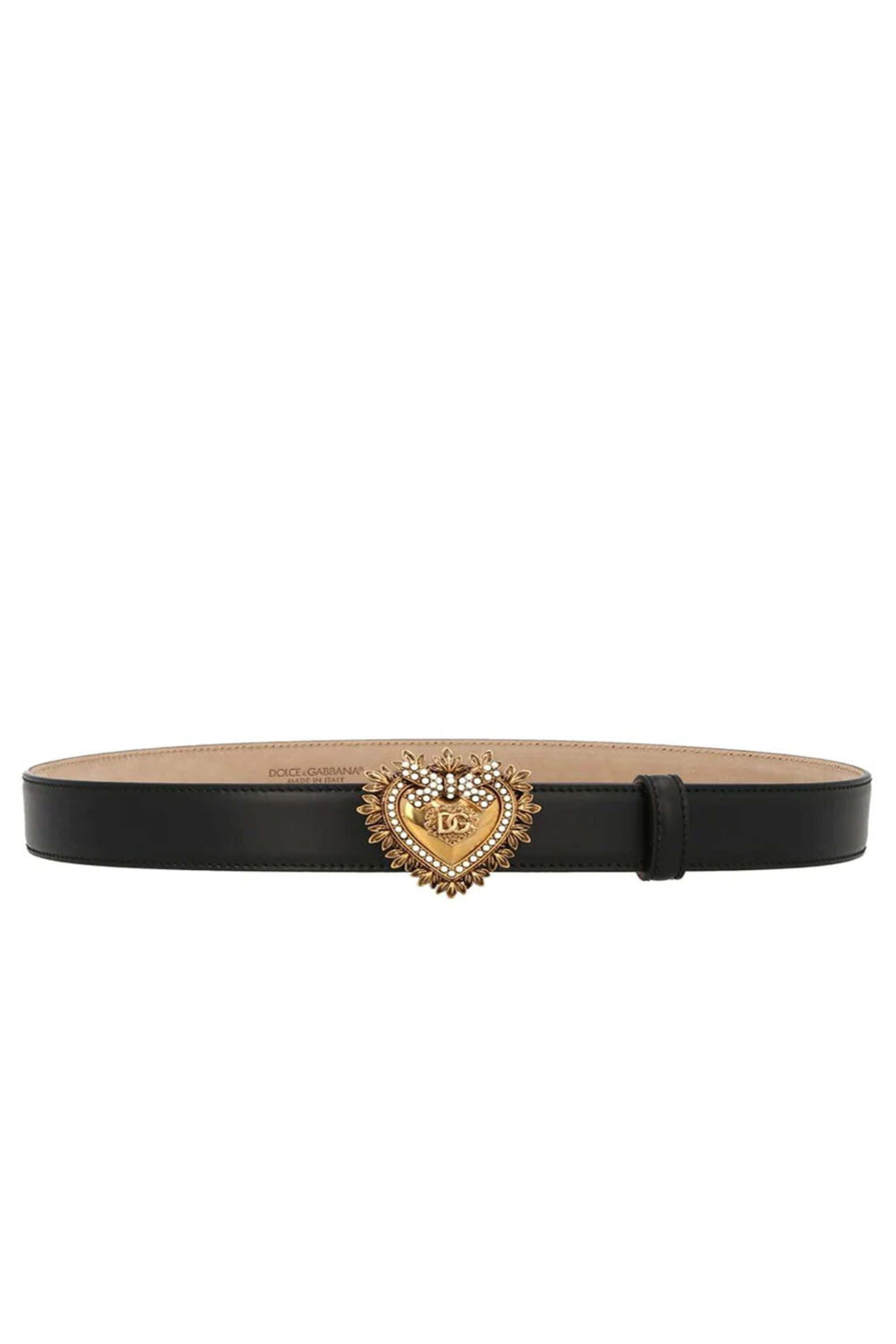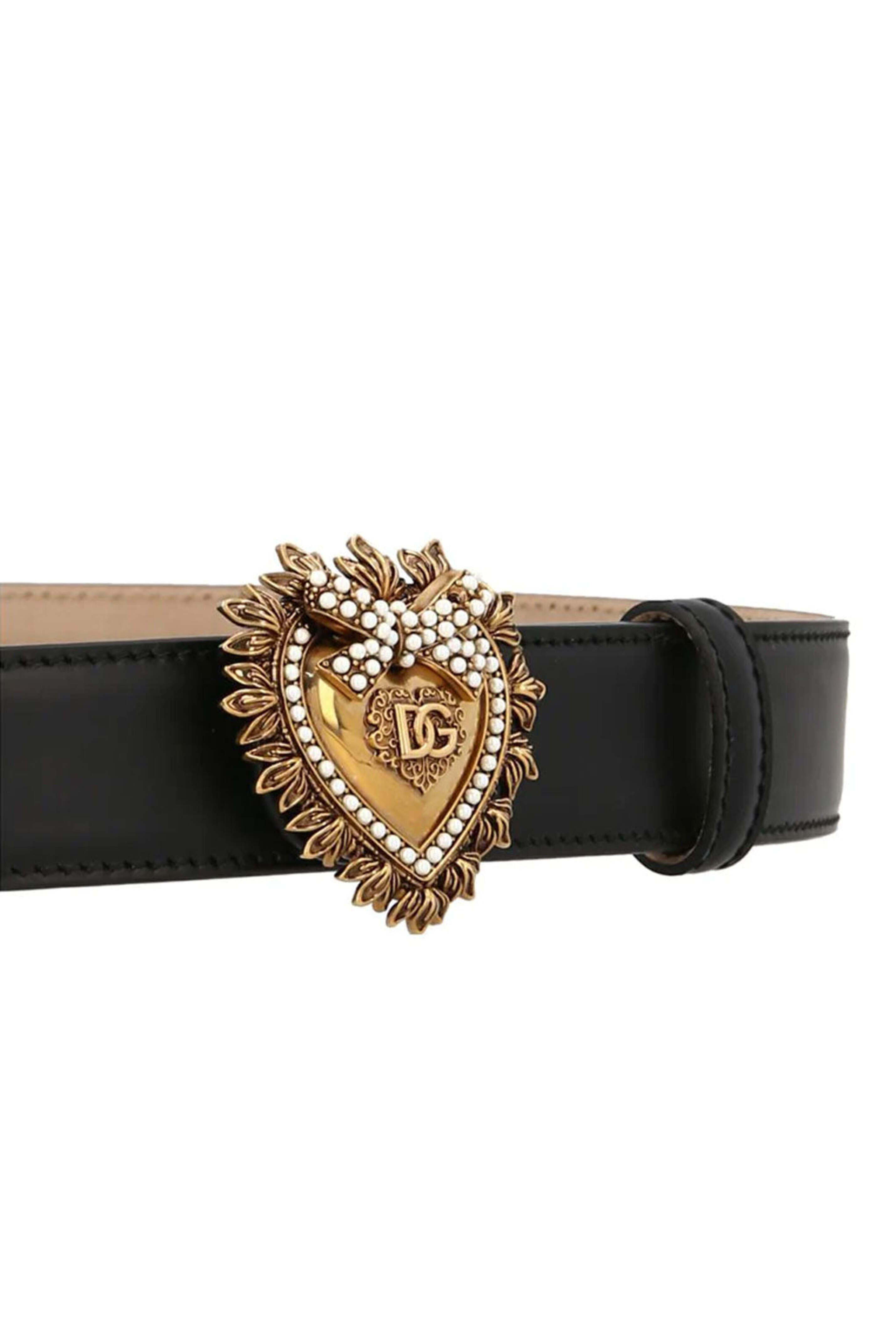 Dolce & Gabbana Devotion Belt in Black. Round tip. Gold-tone heart shape buckle with logo. Faux-pearl bow and engraved leaf trim. Adjustable. Waist and hip belt. Leather outer and lining. 25W. Made in Italy.