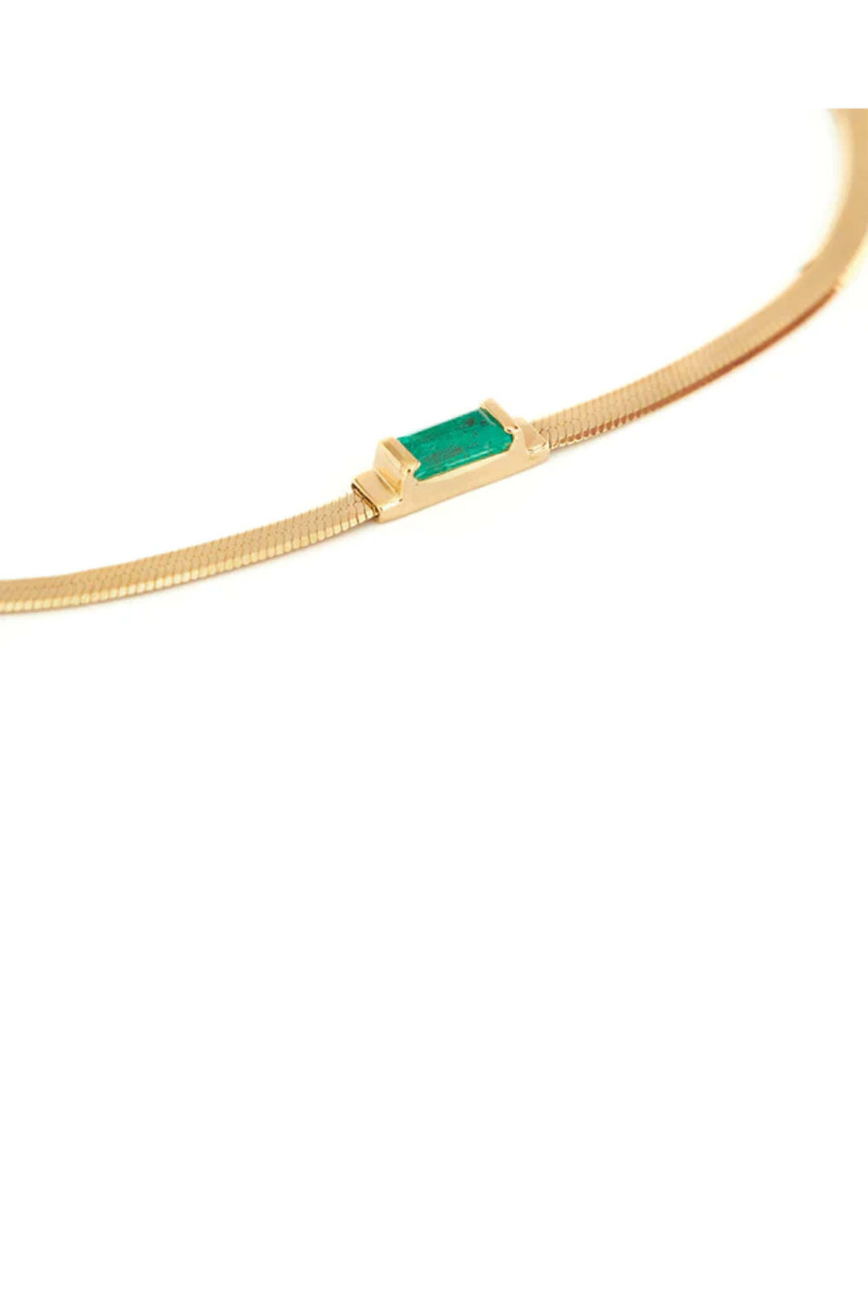 Yi Collection Emerald Herringbone Bracelet. 18k yellow gold. Emerald. Snake chain. Petite baguette emerald at the center. 5.5 7.5 L. Lobster claw clasp. Handmade in Thailand.