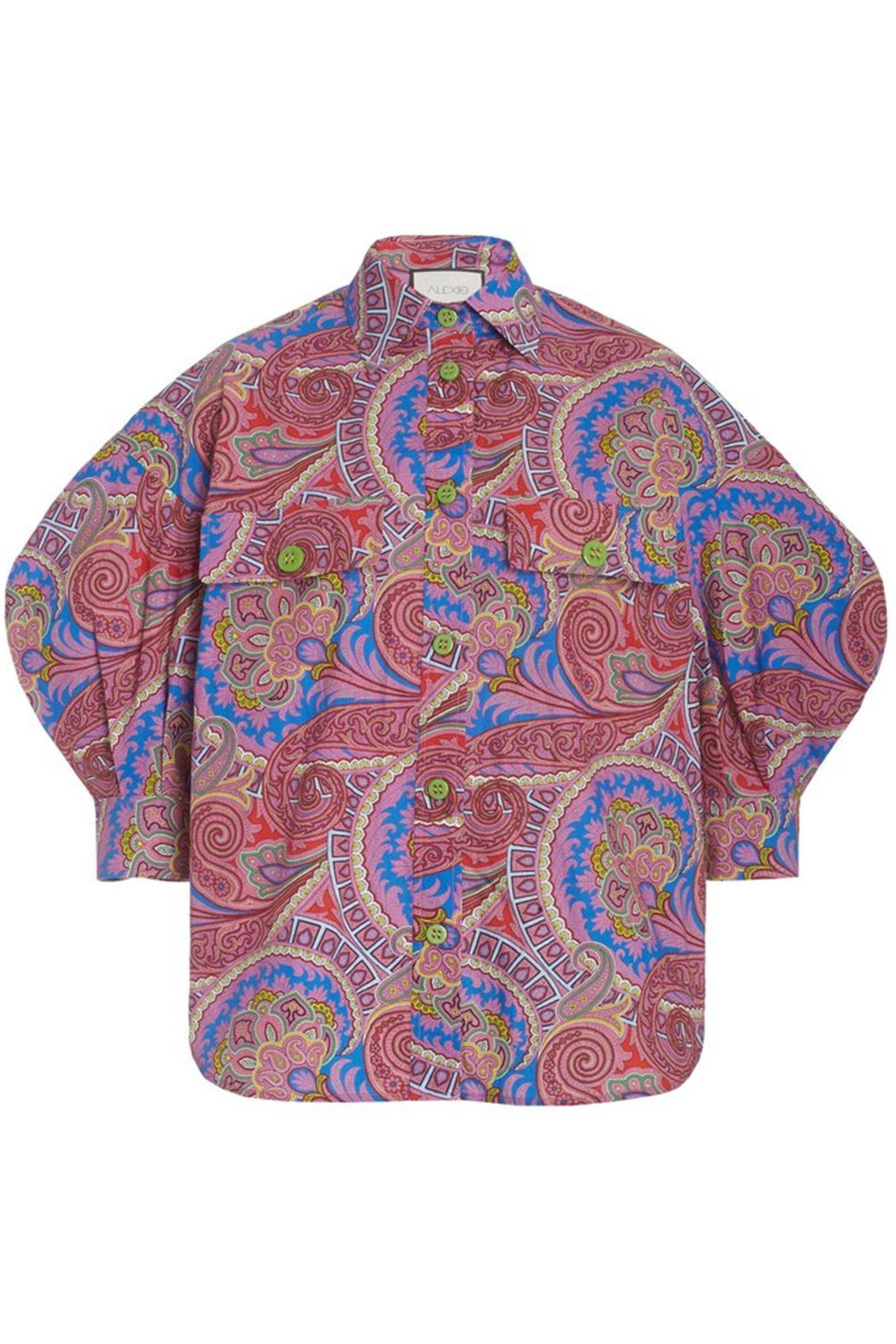 Alexis Berry Paisley Berwyn Button Up Shirt. Collared. Elbow length puff sleeves; button cuffs. Button down front closure. Flap chest pockets; button closure. Relaxed fit. Lined. 100% cotton outer, 100% charmeuse lining.